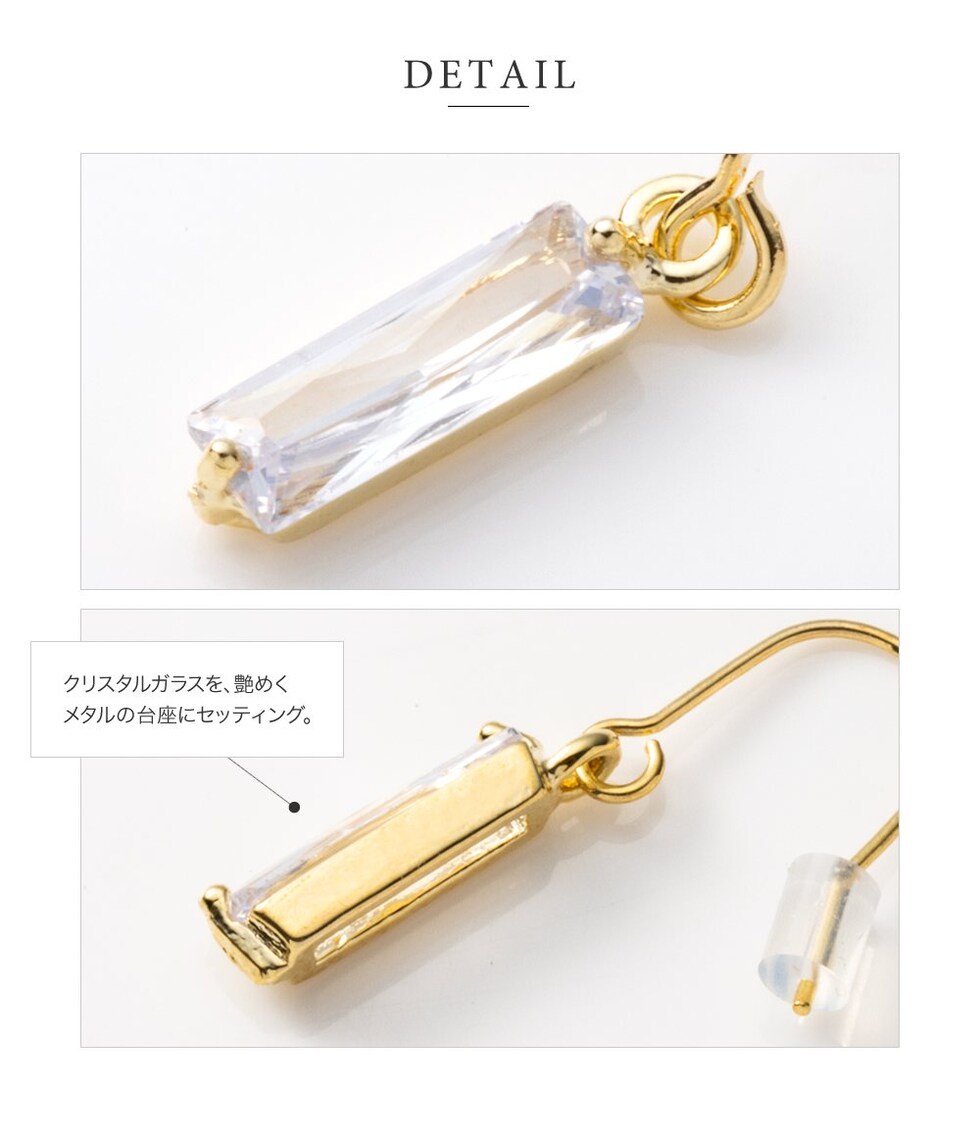 モダンなエレガンスをイメージした大粒スクエアクリスタルガラスは、さりげなくおしゃれな仕上がりで、どんなワードローブにも合わせやすい。石部分の爪留めは、クリアな煌めきを一層引き立ててくれます。