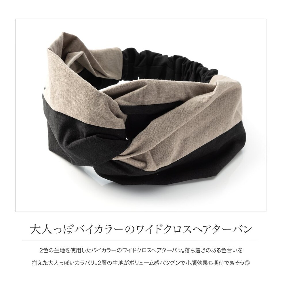 2色の生地を使用したバイカラーのワイドクロスヘアターバン。落ち着きのある色合いを揃えた大人っぽいカラバリ。2層の生地がボリューム感バツグンで小顔効果も期待できそう◎