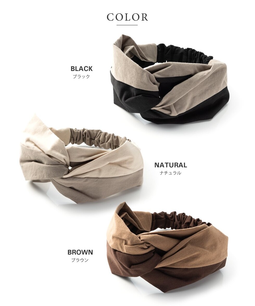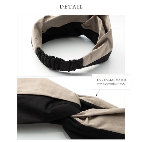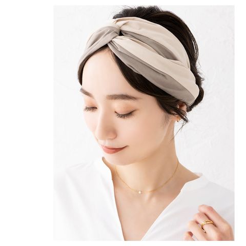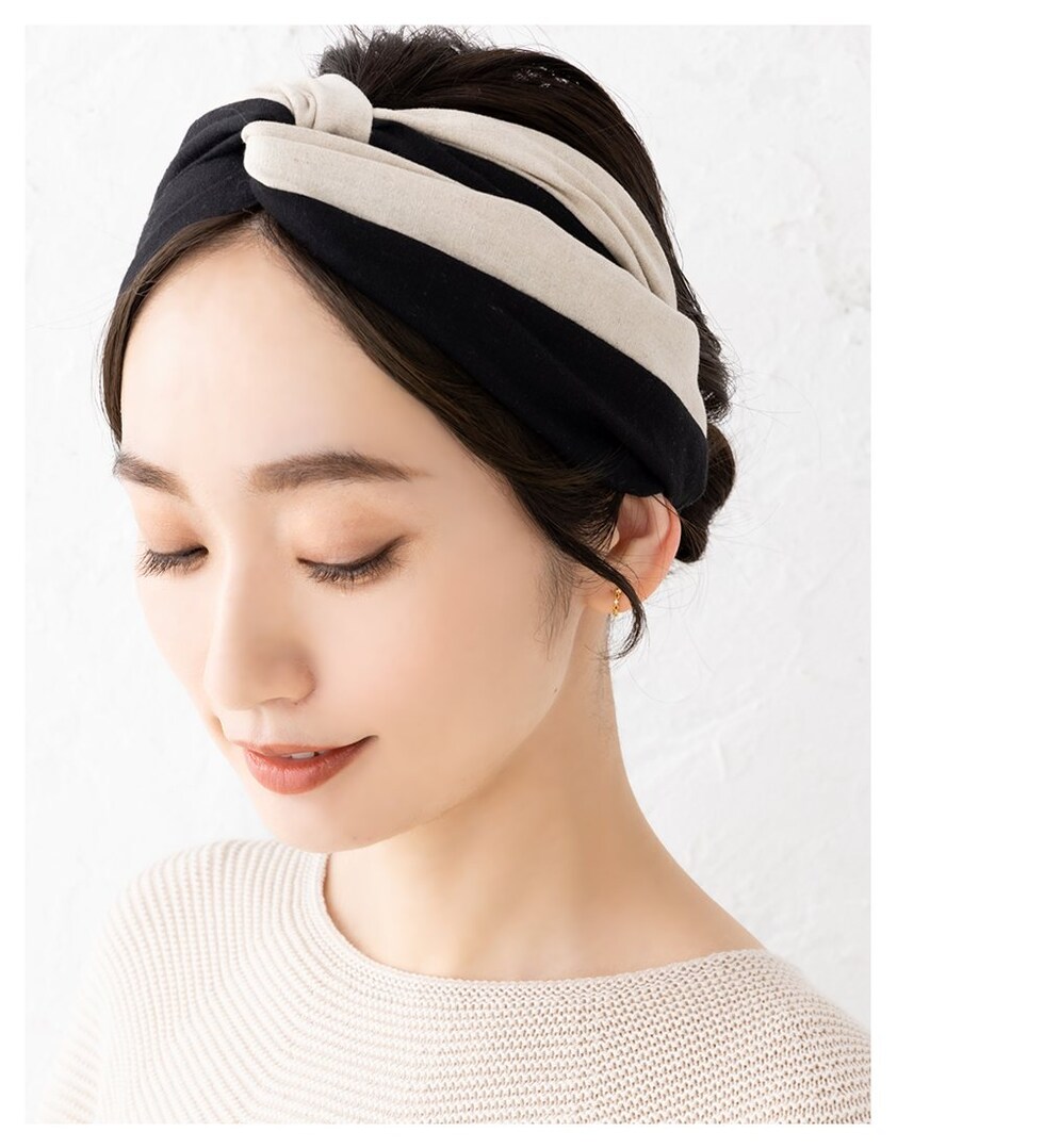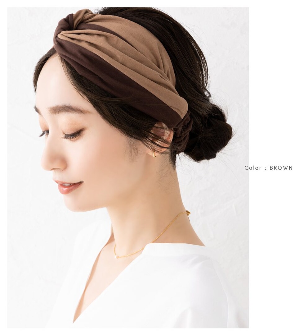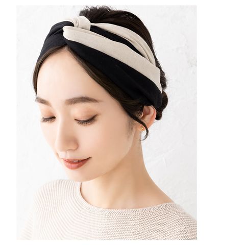 バイカラーが目を惹くヘアターバン。落ち着いた色味のみの展開で黒髪にも明るい髪にも自然にマッチ。髪型が決まらない時にも重宝するアイテムです。