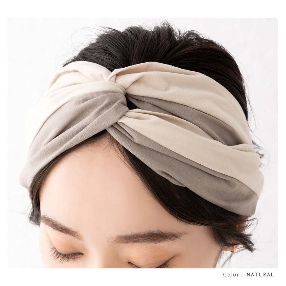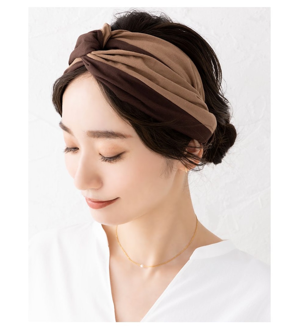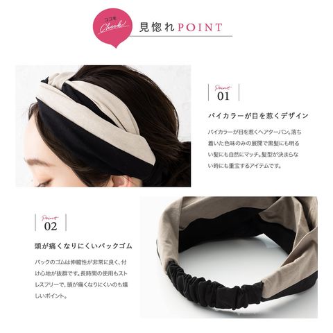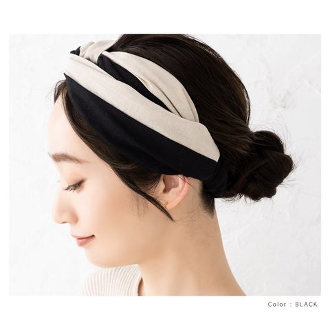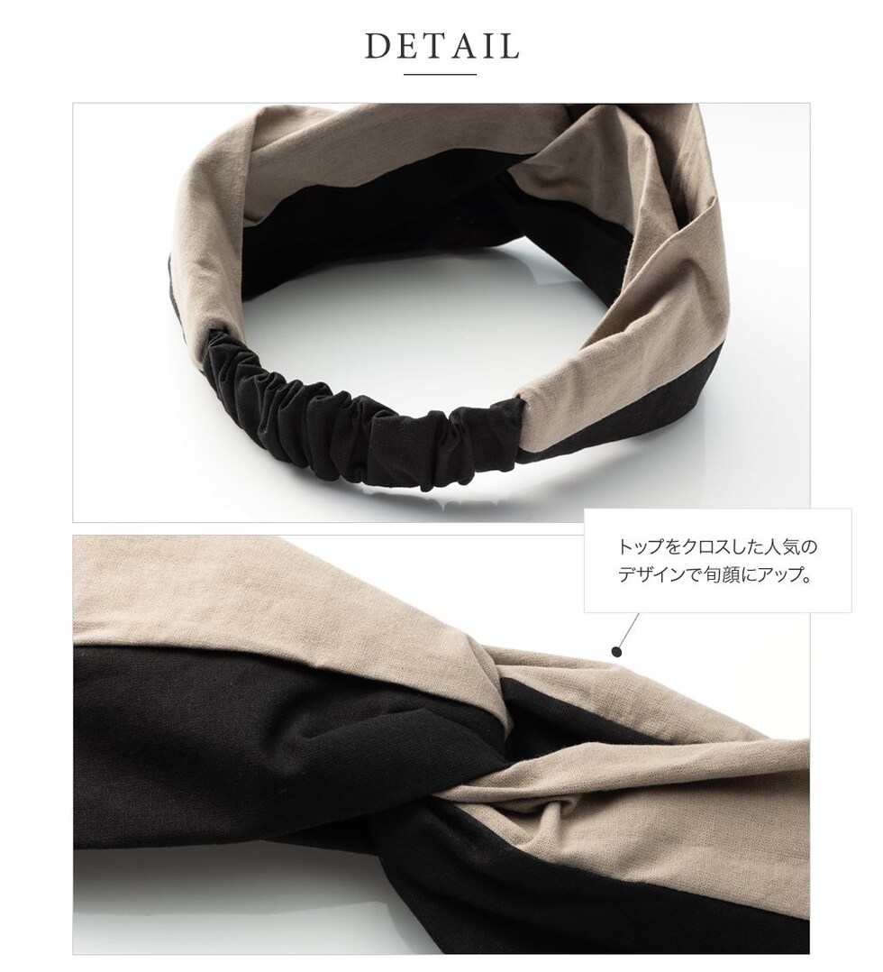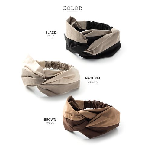 バイカラーが目を惹くヘアターバン。落ち着いた色味のみの展開で黒髪にも明るい髪にも自然にマッチ。髪型が決まらない時にも重宝するアイテムです。
