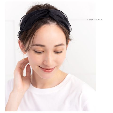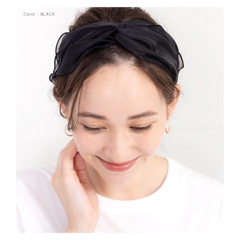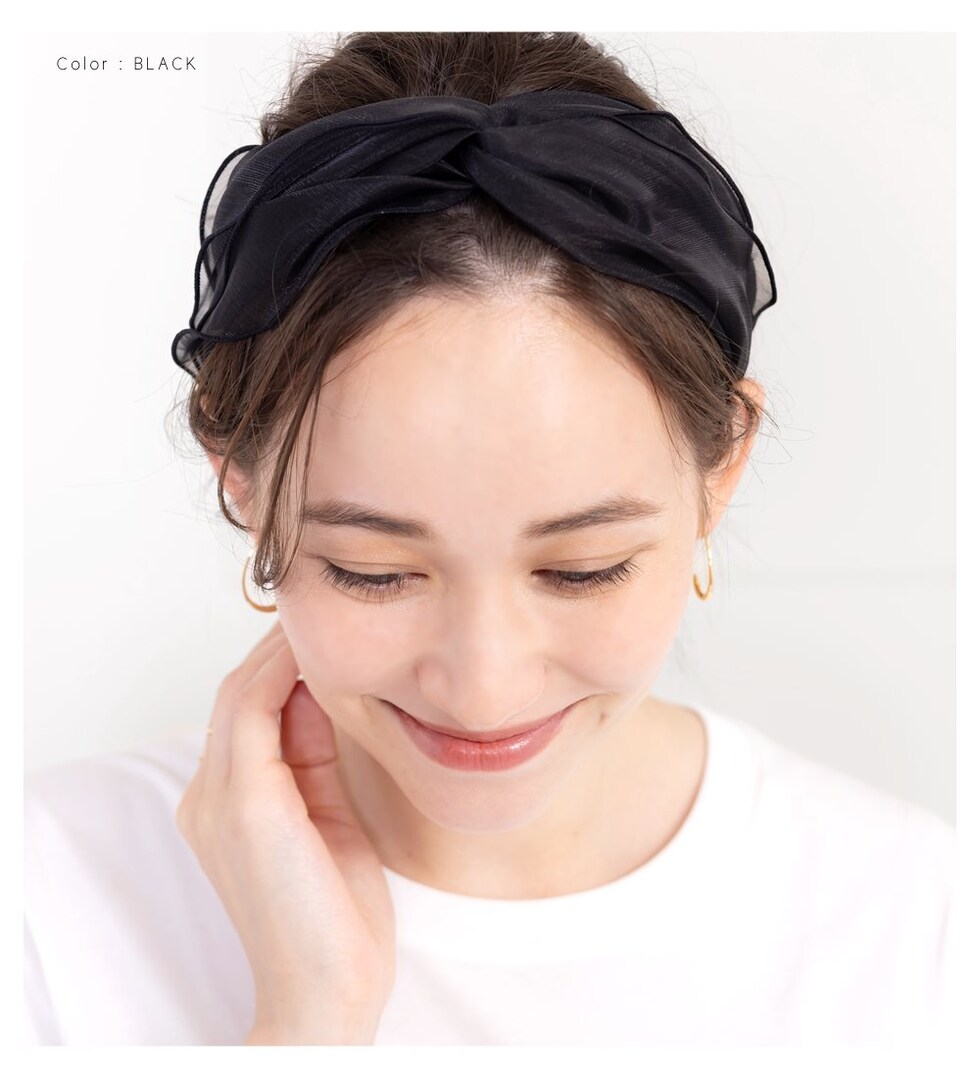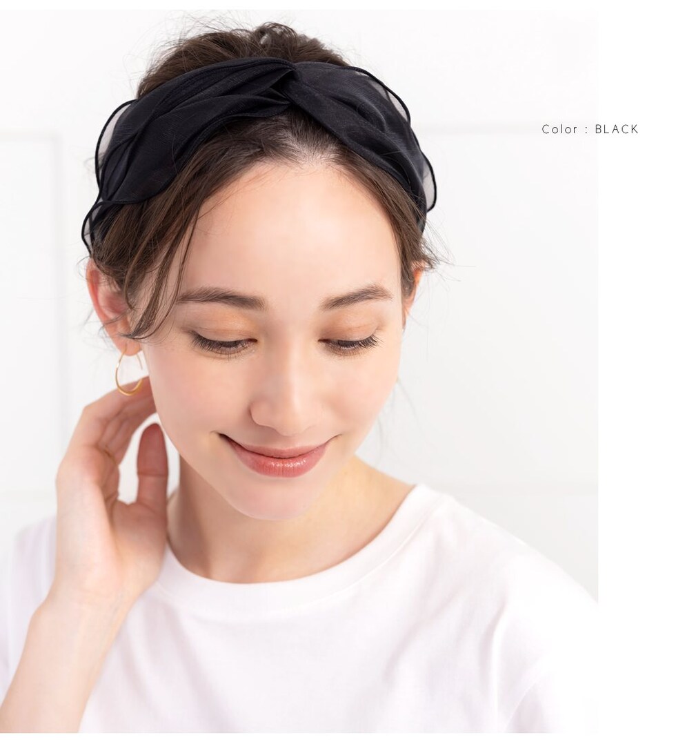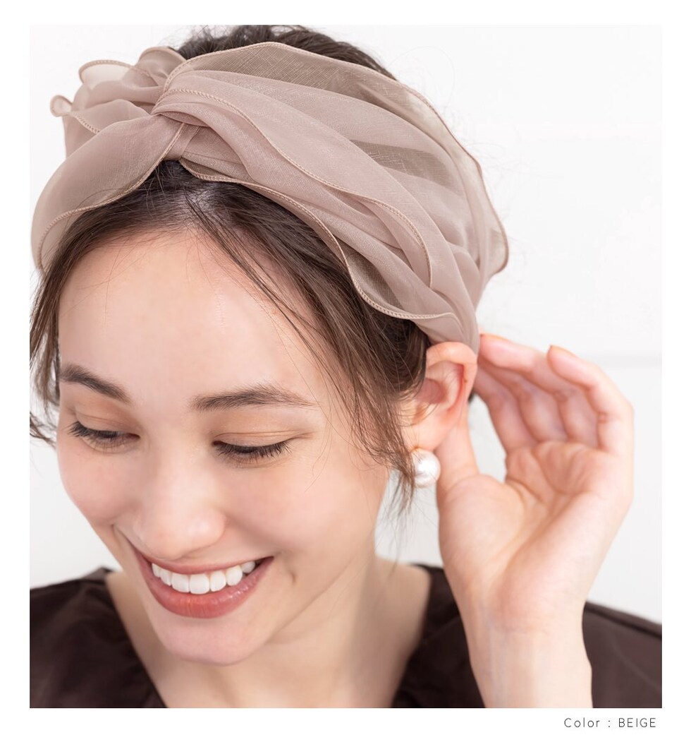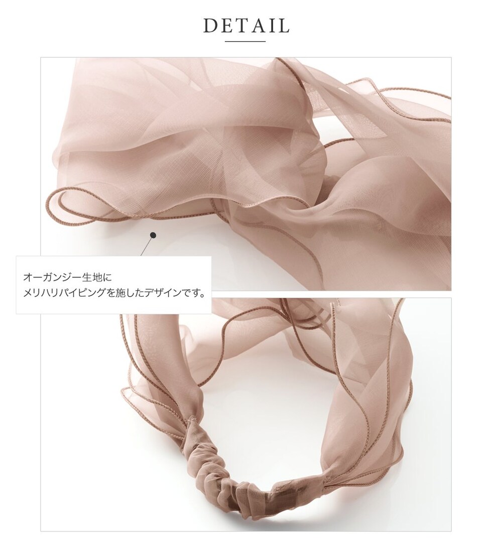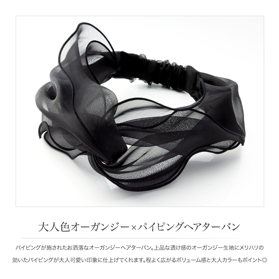 パイピングが施されたお洒落なオーガンジーヘアターバン。上品な透け感のオーガンジー生地にメリハリの効いたパイピングが大人可愛い印象に仕上げてくれます。程よく広がるボリューム感と大人カラーもポイント◎