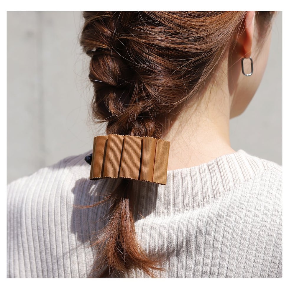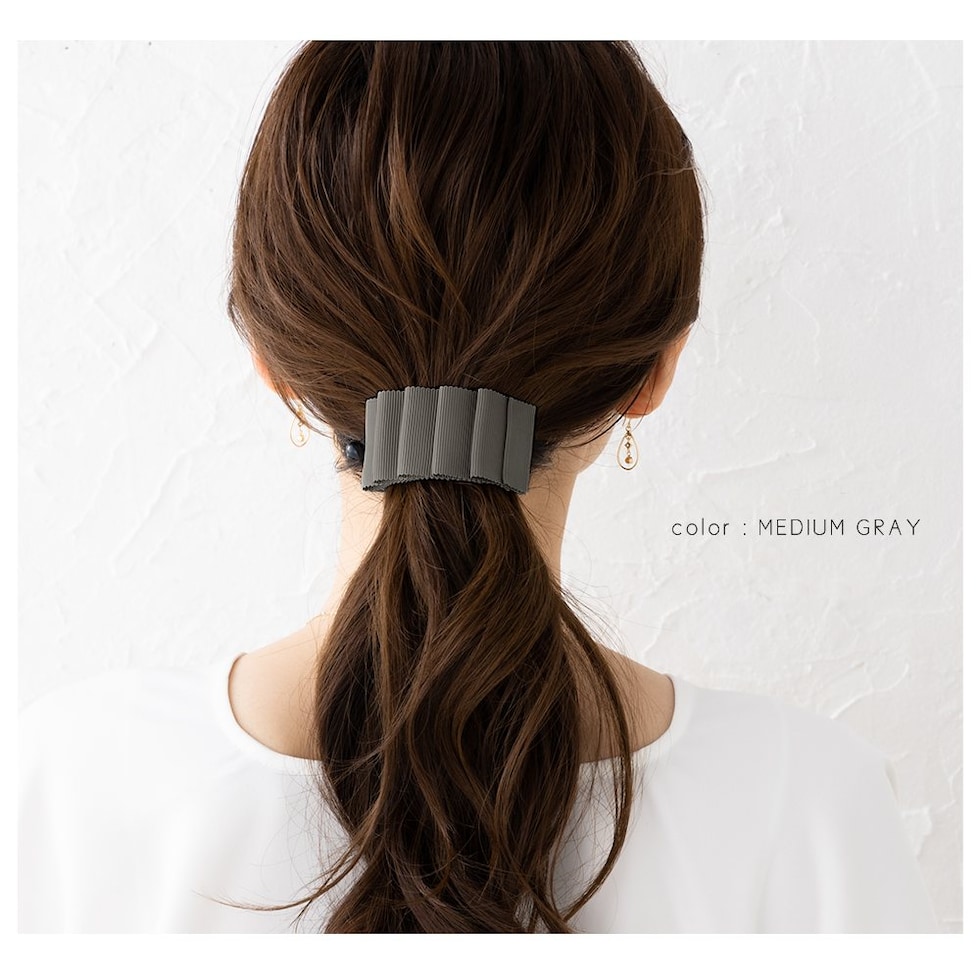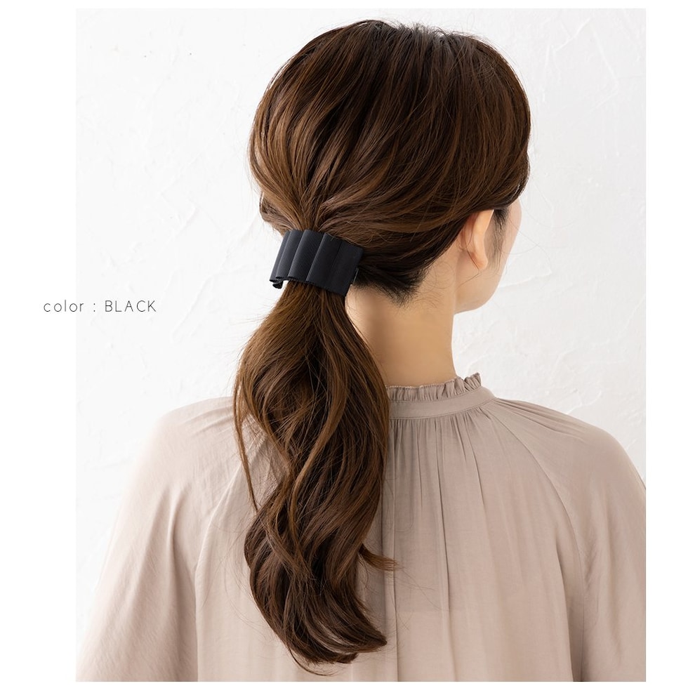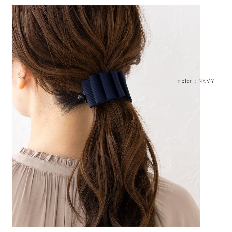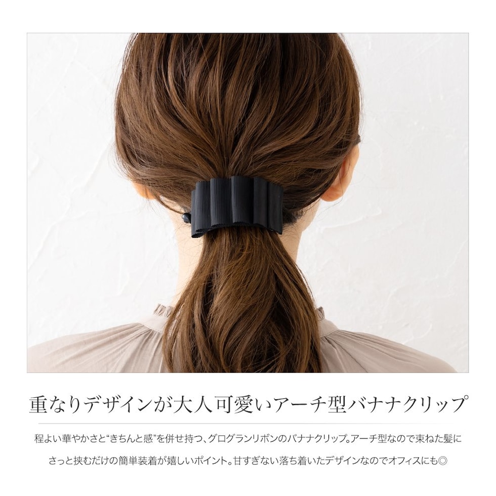 程よい華やかさと“きちんと感”を併せ持つ、グログランリボンのバナナクリップ。アーチ型なので束ねた髪にさっと挟むだけの簡単装着が嬉しいポイント。甘すぎない落ち着いたデザインなのでオフィスにも◎