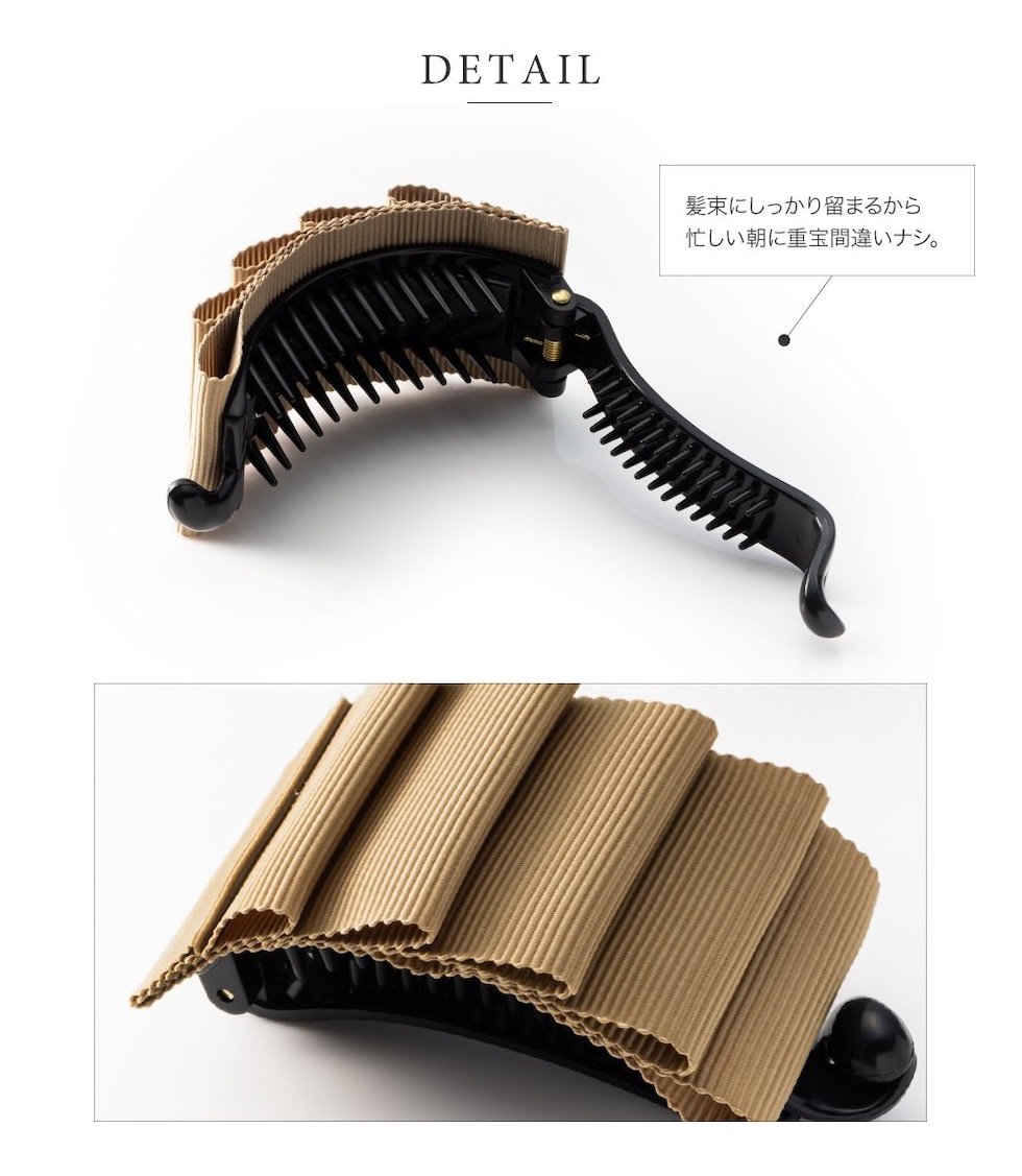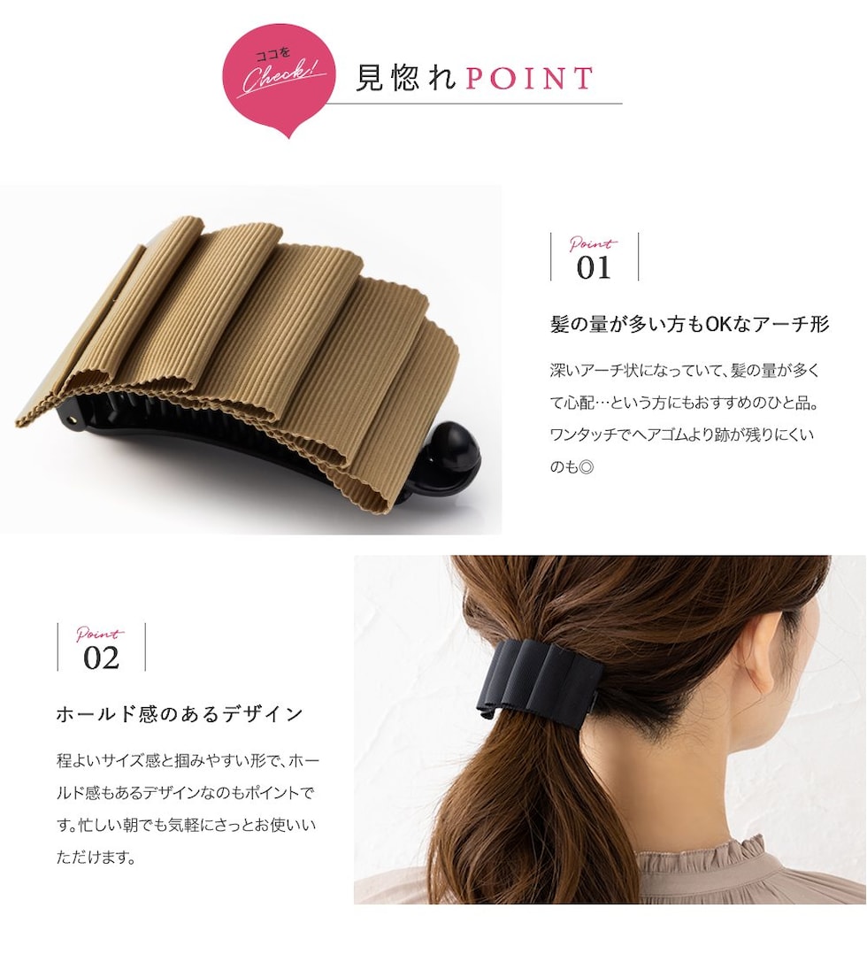 深いアーチ状になっていて、髪の量が多くて心配…という方にもおすすめのひと品。ワンタッチでヘアゴムより跡が残りにくいのも◎