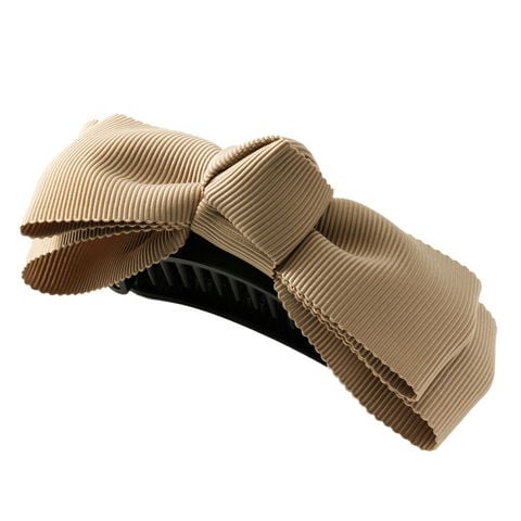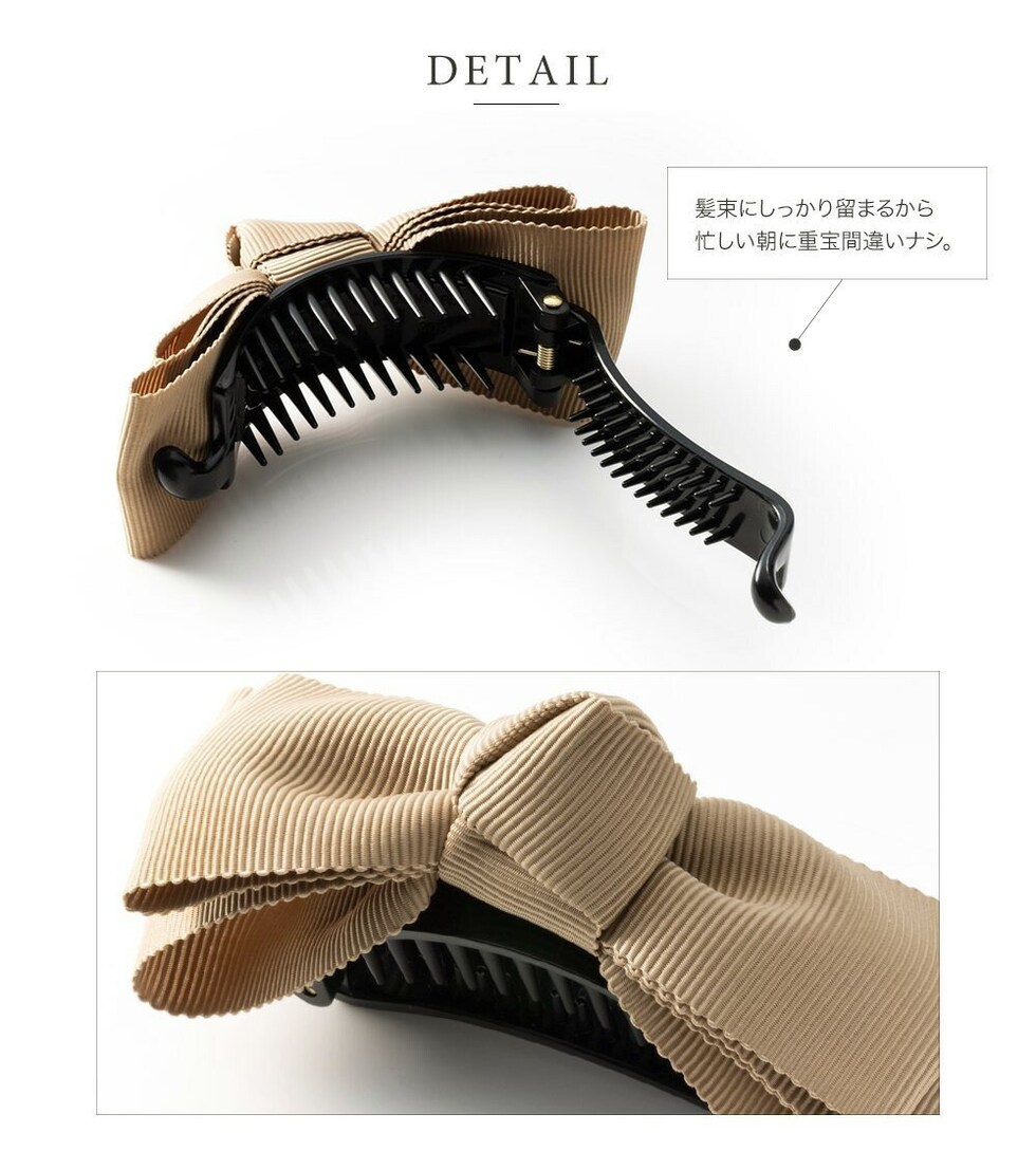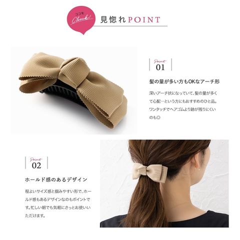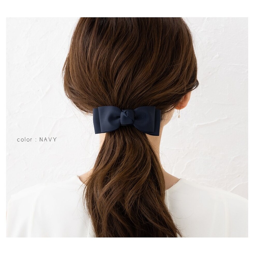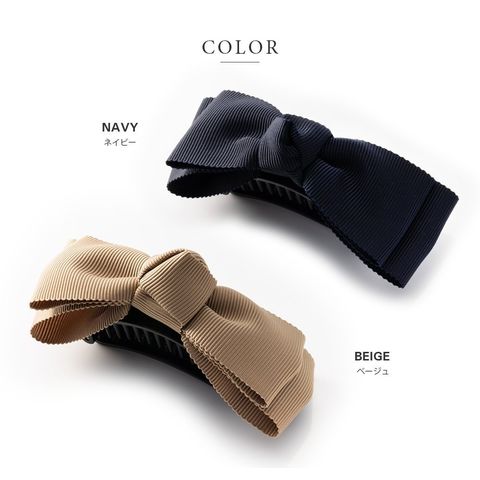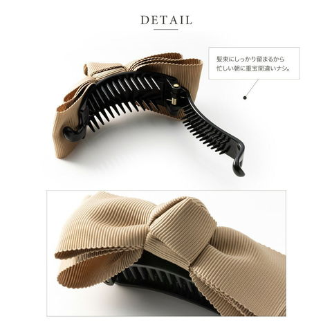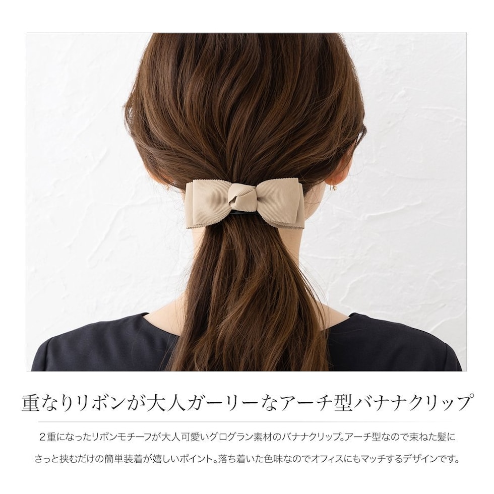 2重になったリボンモチーフが大人可愛いグログラン素材のバナナクリップ。アーチ型なので束ねた髪にさっと挟むだけの簡単装着が嬉しいポイント。落ち着いた色味なのでオフィスにもマッチするデザインです。