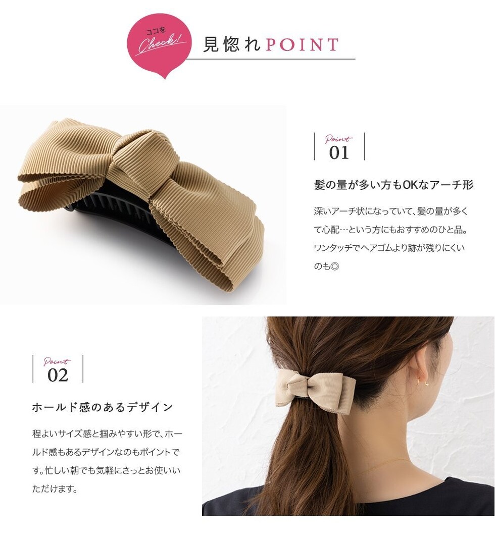 深いアーチ状になっていて、髪の量が多くて心配…という方にもおすすめのひと品。ワンタッチでヘアゴムより跡が残りにくいのも◎