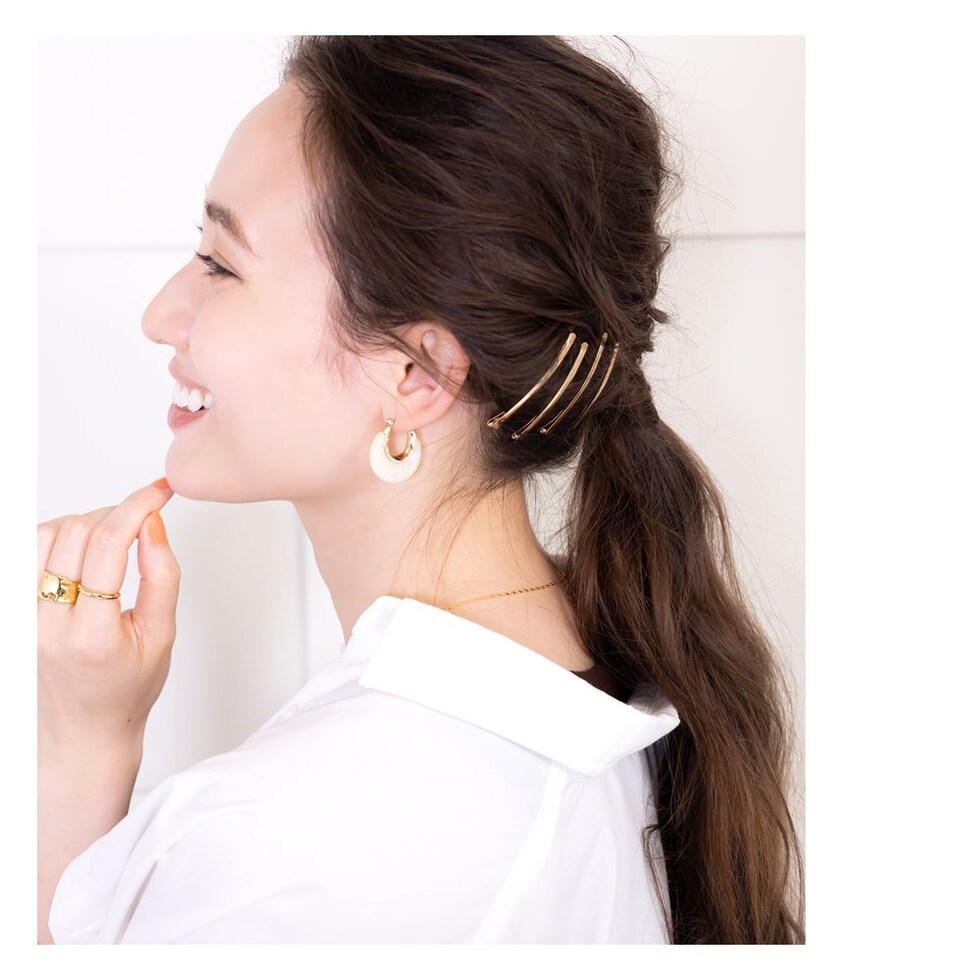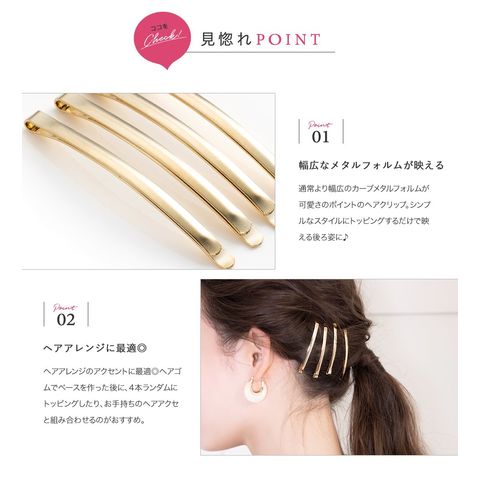 通常より幅広のカーブメタルフォルムが可愛さのポイントのヘアクリップ。シンプルなスタイルにトッピングするだけで映える後ろ姿に♪