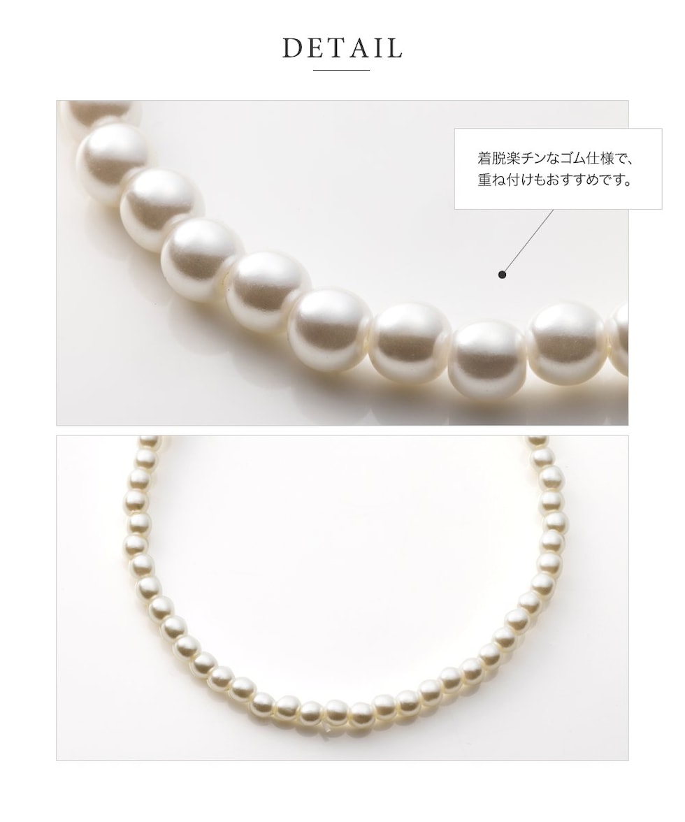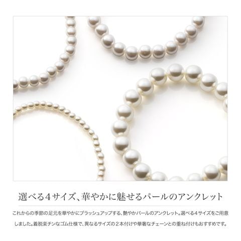 これからの季節の足元を華やかにブラッシュアップする、艶やかパールのアンクレット。選べる4サイズをご用意しました。着脱楽チンなゴム仕様で、異なるサイズの2本付けや華奢なチェーンとの重ね付けもおすすめです。