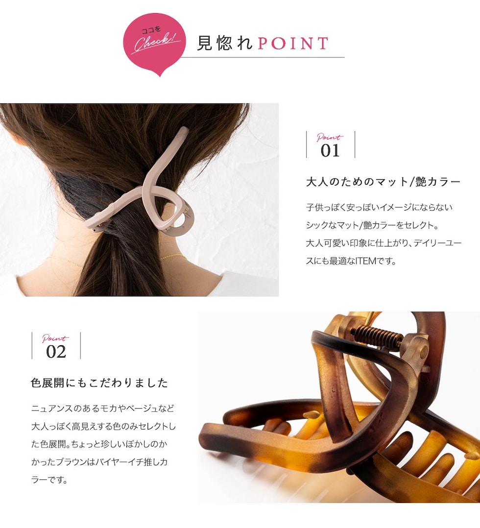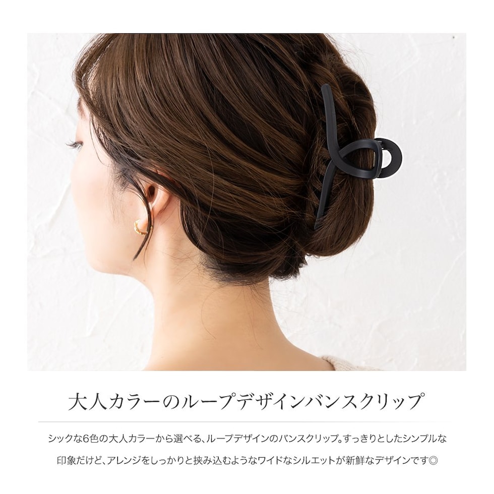 シックな6色の大人カラーから選べる、ループデザインのバンスクリップ。すっきりとしたシンプルな印象だけど、アレンジをしっかりと挟み込むようなワイドなシルエットが新鮮なデザインです◎