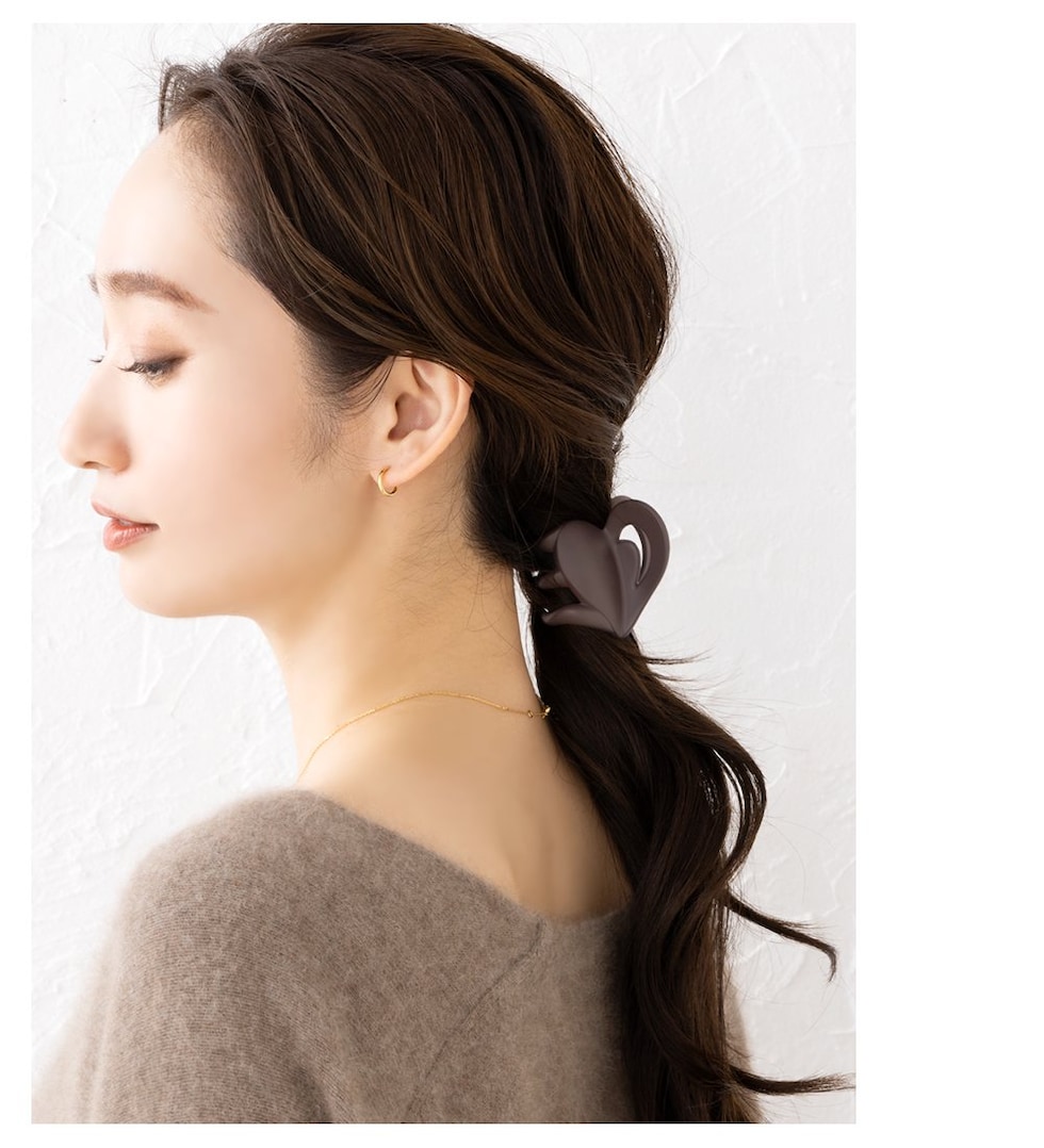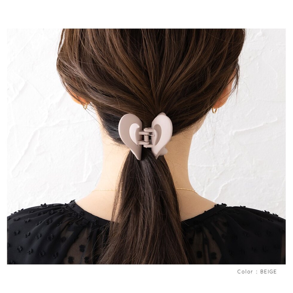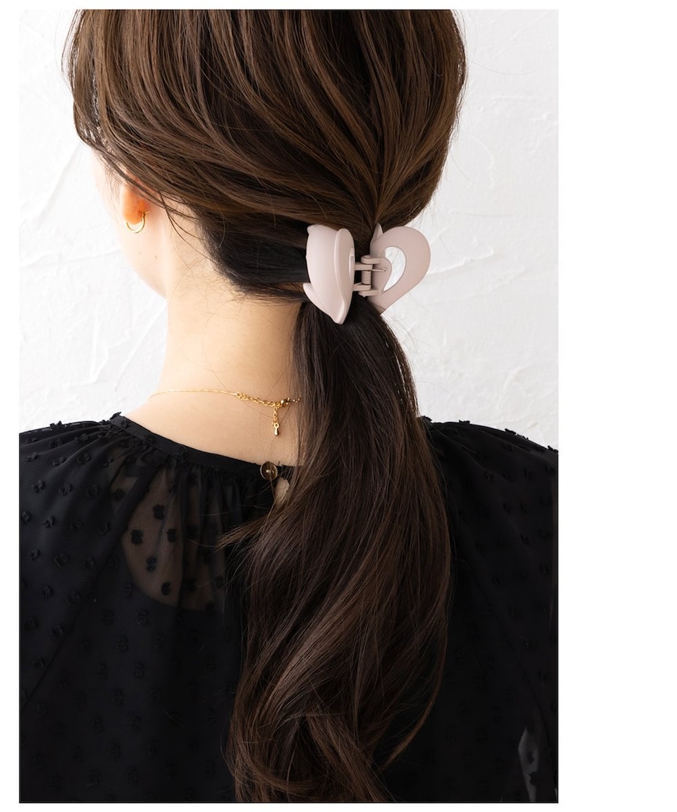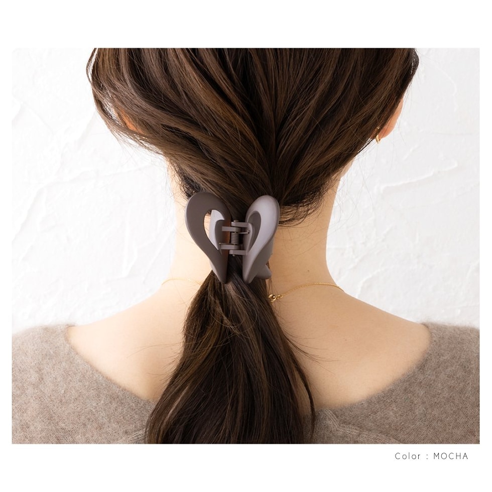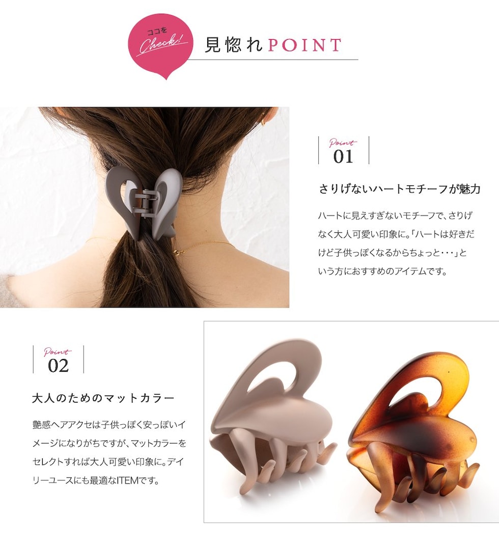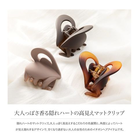 隠れハートのマットクリップ。大人っぽく高見えするこだわりの色展開と、角度によってハートが見え隠れするデザインで、甘くなり過ぎない大人の女性のためのイチオシヘアアイテムです。