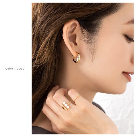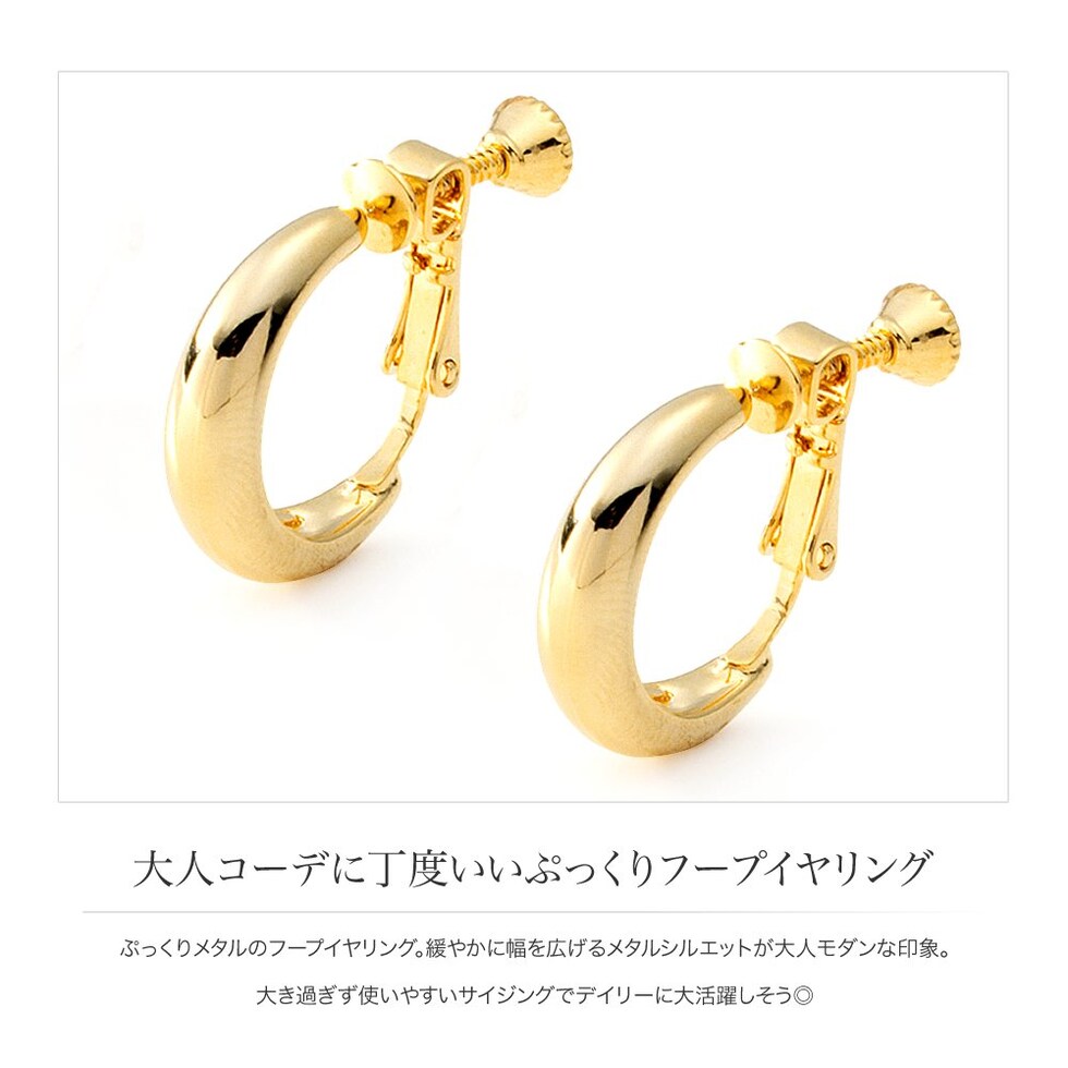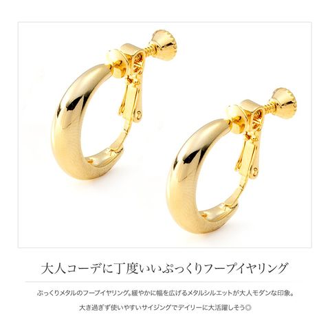 ぷっくりメタルのフープイヤリング。緩やかに幅を広げるメタルシルエットが大人モダンな印象。大き過ぎず使いやすいサイジングでデイリーに大活躍しそう◎