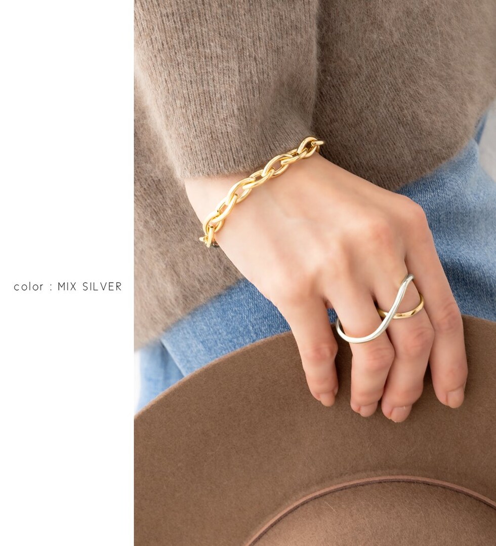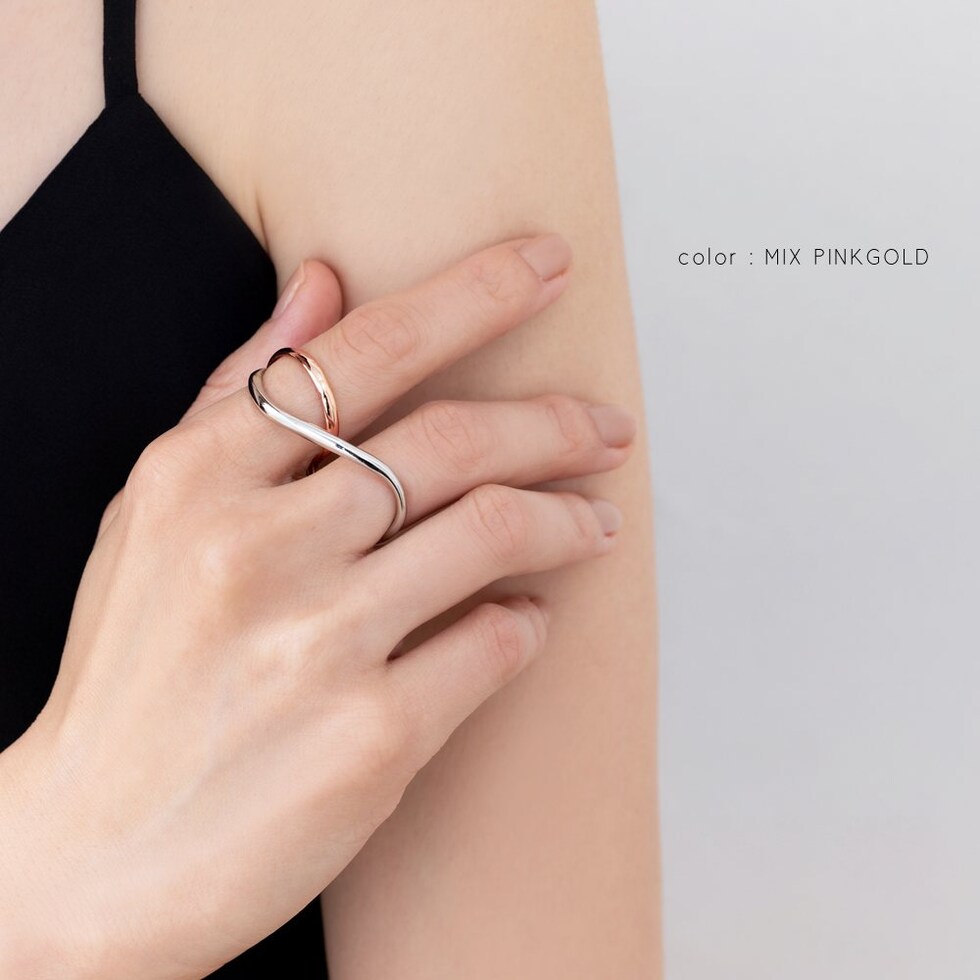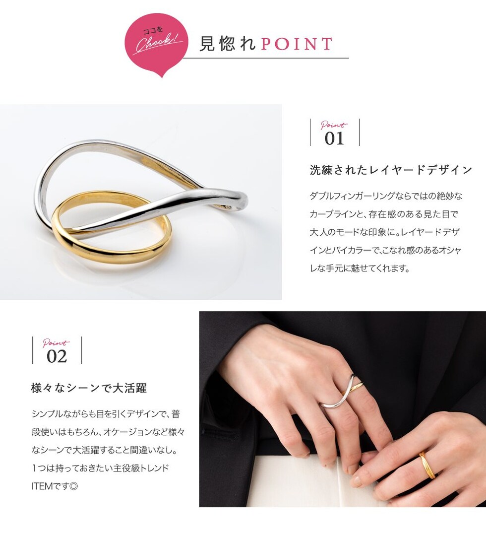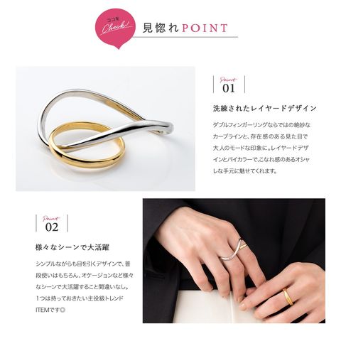 ダブルフィンガーリングならではの絶妙なカーブラインと、存在感のある見た目で大人のモードな印象に。レイヤードデザインとバイカラーで、こなれ感のあるオシャレな手元に魅せてくれます。