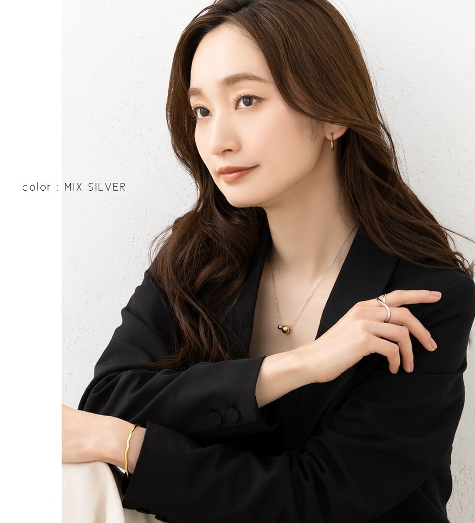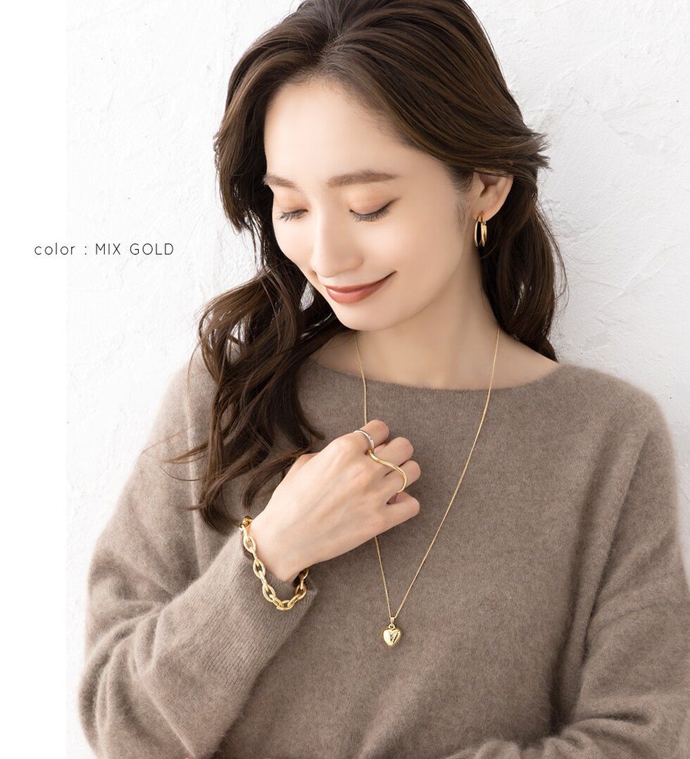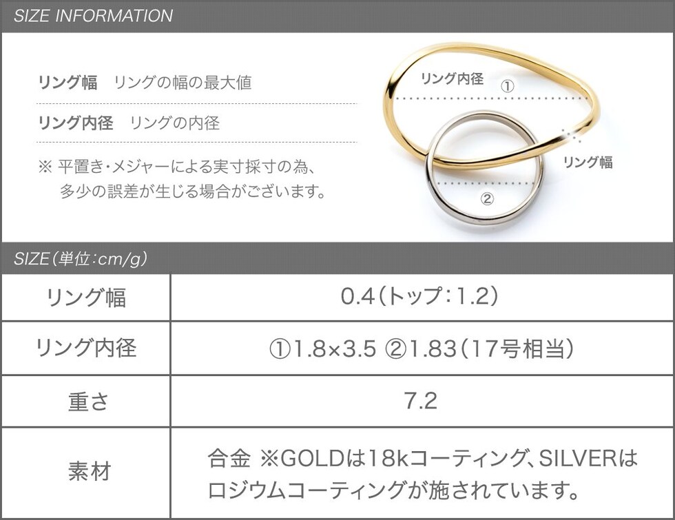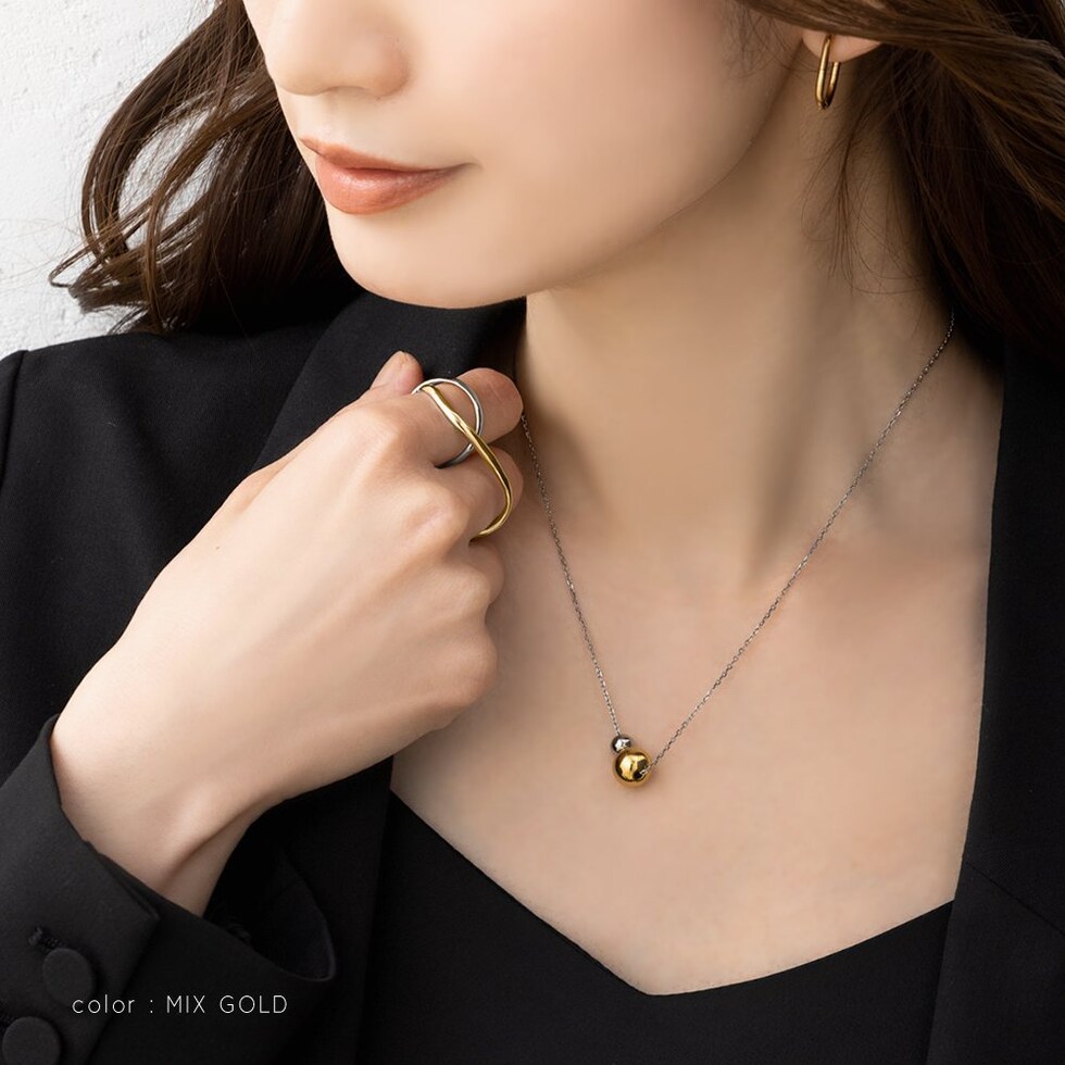 ダブルフィンガーリングならではの絶妙なカーブラインと、存在感のある見た目で大人のモードな印象に。レイヤードデザインとバイカラーで、こなれ感のあるオシャレな手元に魅せてくれます。