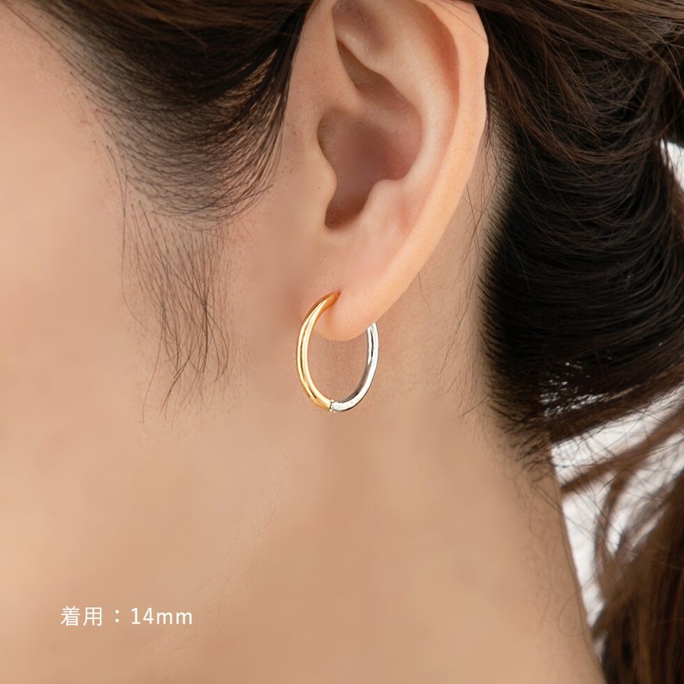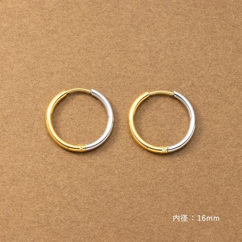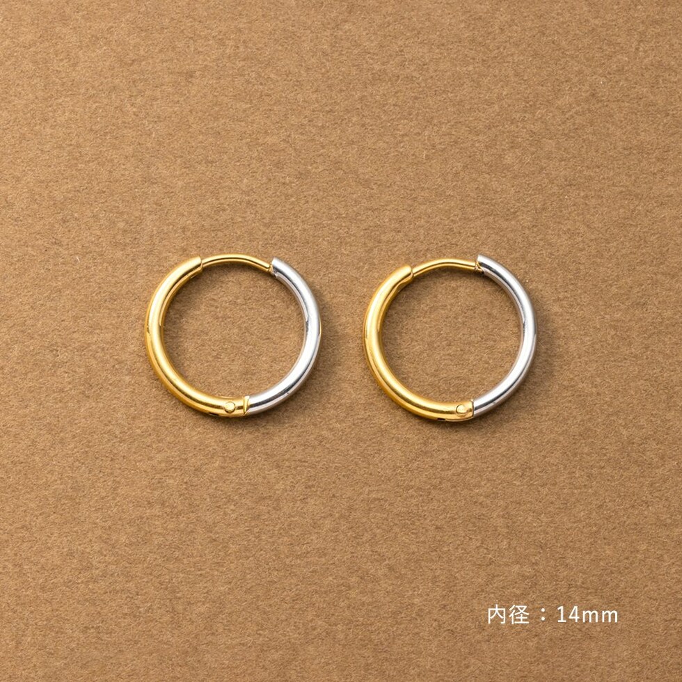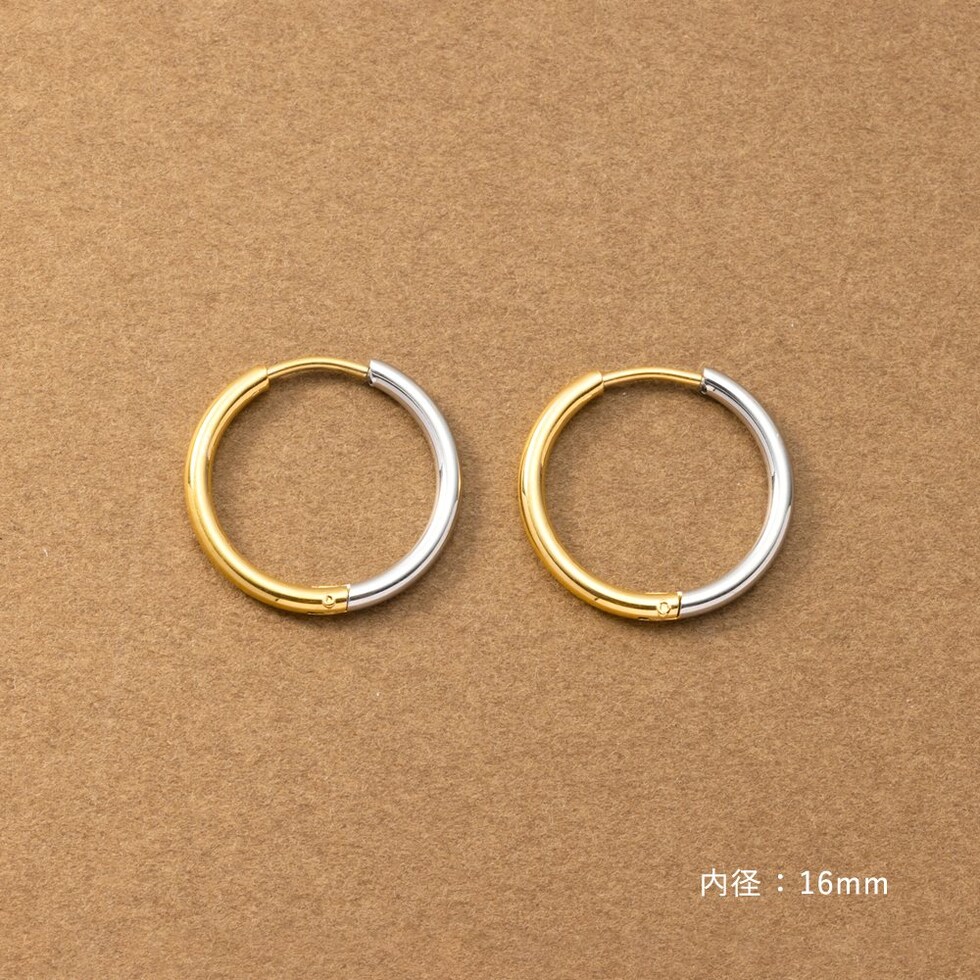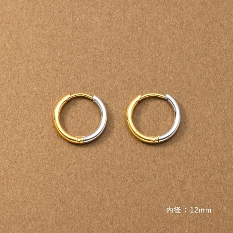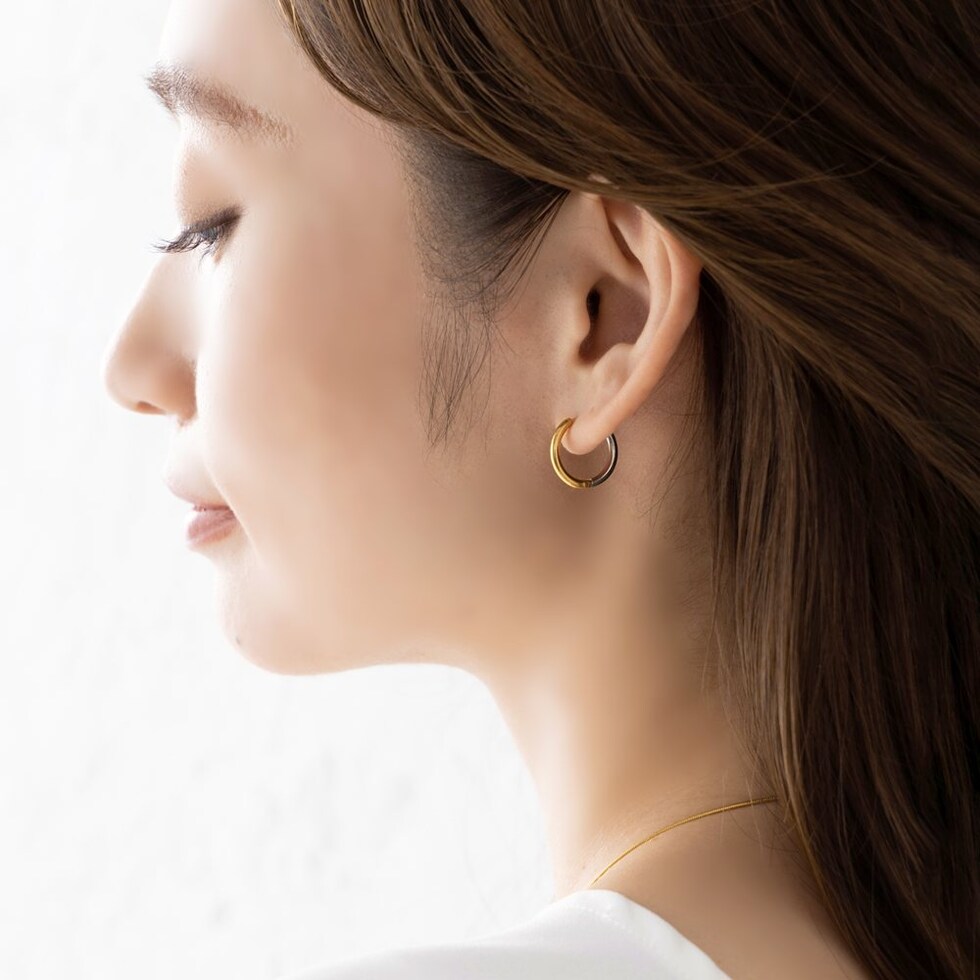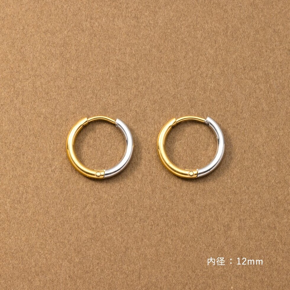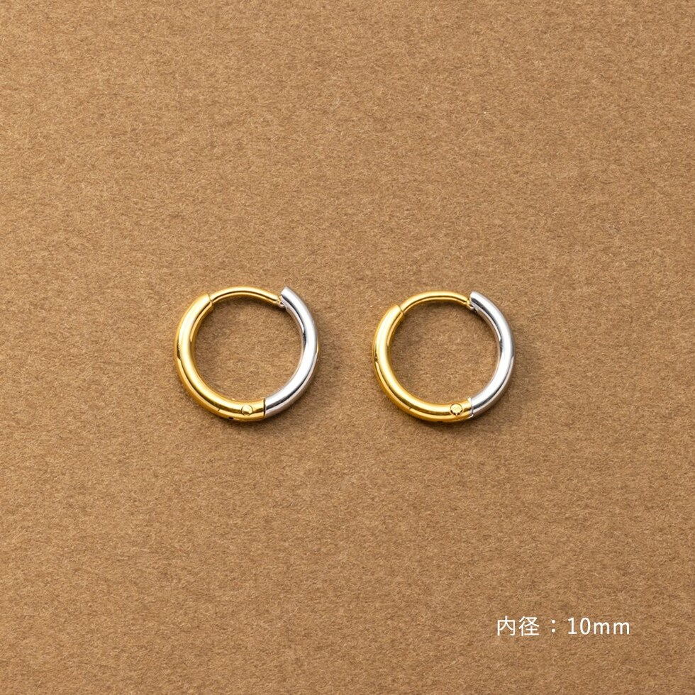 シンプルで身につけやすいステンレス製のキャッチレスフープピアス。主張せずにさりげないお洒落見えを叶えるバイカラーデザインです。前後を逆につけることで違った雰囲気を楽しめるのも嬉しい◎錆びにくいステンレス製でデイリーに活躍しそう。