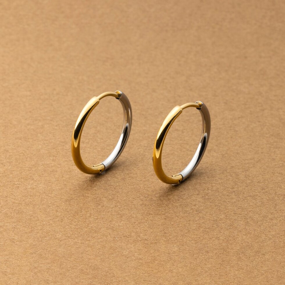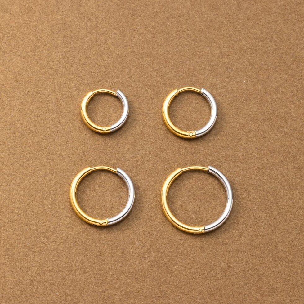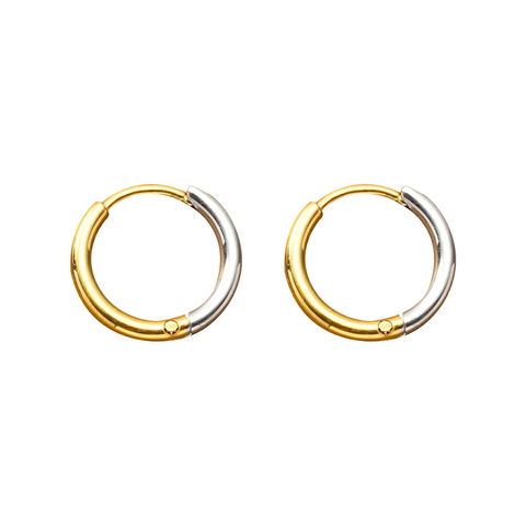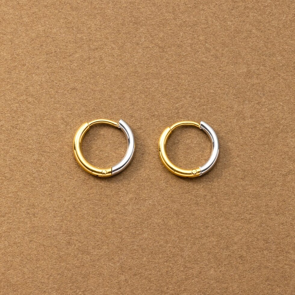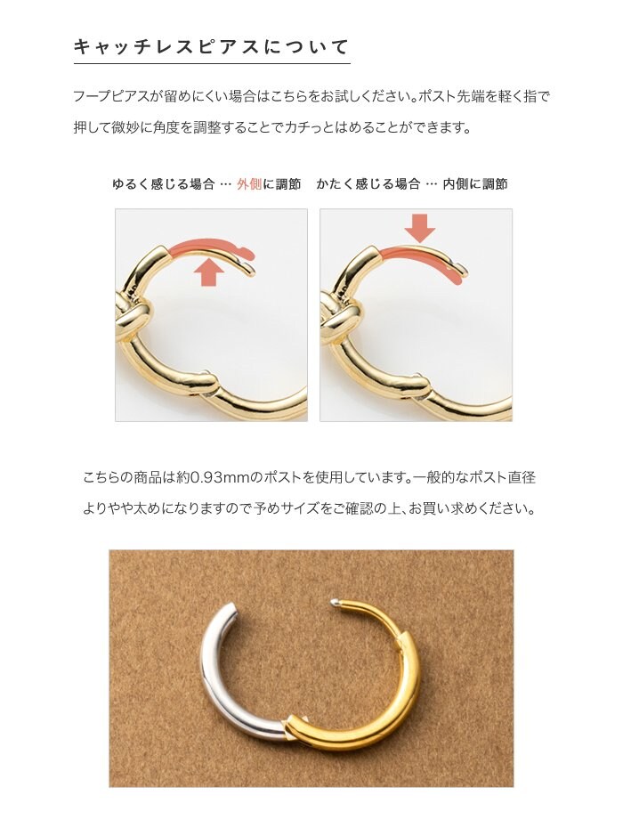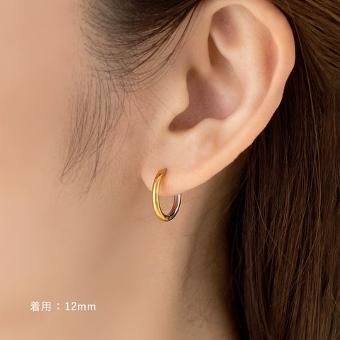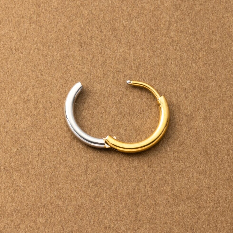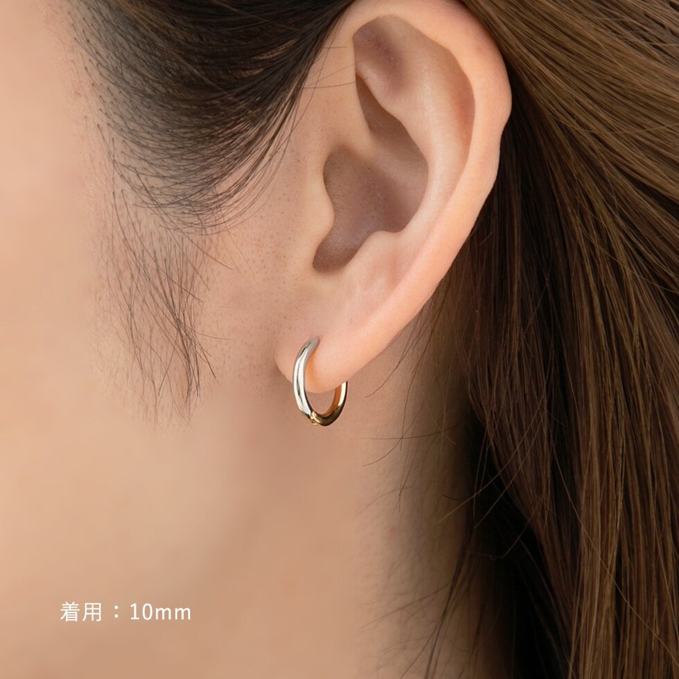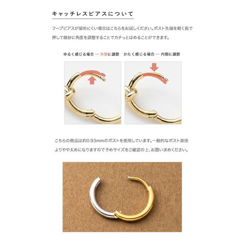 シンプルで身につけやすいステンレス製のキャッチレスフープピアス。主張せずにさりげないお洒落見えを叶えるバイカラーデザインです。前後を逆につけることで違った雰囲気を楽しめるのも嬉しい◎錆びにくいステンレス製でデイリーに活躍しそう。