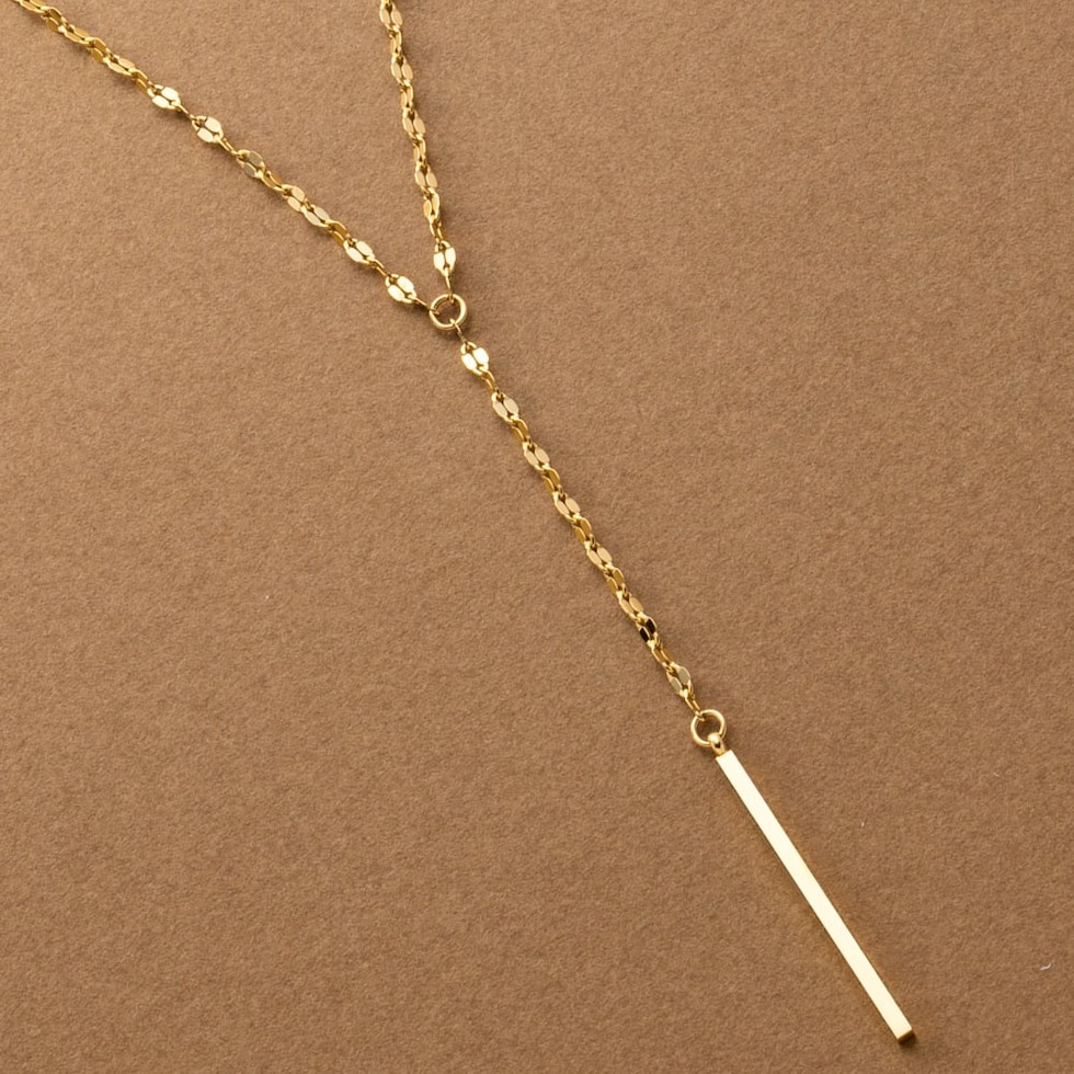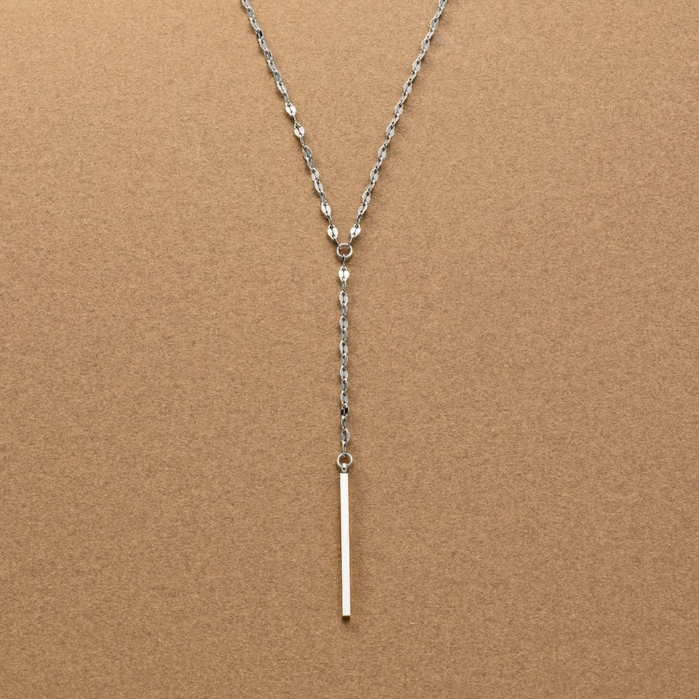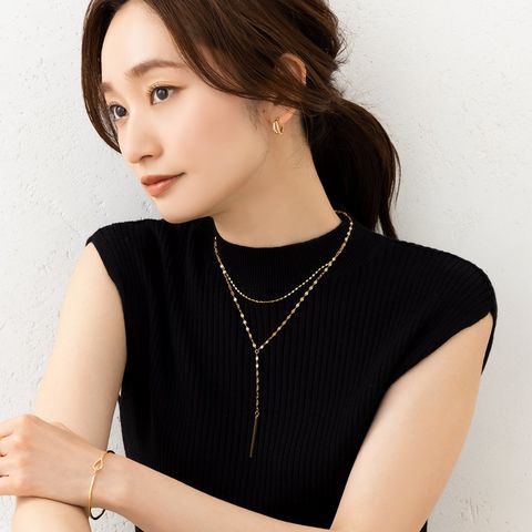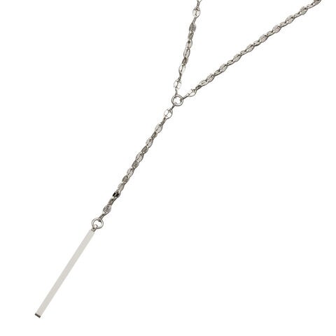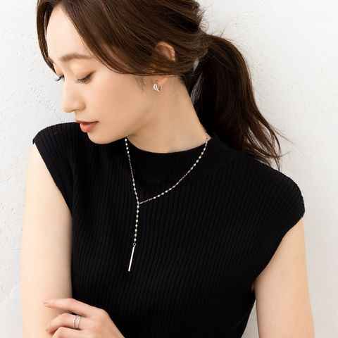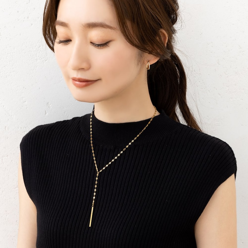 メタルバーとペタルチェーンが煌めくステンレス製Y字ロングネックレス。上品に煌めくモチーフと華奢チェーンとの組み合わせが大人コーデのアクセントにピッタリ◎錆びにくく傷に強いステンレス製でデイリーに活躍間違いナシのアイテムです。