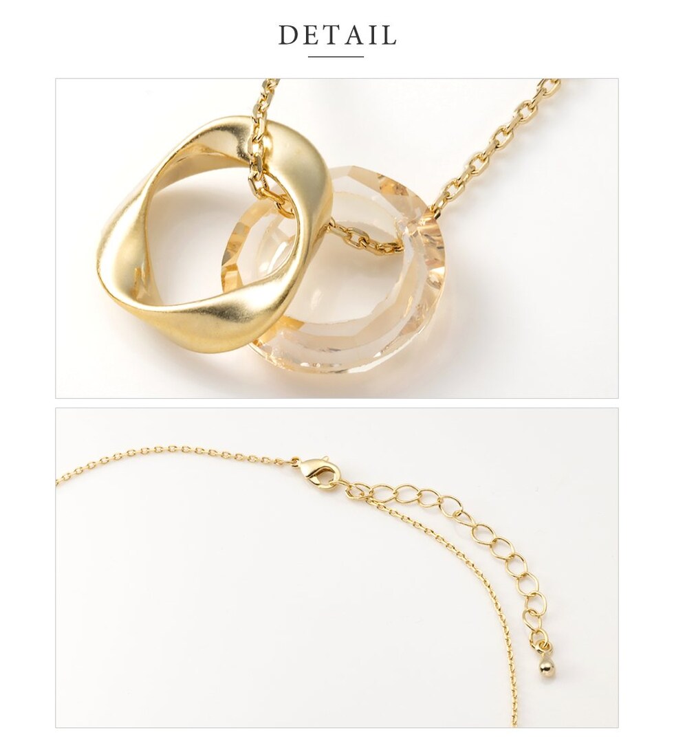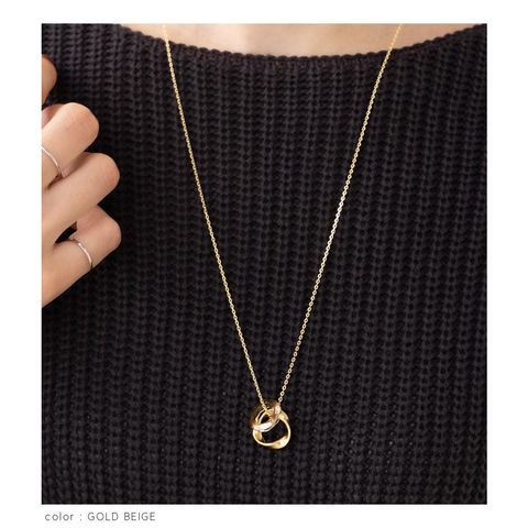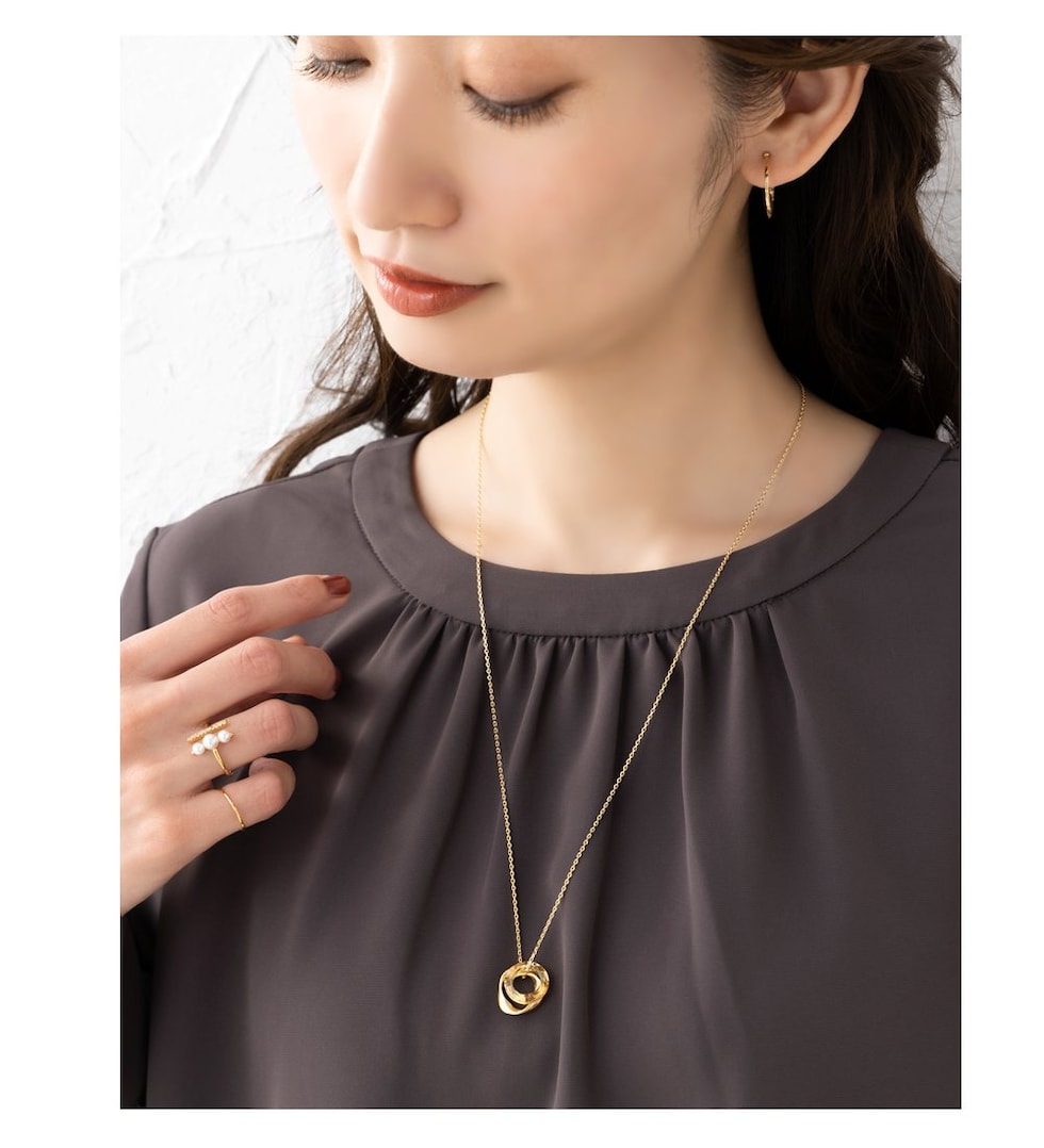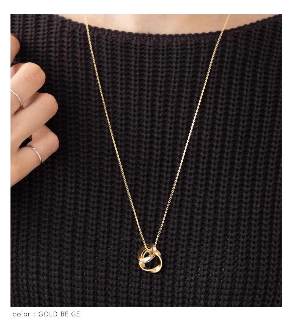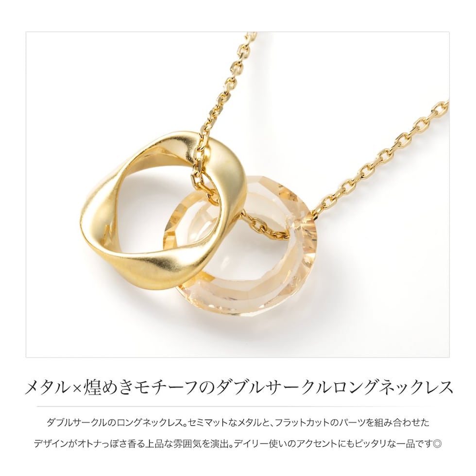 ダブルサークルのロングネックレス。セミマットなメタルと、フラットカットのパーツを組み合わせたデザインがオトナっぽさ香る上品な雰囲気を演出。デイリー使いのアクセントにもピッタリな一品です◎