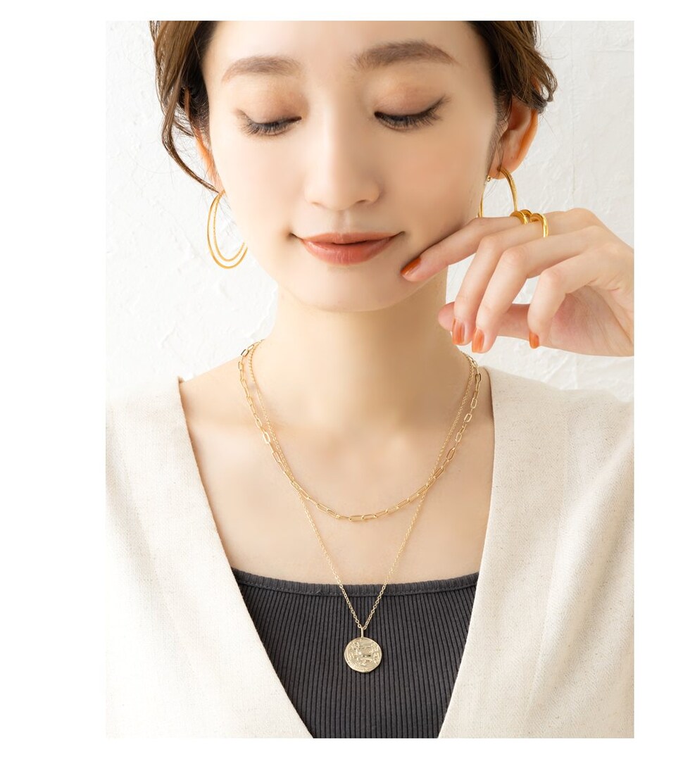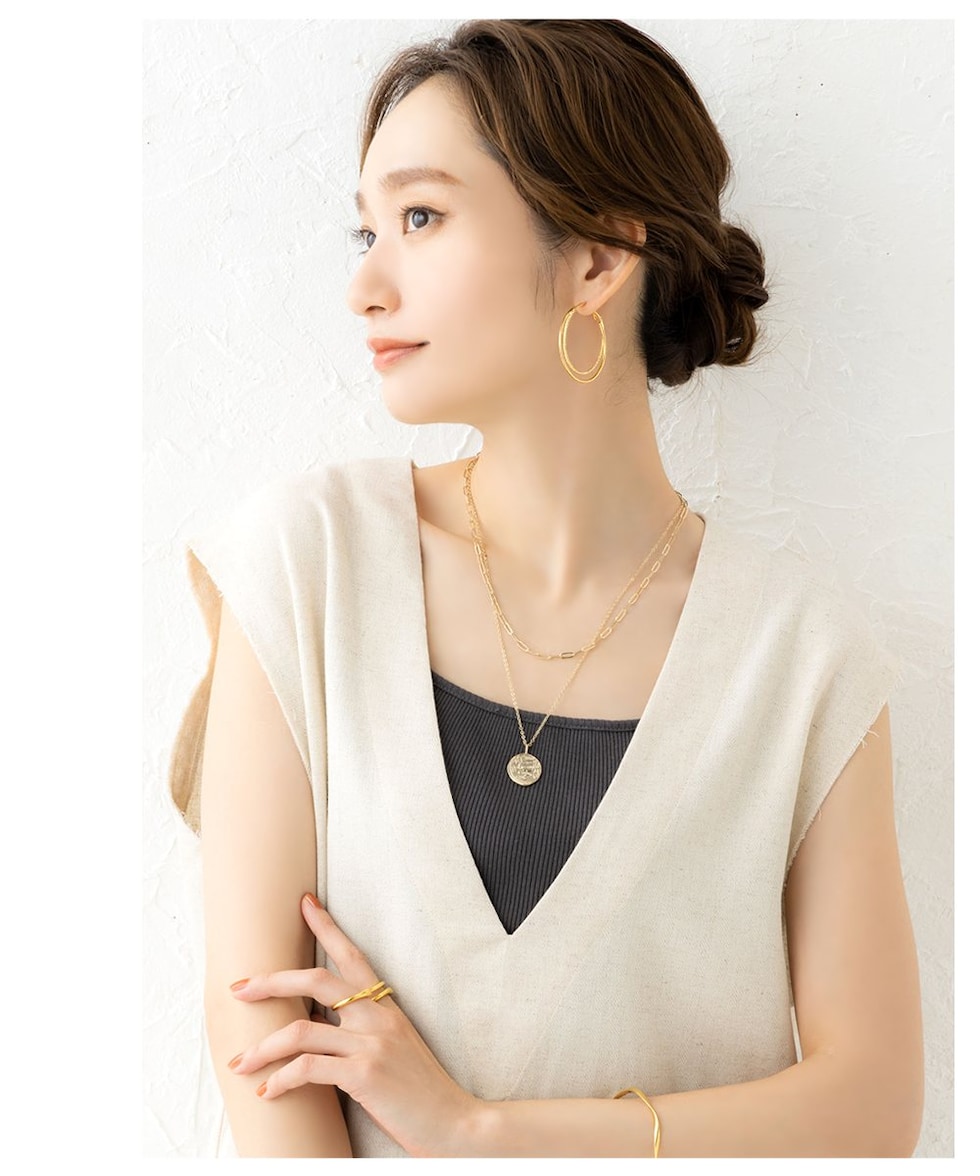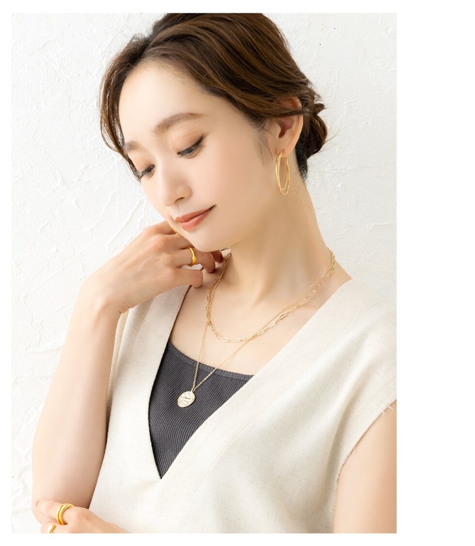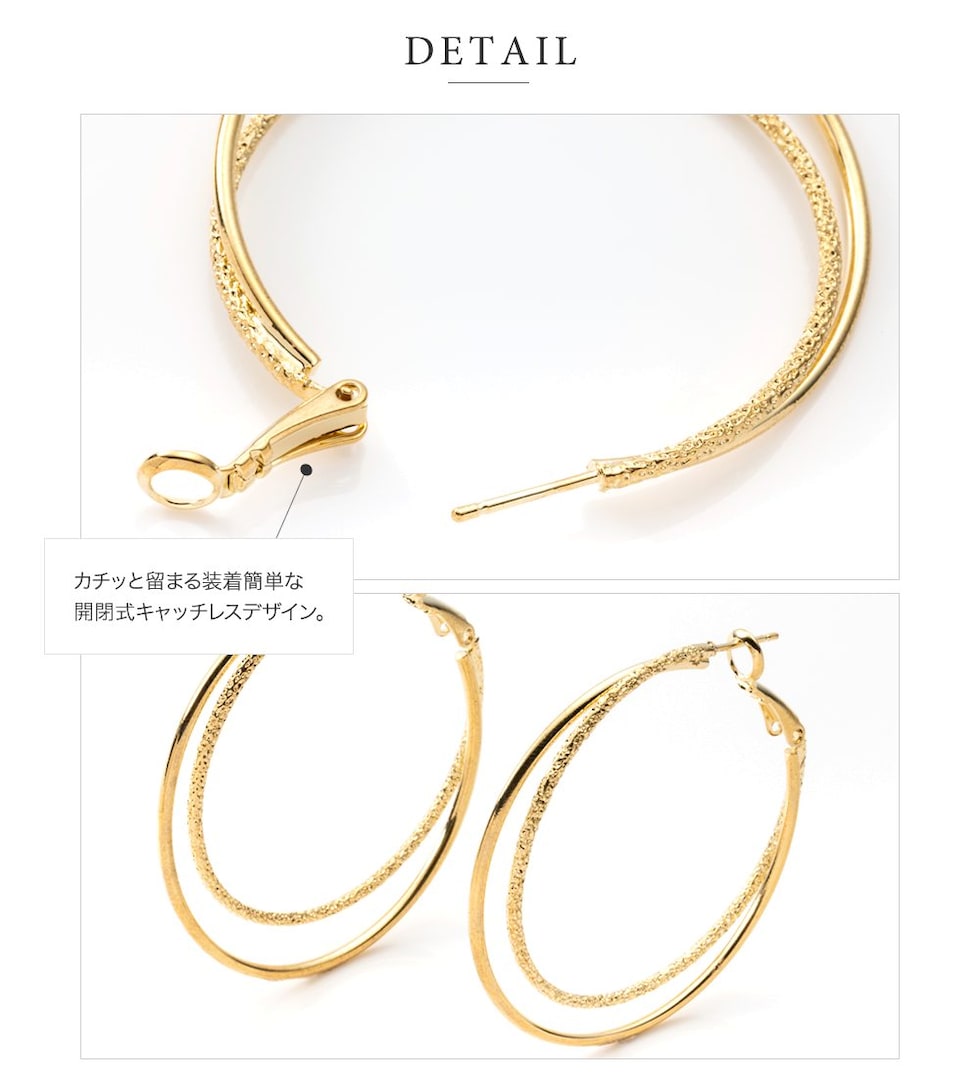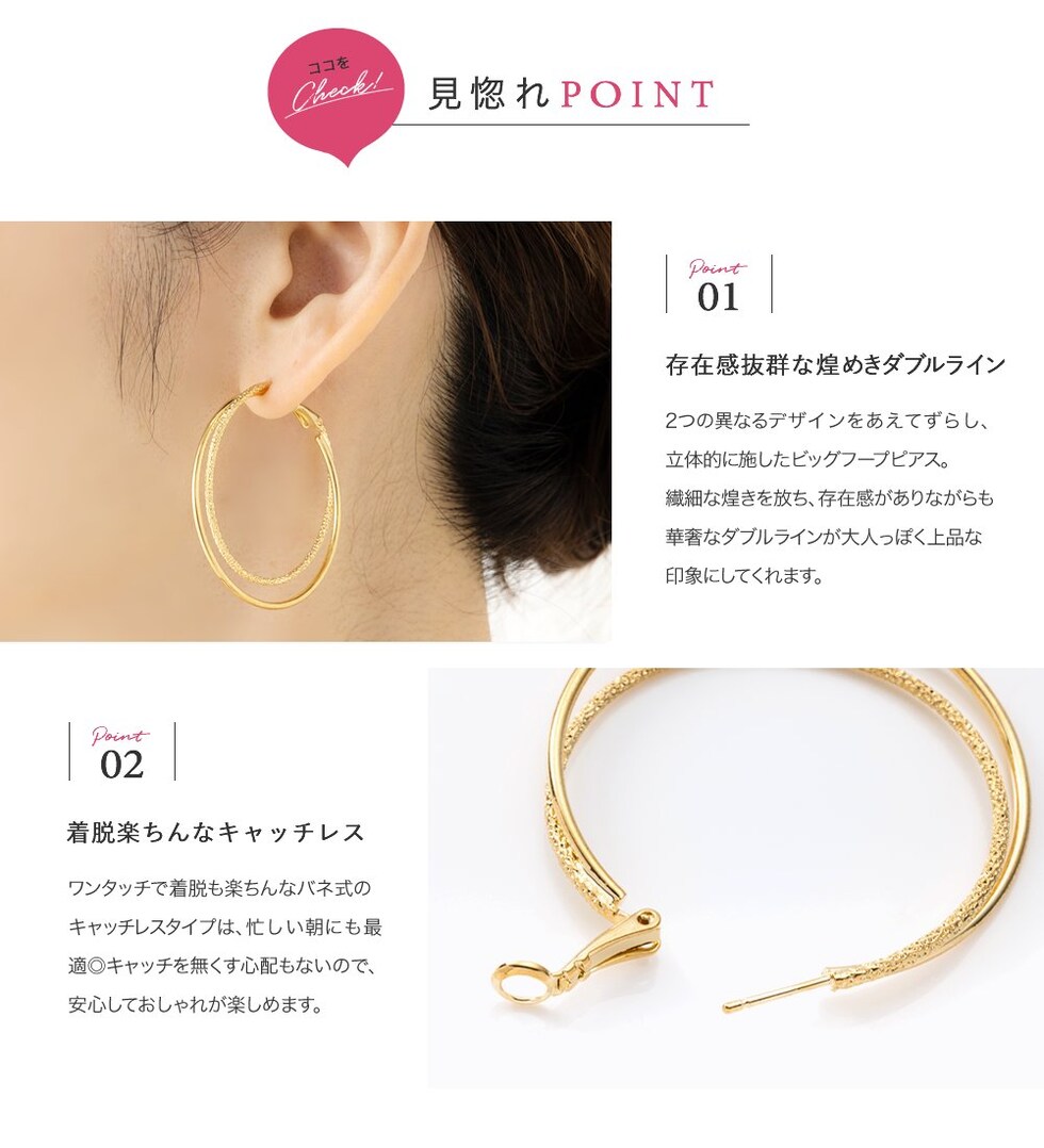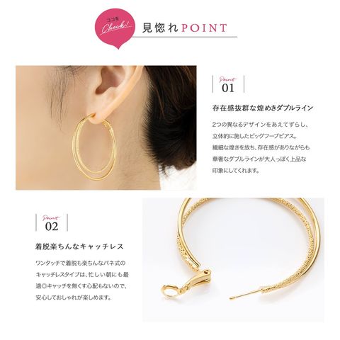 2つの異なるデザインをあえてずらし、立体的に施したビッグフープピアス。繊細な煌きを放ち、存在感がありながらも華奢なダブルラインが大人っぽく上品な印象にしてくれます。