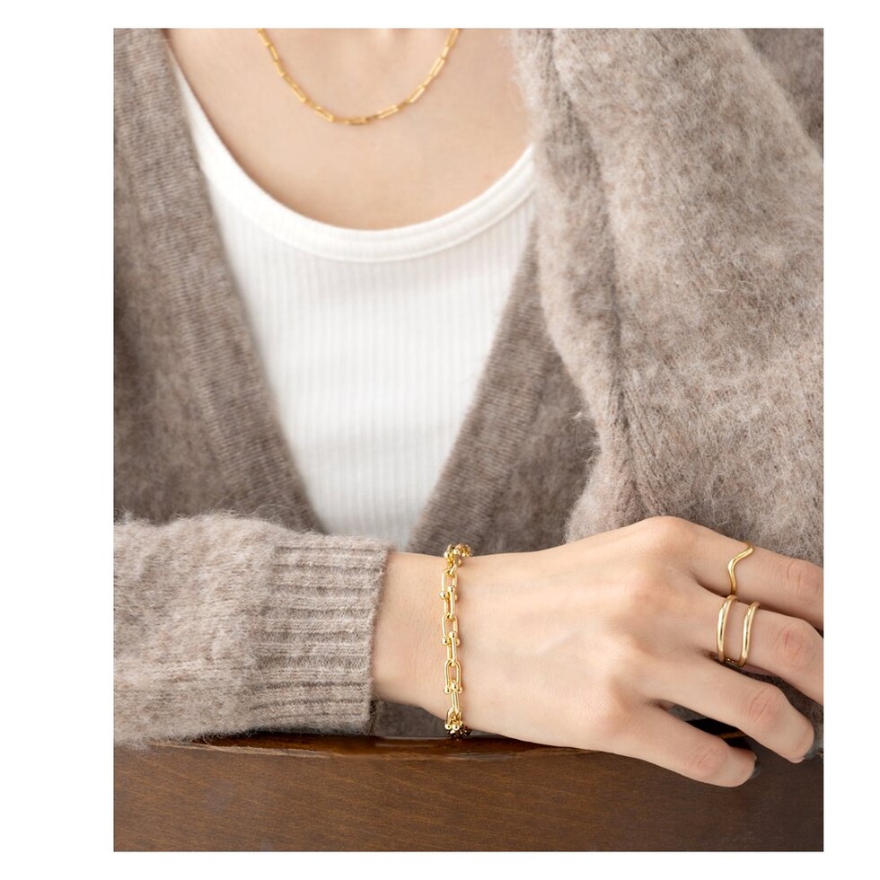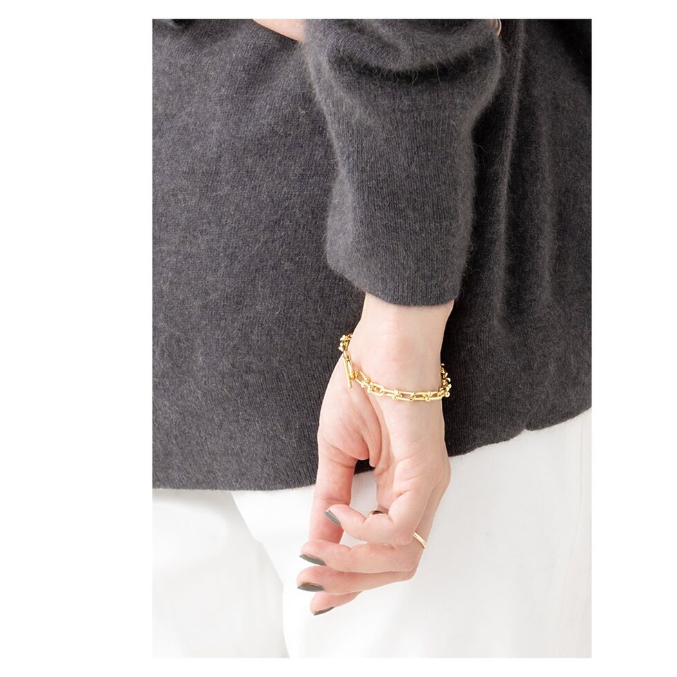 オーバルとスフィアをMIXしたデザインが新鮮な“リンキングチェーン”のブレスレット。太すぎない程よいボリューム感でコーデに合わせやすく、女性らしい手元に。マンテルタイプでさりげなくトレンド感もアップ◎