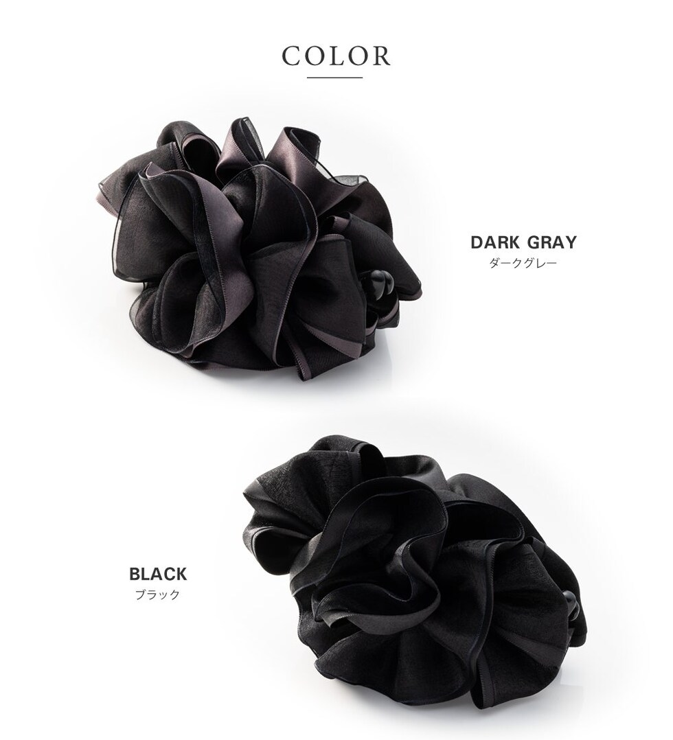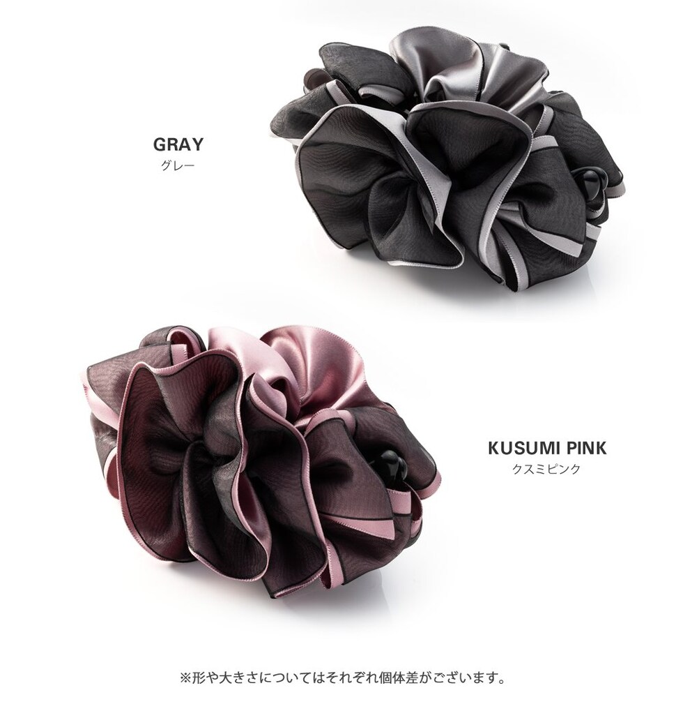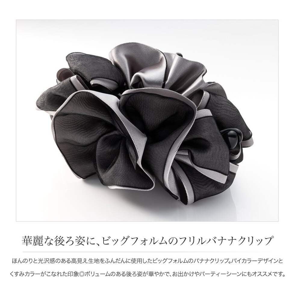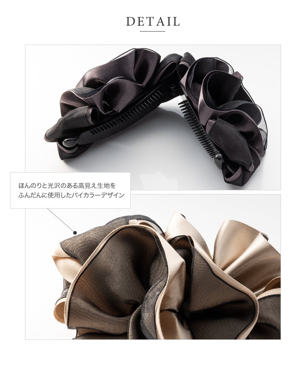 ほんのりと光沢感のある高見え生地をふんだんに使用したビッグフォルムのバナナクリップ。バイカラーデザインとくすみカラーがこなれた印象◎ボリュームのある後ろ姿が華やかで、お出かけやパーティーシーンにもオススメです。