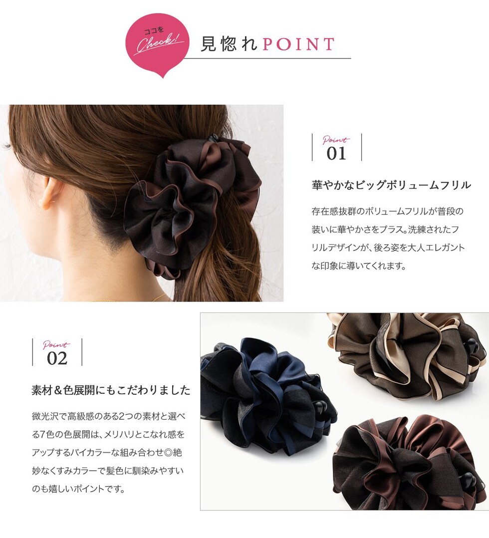 微光沢で高級感のある2つの素材&7色から選べる同系色バイカラーで、メリハリとこなれ感アップ◎絶妙なくすみカラーで髪色に馴染みやすいのも嬉しいポイントです。