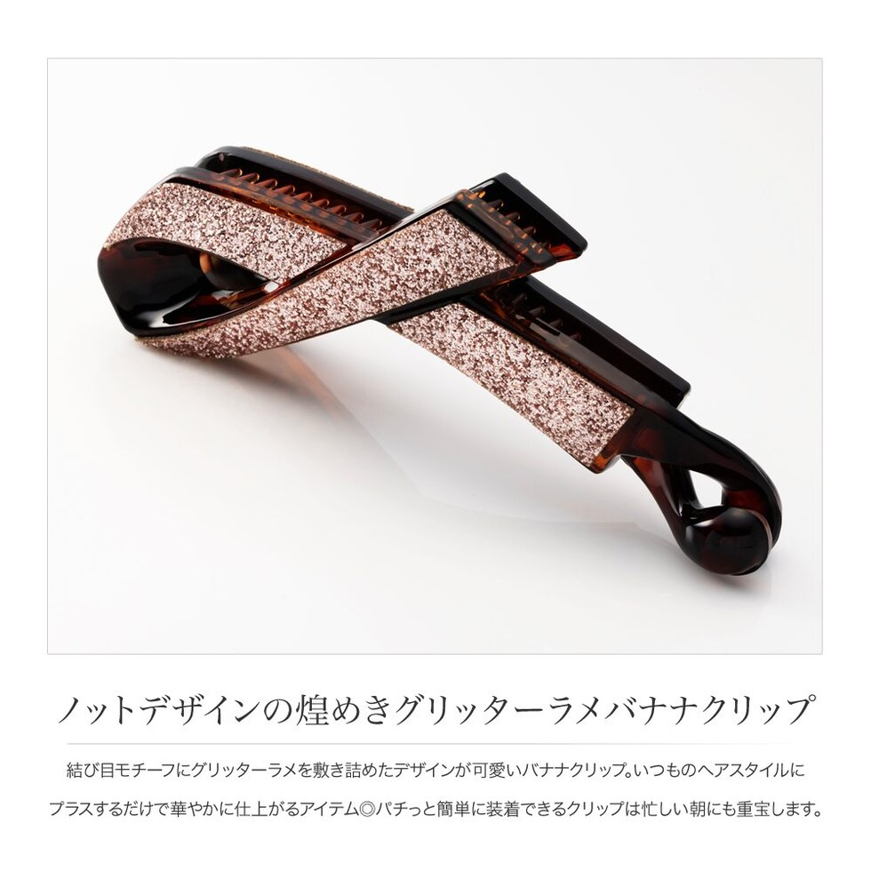 結び目モチーフにグリッターラメを敷き詰めたデザインが可愛いバナナクリップ。いつものヘアスタイルにプラスするだけで華やかに仕上がるアイテム◎パチっと簡単に装着できるクリップは忙しい朝にも重宝します。