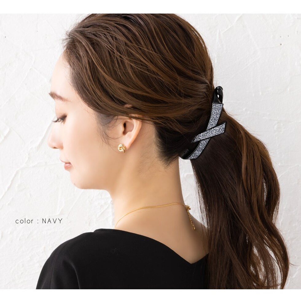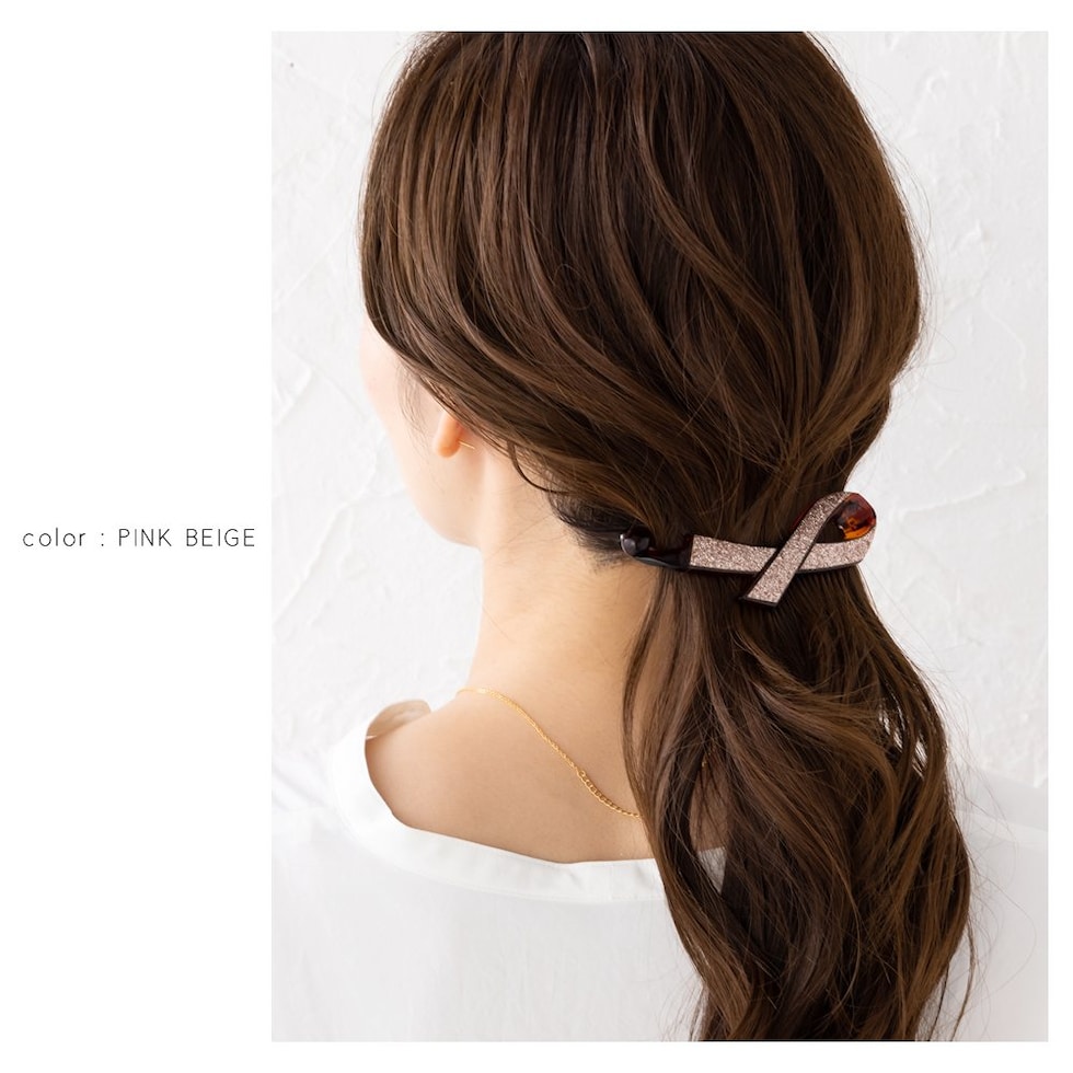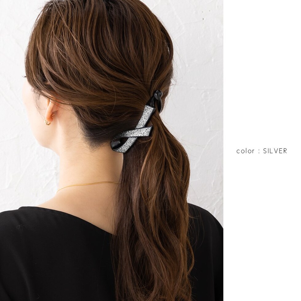 存在感抜群のノットモチーフが魅力的なヘアクリップ。上品なデザインながらもこなれた印象をプラスし、キラキラと輝くグリッターラメが後ろ姿を華やかに魅せてくれます。