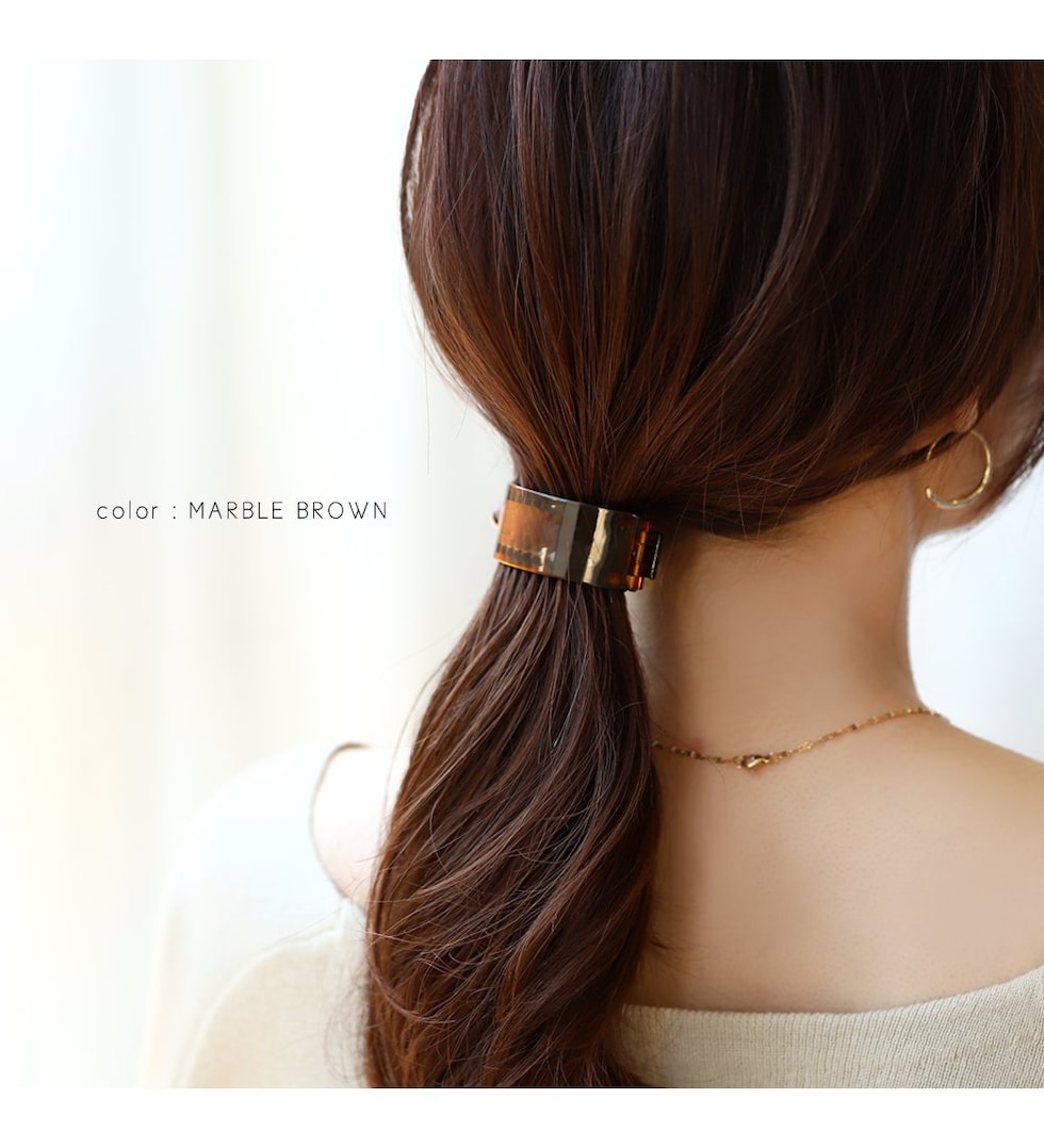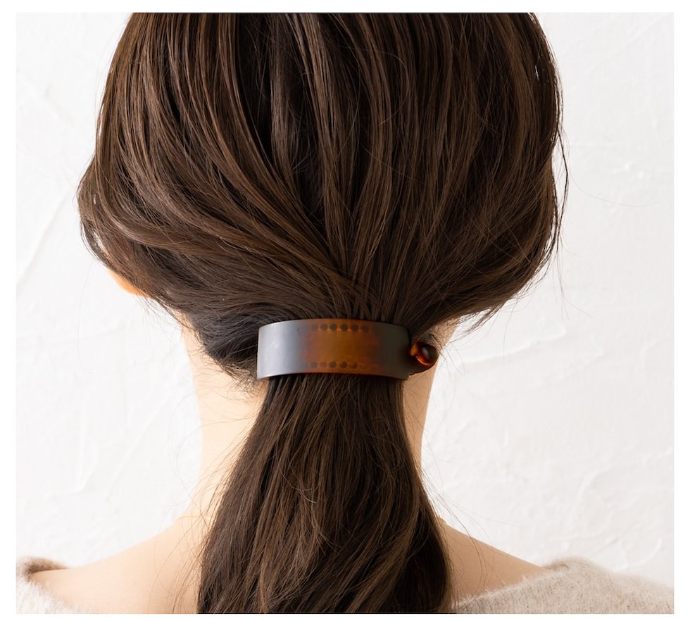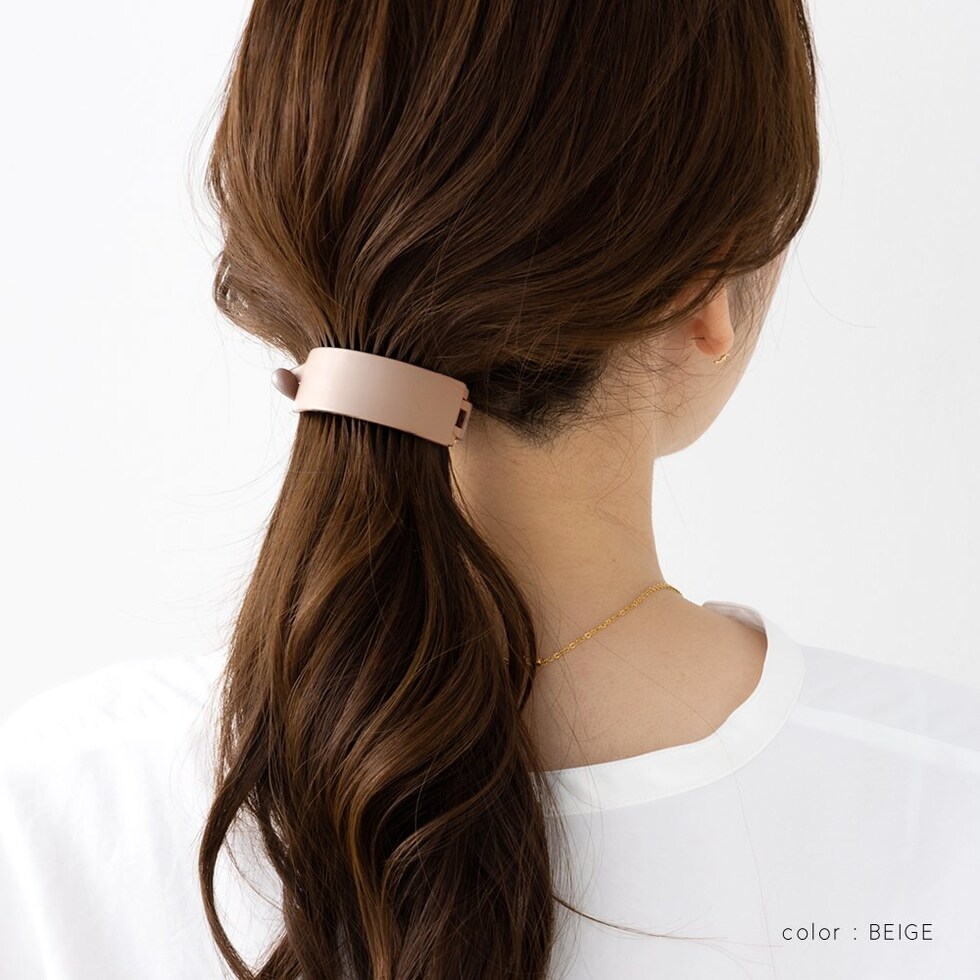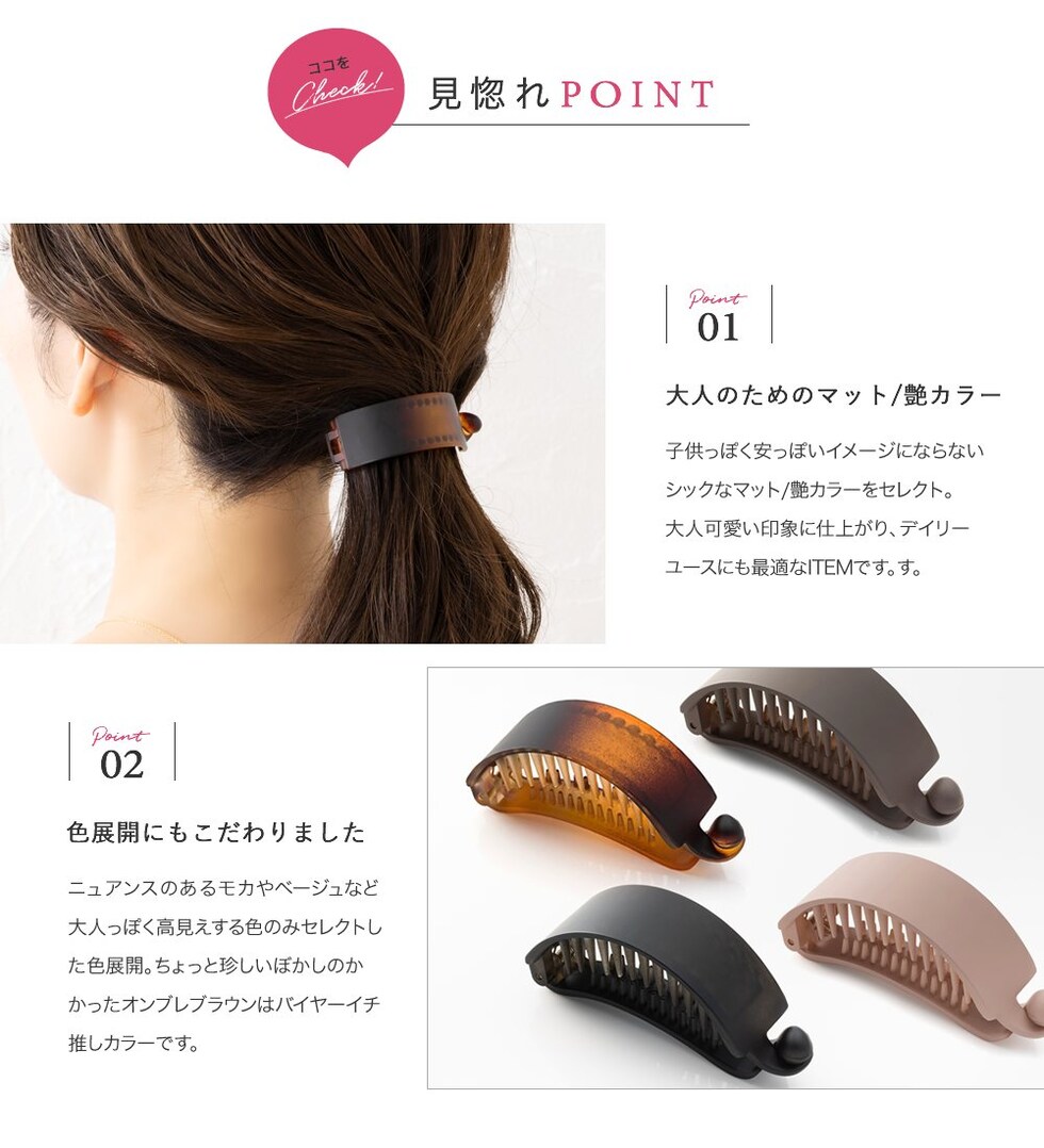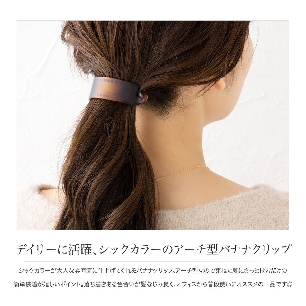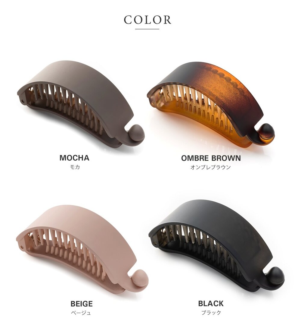 シックカラーが大人な雰囲気に仕上げてくれるバナナクリップ。アーチ型なので束ねた髪にさっと挟むだけの簡単装着が嬉しいポイント。落ち着きある色合いが髪なじみ良く、オフィスから普段使いにオススメの一品です◎