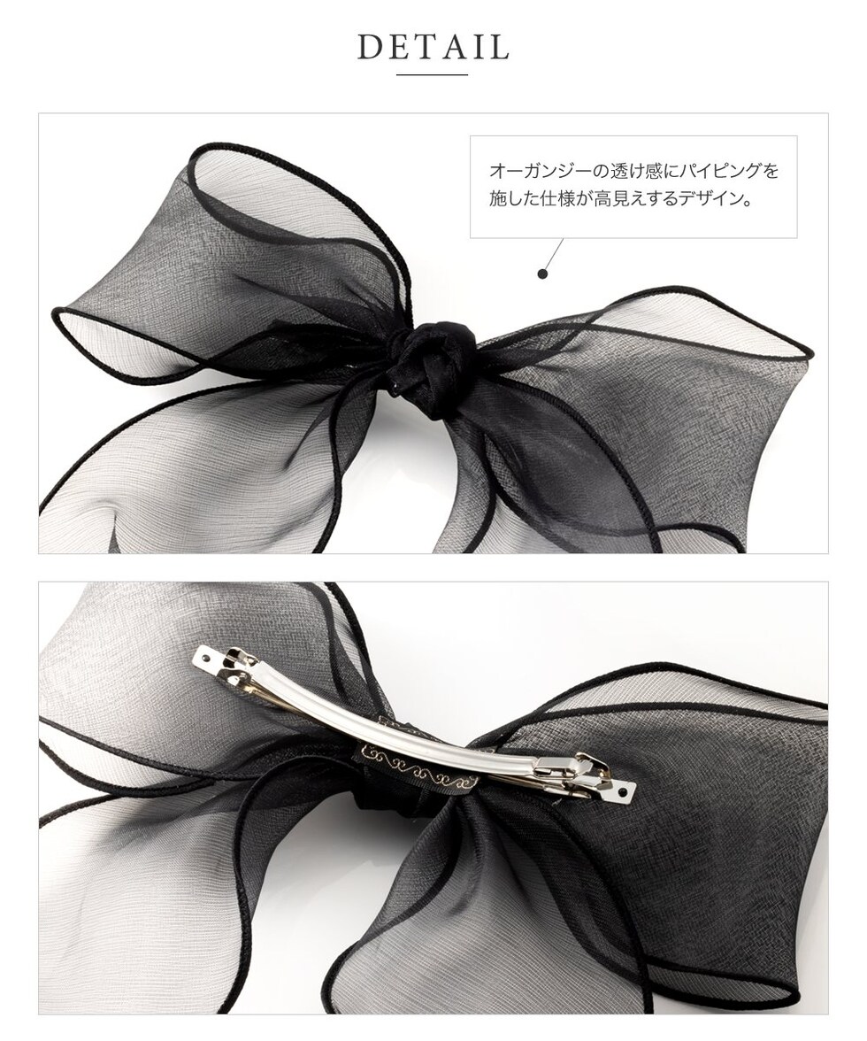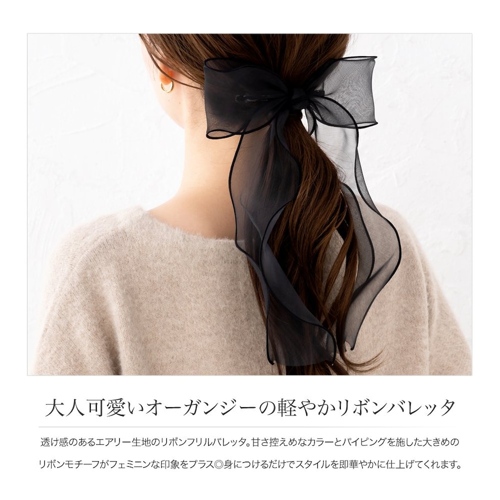 透け感のあるエアリー生地のリボンフリルバレッタ。甘さ控えめカラーとパイピングを施した大きめのリボンモチーフがフェミニンな印象をプラス◎身につけるだけでスタイルを即華やかに仕上げてくれます。