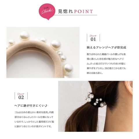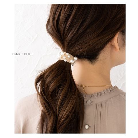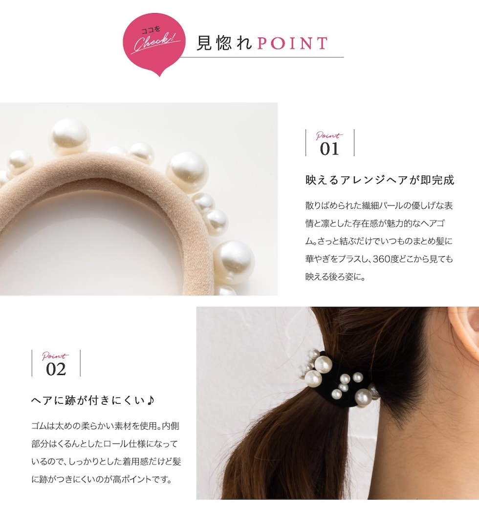 散りばめられた繊細パールの優しげな表情と凛とした存在感が魅力的なヘアゴム。さっと結ぶだけでいつものまとめ髪に華やぎをプラスし、360度どこから見ても映える後ろ姿に。