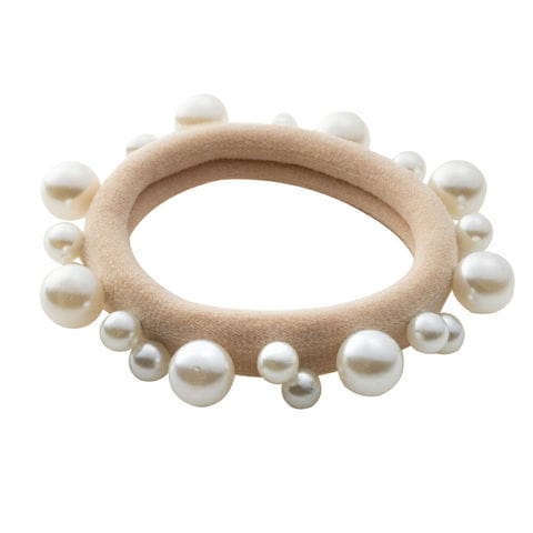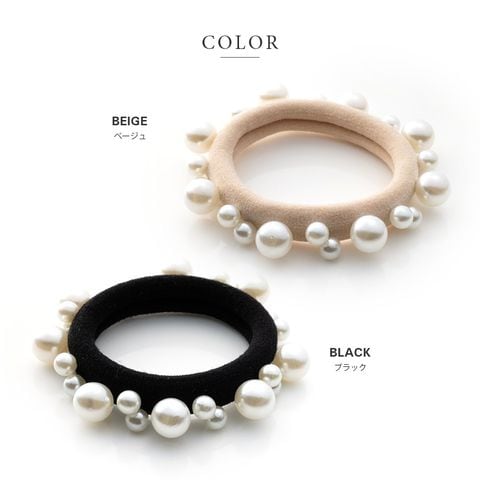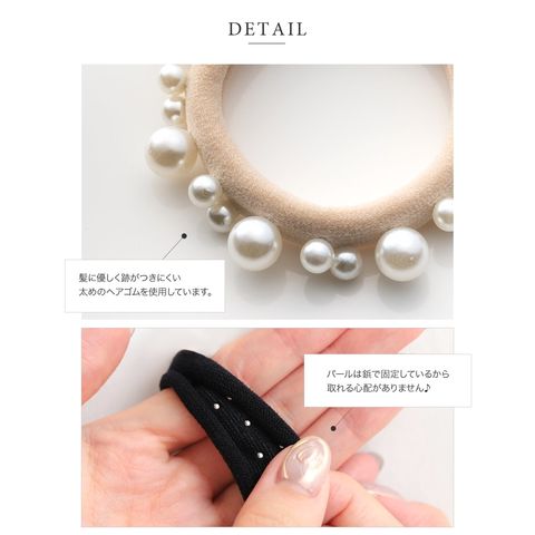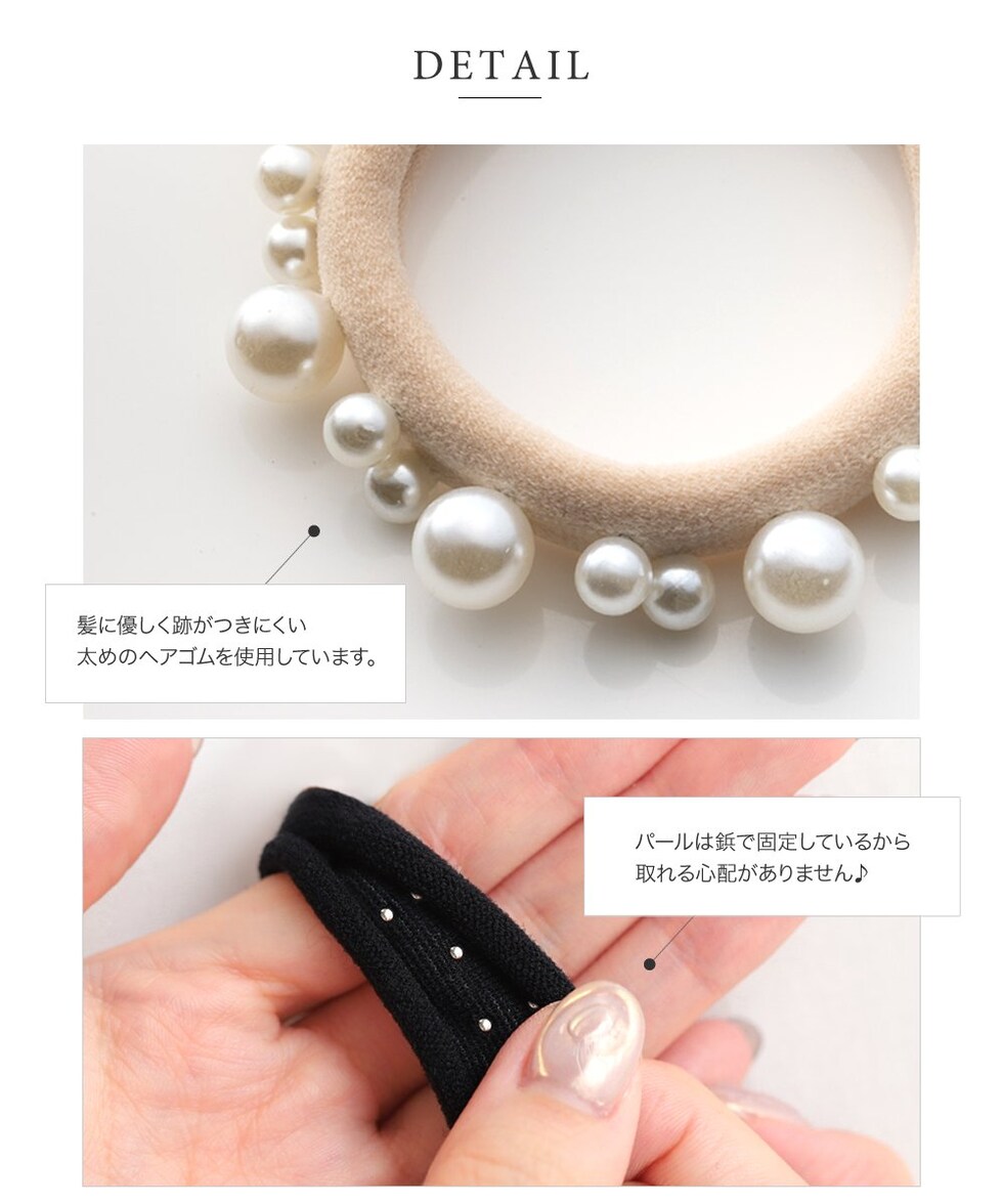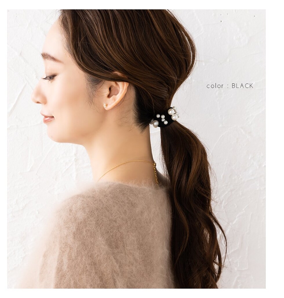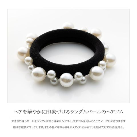 大きさの違うパールをランダムに散りばめたヘアゴム。太めゴムを用いることでノーブルに寄りすぎず様々な服装にマッチします。まとめ髪に華やかさを添えてくれるからサッと結ぶだけでお洒落見え。