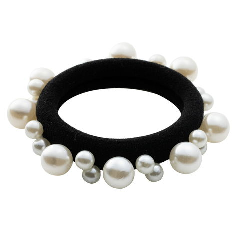大きさの違うパールをランダムに散りばめたヘアゴム。太めゴムを用いることでノーブルに寄りすぎず様々な服装にマッチします。まとめ髪に華やかさを添えてくれるからサッと結ぶだけでお洒落見え。