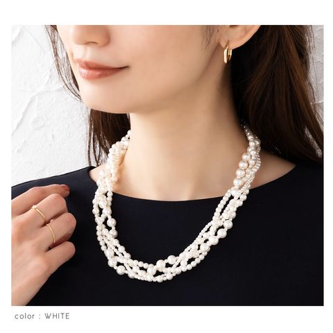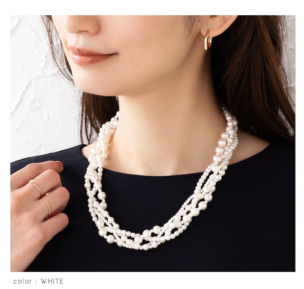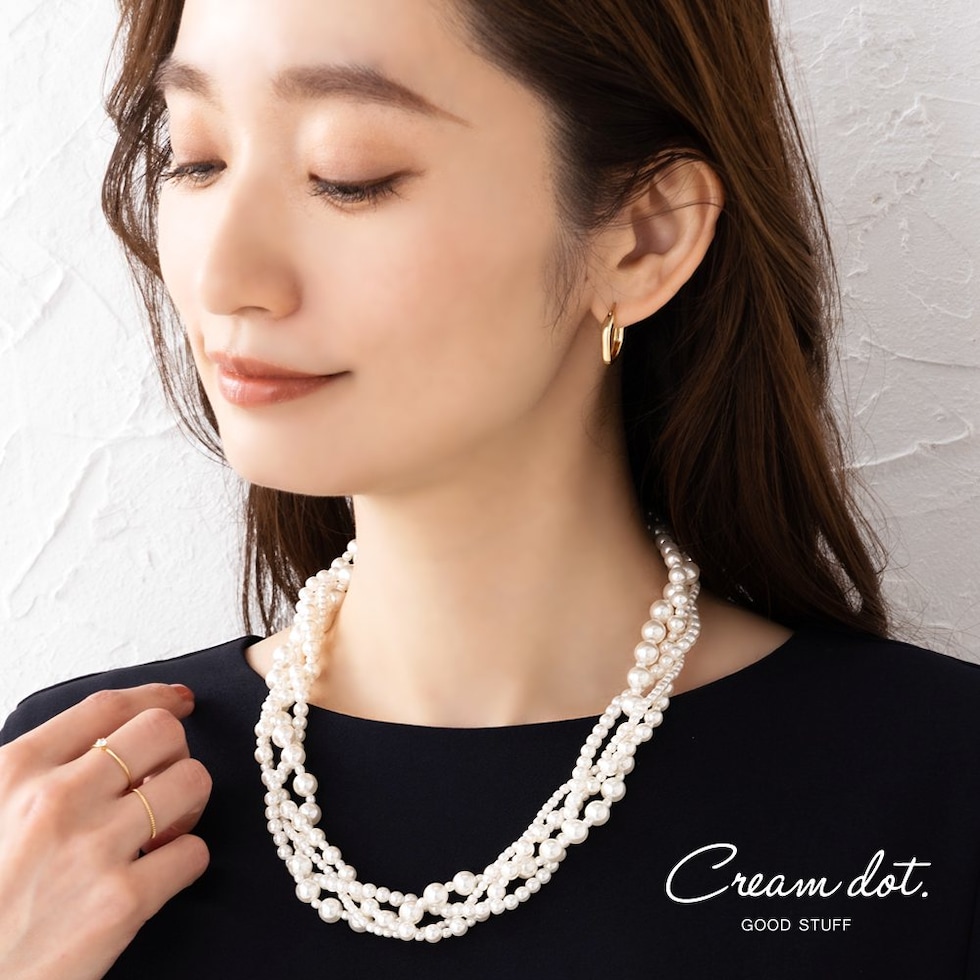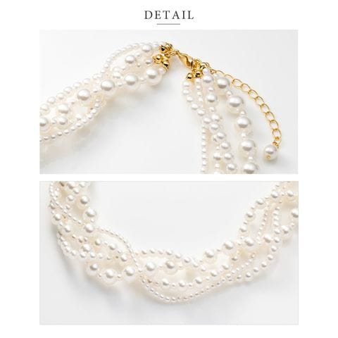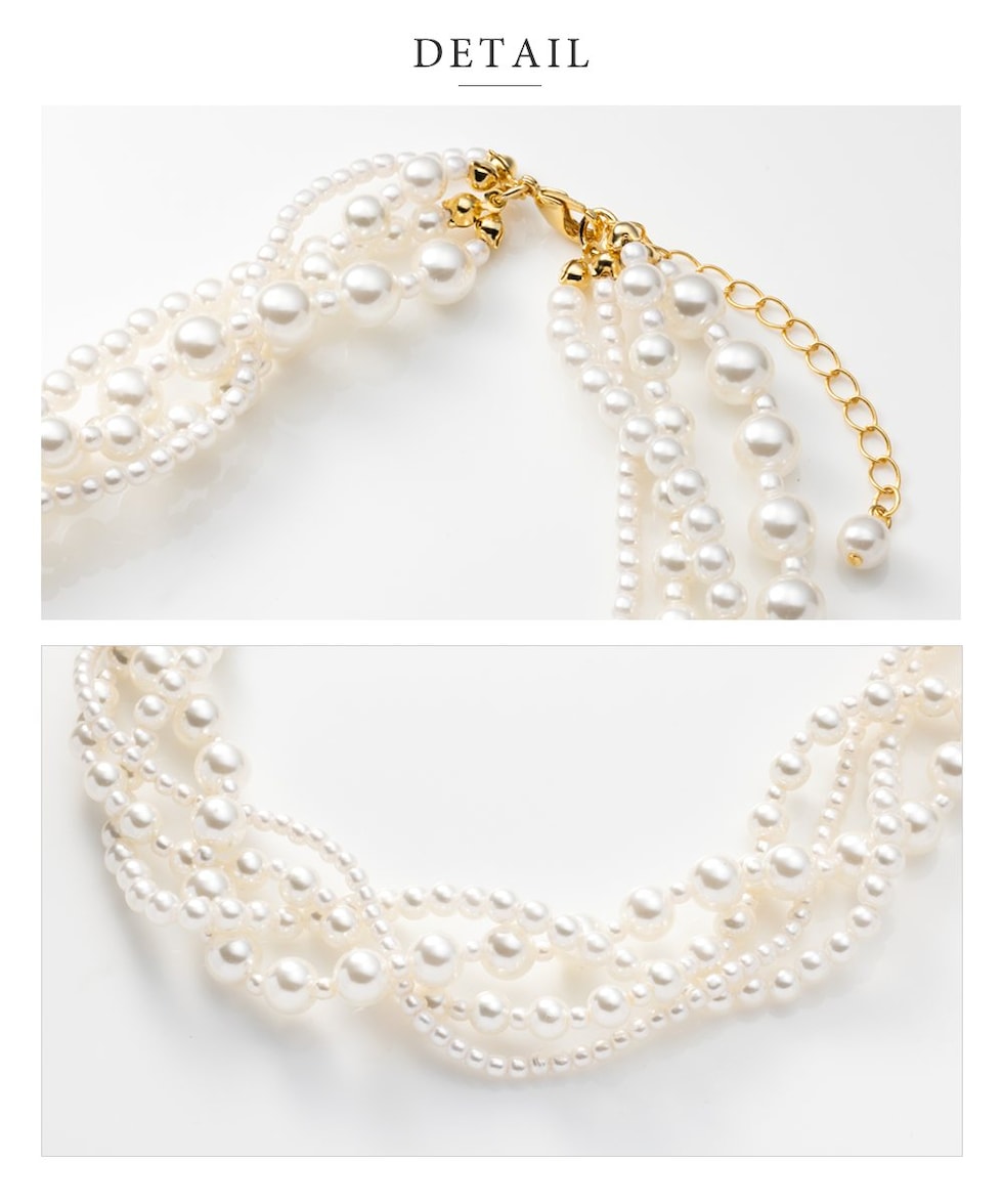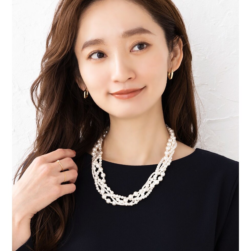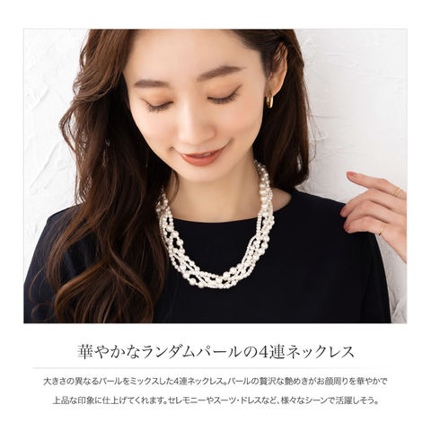大きさの異なるパールをミックスした4連ネックレス。パールの贅沢な艶めきがお顔周りを華やかで上品な印象に仕上げてくれます。セレモニーやスーツ・ドレスなど、様々なシーンで活躍しそう。