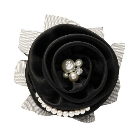 光沢のあるローズモチーフにチュールや大きさの異なる艶やかなパール・ビジューをあしらった華やかなフラワーコサージュ。セレモニースタイルやドレス・スーツなど様々な装いにマッチし、華やかな印象に仕立ててくれます。