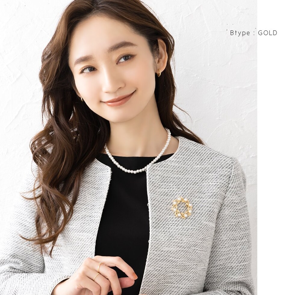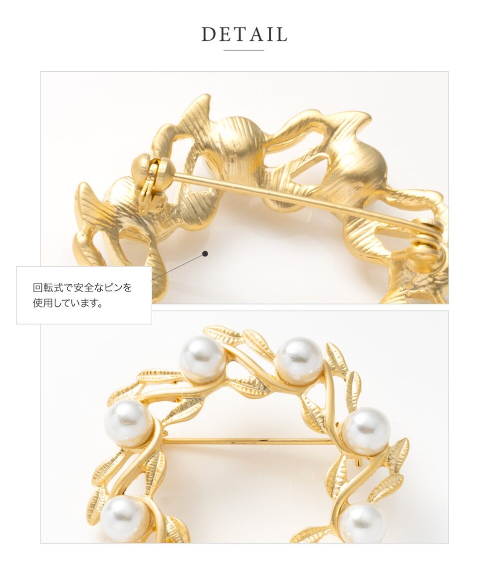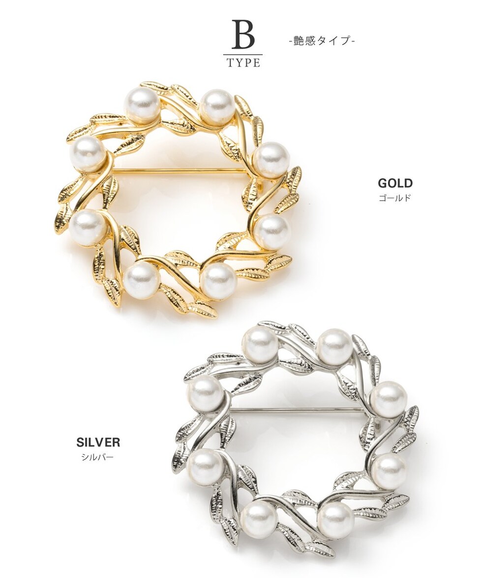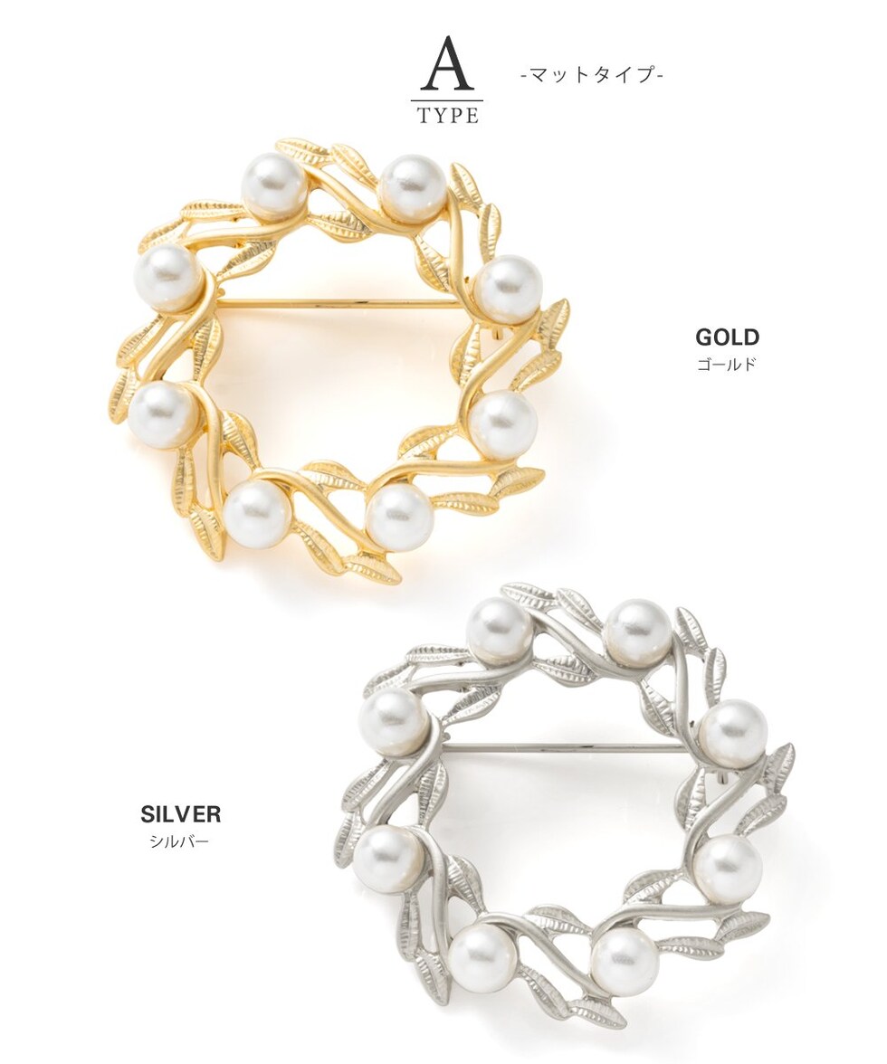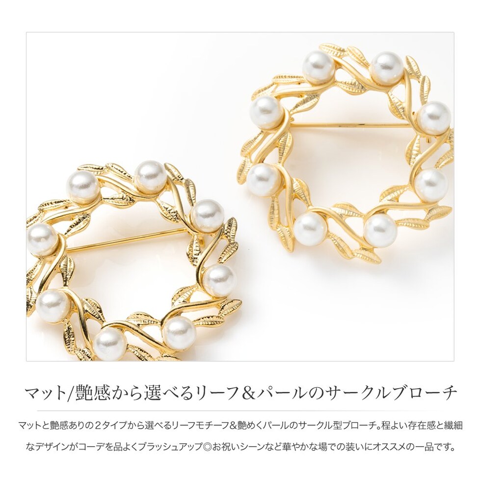 マットと艶感ありの2タイプから選べるリーフモチーフ&艶めくパールのサークル型ブローチ。程よい存在感と繊細なデザインがコーデを品よくブラッシュアップ◎お祝いシーンなど華やかな場での装いにオススメの一品です。