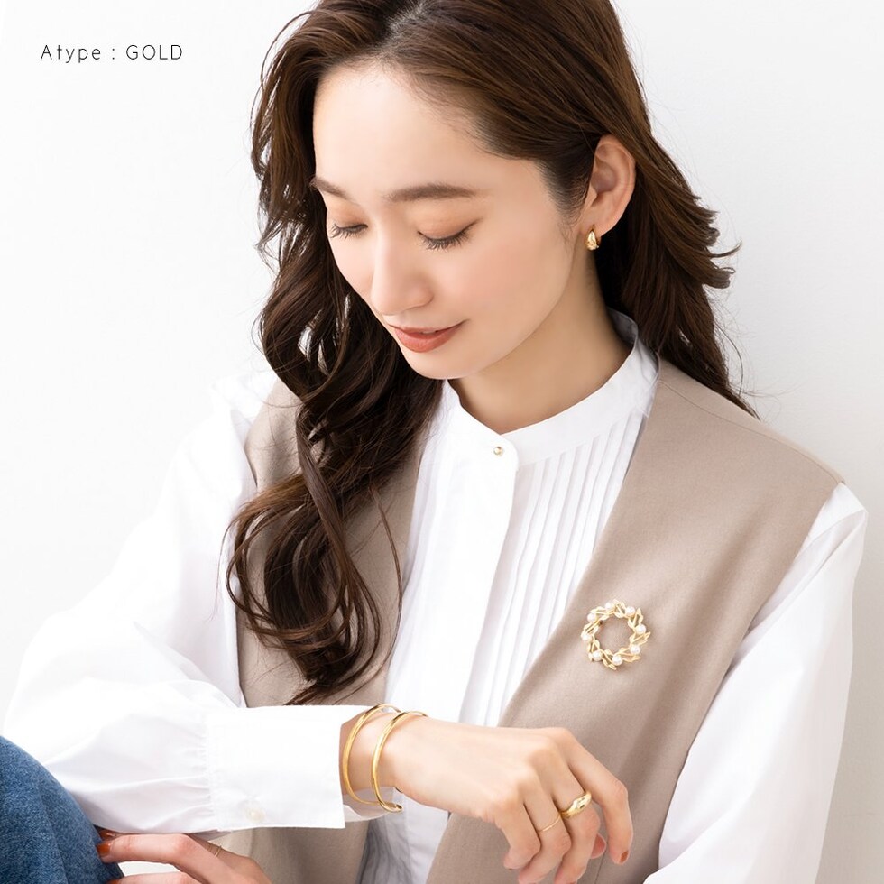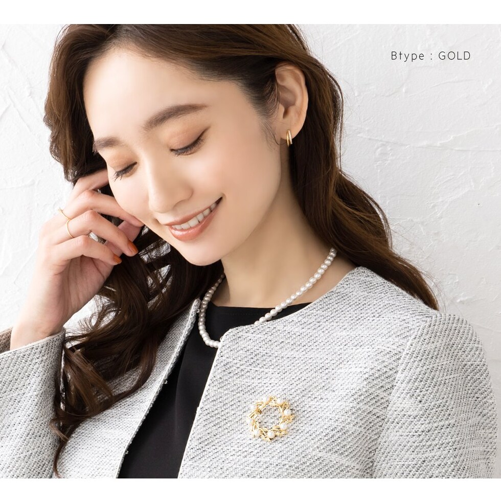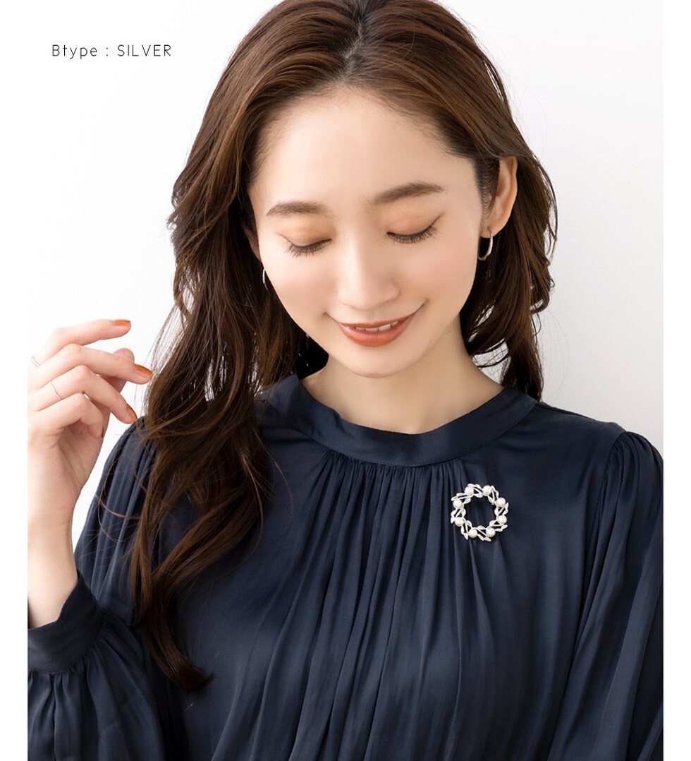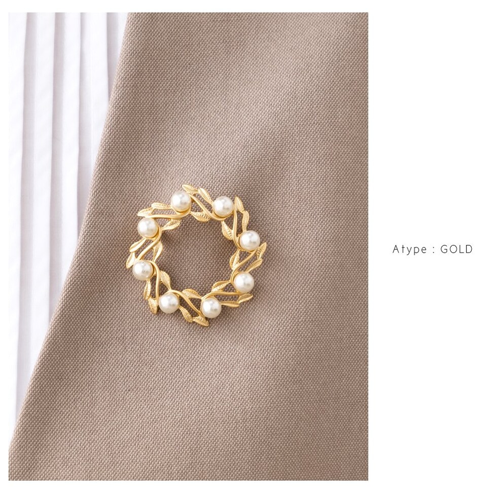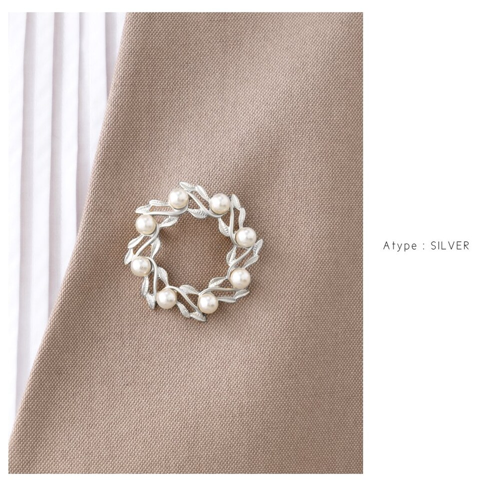 マットと艶感ありの2タイプから選べるリーフモチーフ&艶めくパールのサークル型ブローチ。程よい存在感と繊細なデザインがコーデを品よくブラッシュアップ◎お祝いシーンなど華やかな場での装いにオススメの一品です。