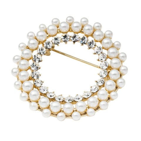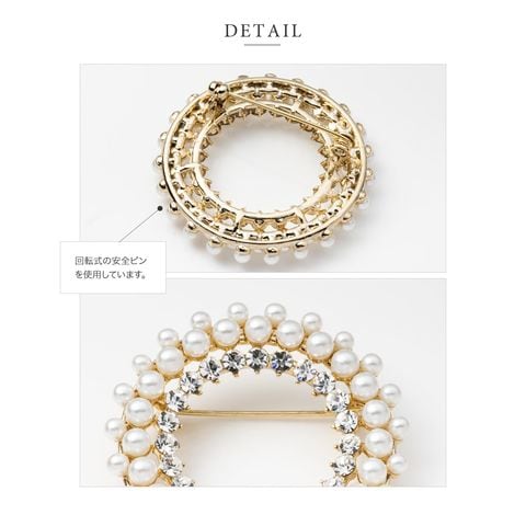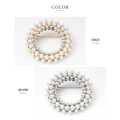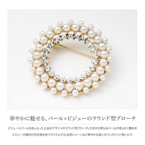 ビジューとパールをあしらった上品なデザインのラウンド型ブローチ。大きさの異なるパールが柔らかく艶めきビジューの輝きが存在感を放つアイテムです。お祝いシーンなど華やかな装いのワンポイント使いに◎