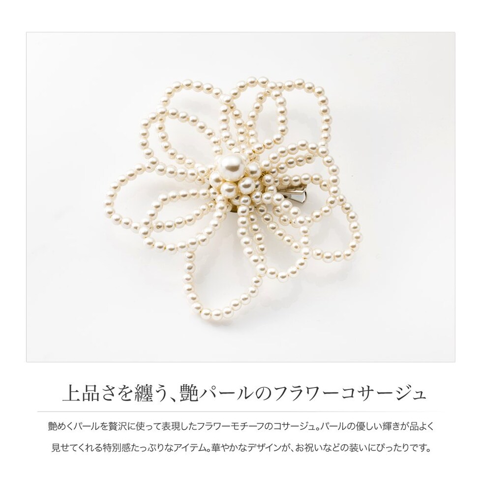 艶めくパールを贅沢に使って表現したフラワーモチーフのコサージュ。パールの優しい輝きが品よく見せてくれる特別感たっぷりなアイテム。華やかなデザインが、お祝いなどの装いにぴったりです。