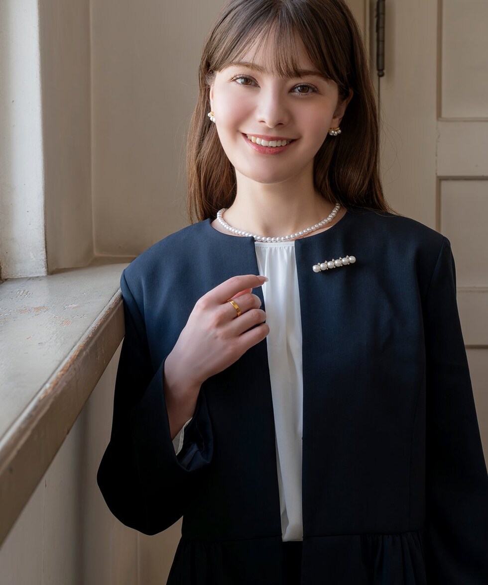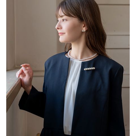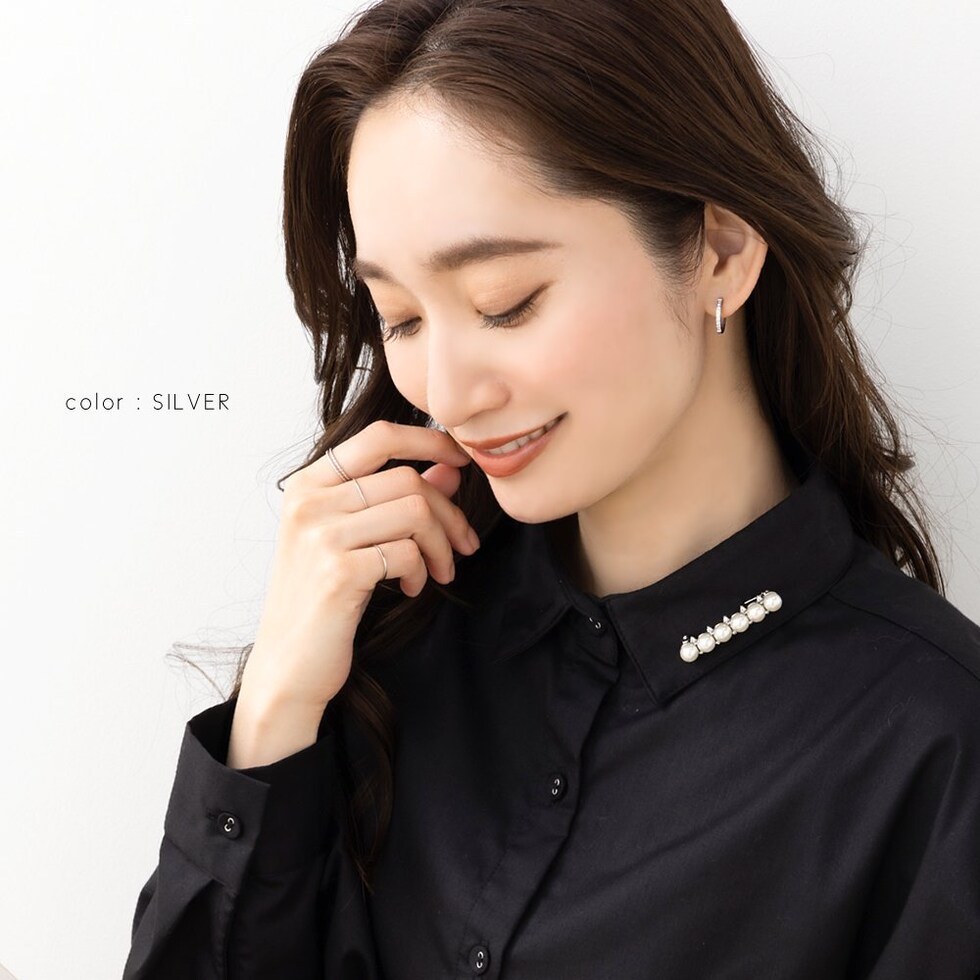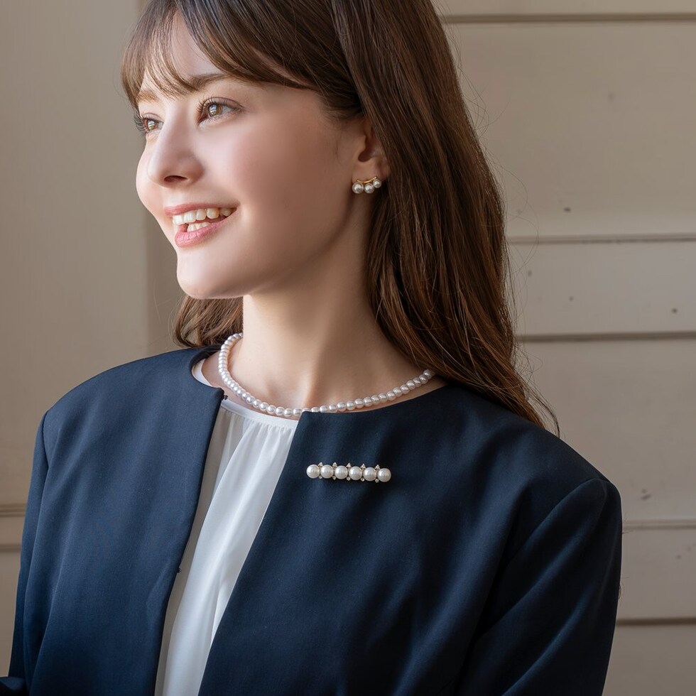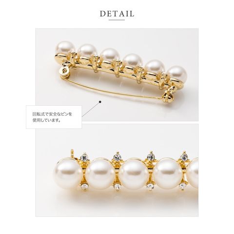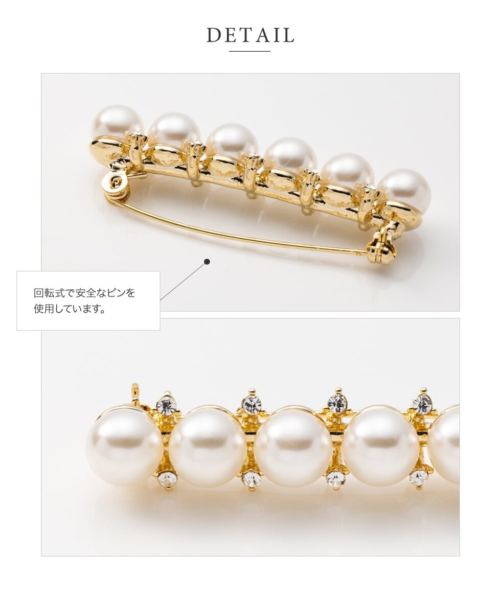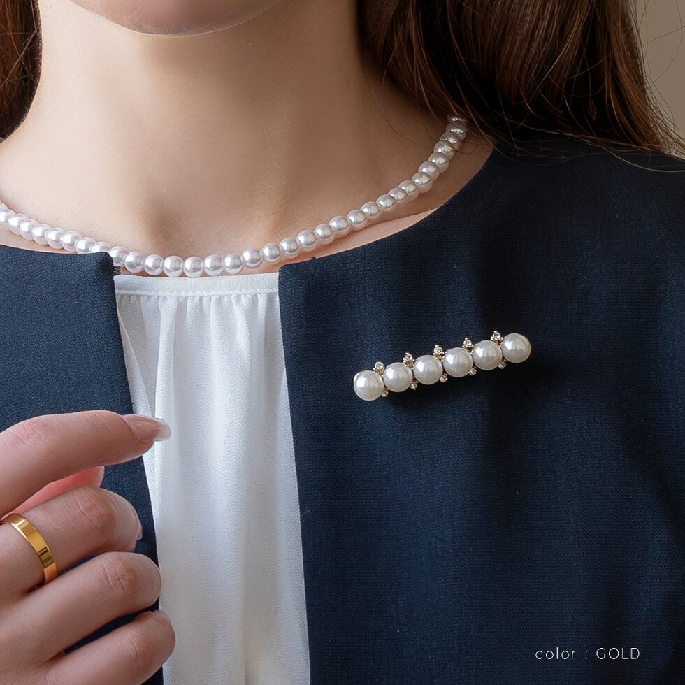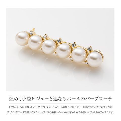 上品なパールが連なったバータイプのブローチ。パールの間を小粒ビジューが彩ります。シンプルで上品なデザインがコーデを品よくブラッシュアップ◎お祝いシーンなど華やかな日の装いにぴったりなアイテムです。