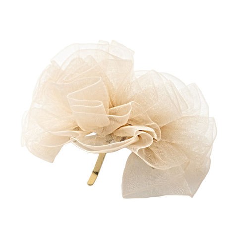 ランダムに重ねたオーガンジーフリルがフェミニンなポニーフック。透け感ある生地と上品なカラーが後ろ姿に程よい甘さをプラス。曲がる素材だから結び目に沿って角度を調節できて、即華やかな雰囲気に仕上がるひと品◎