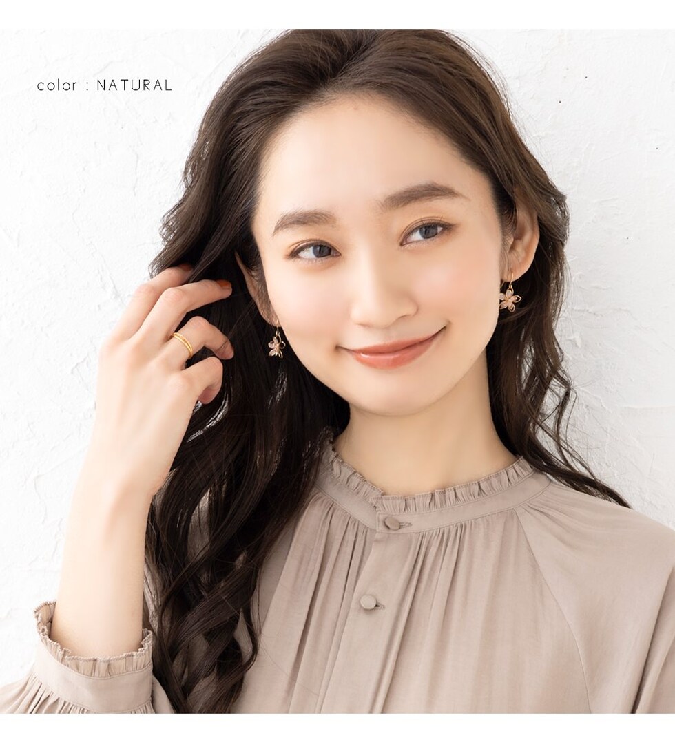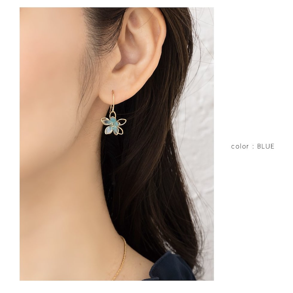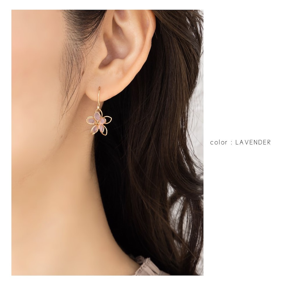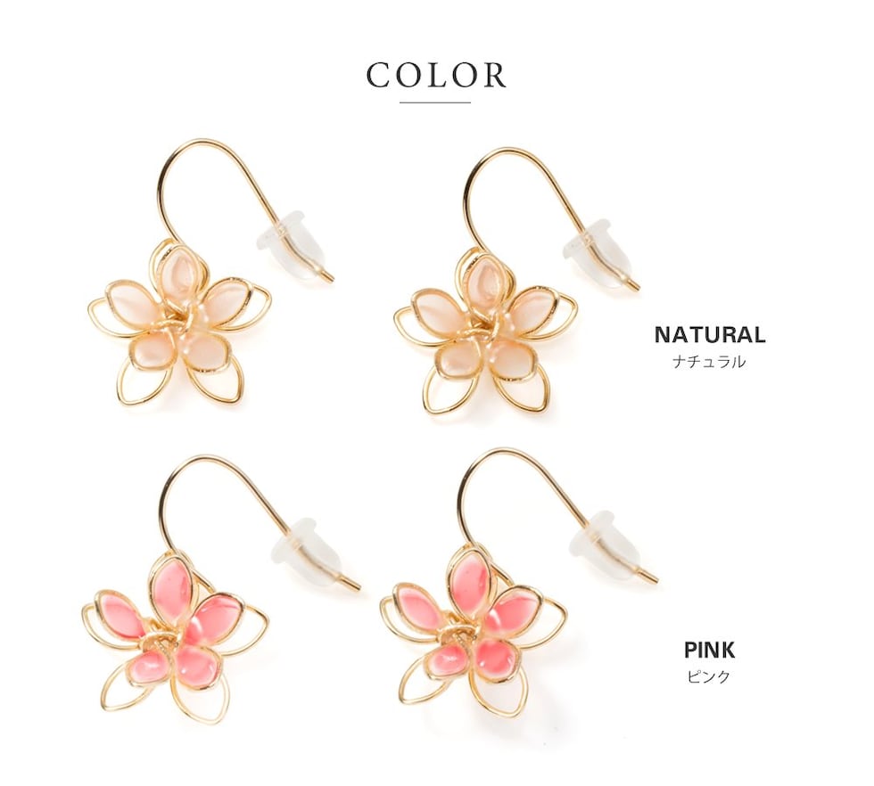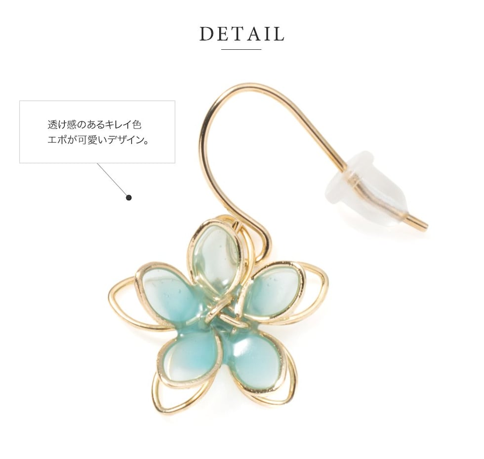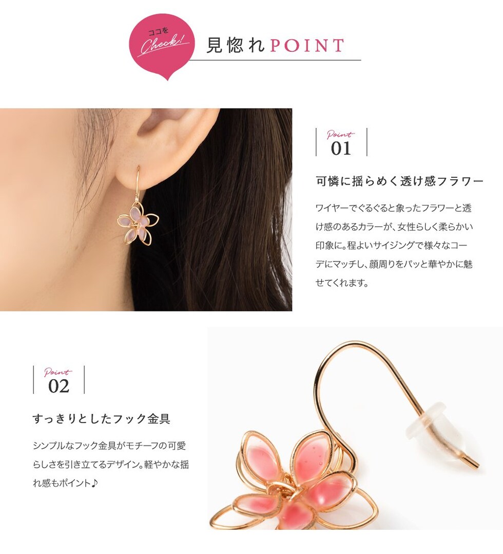 透け感のあるまろやかなカラーリングが大人可愛いフラワーピアス。立体感のあるワイヤーモチーフはどの角度から見ても可憐なデザイン。明るい色合いと揺れ感が気分を上げてくれるアイテムです。