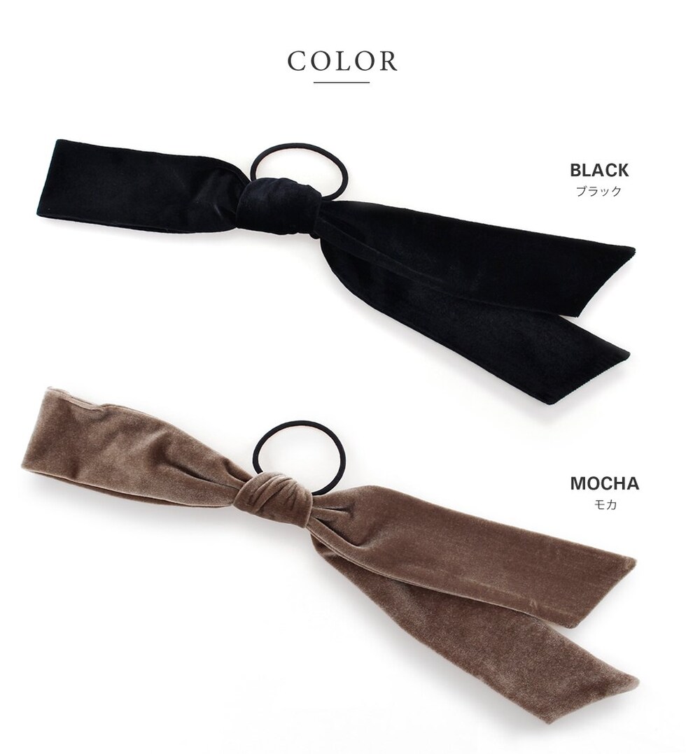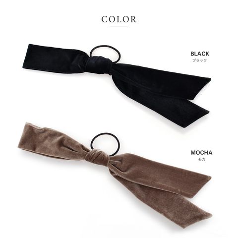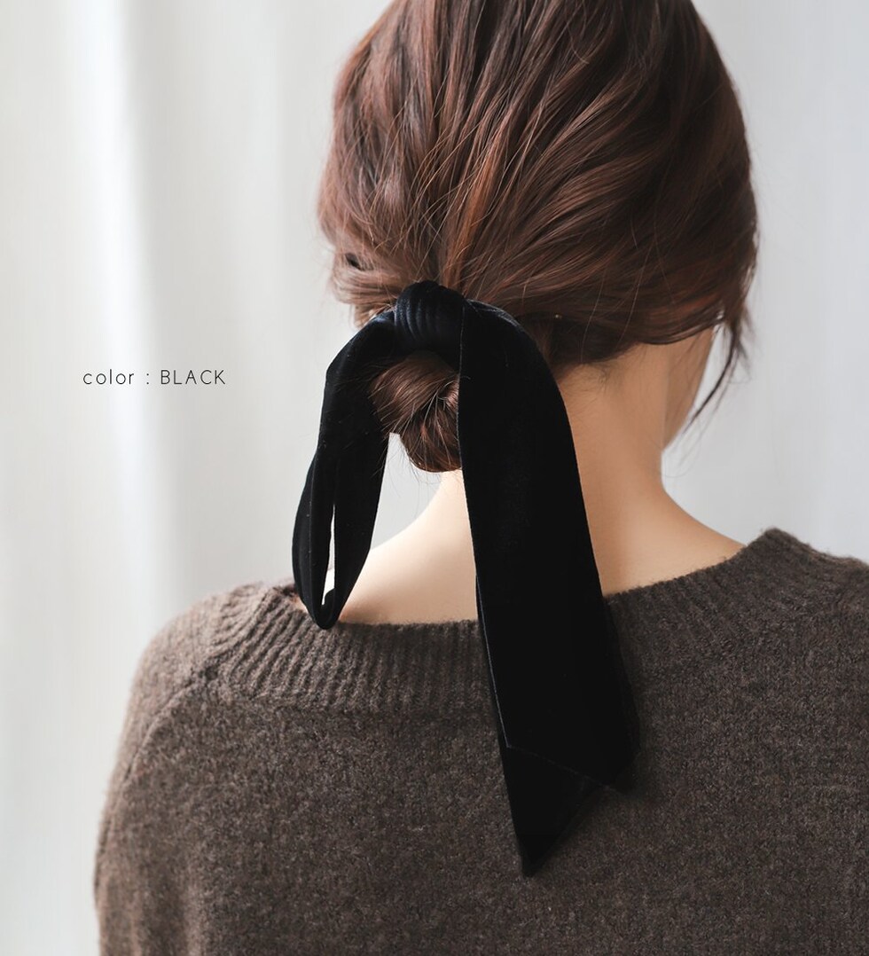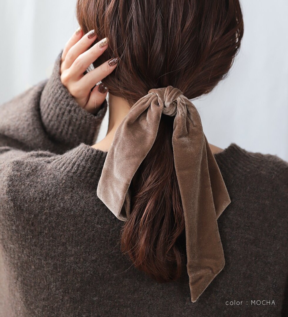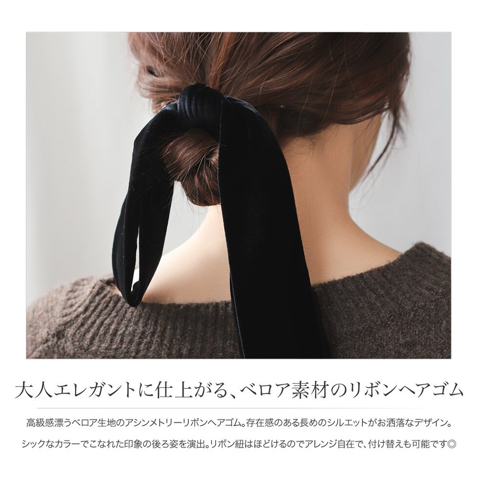 高級感漂うベロア生地のアシンメトリーリボンヘアゴム。存在感のある長めのシルエットがお洒落なデザイン。シックなカラーでこなれた印象の後ろ姿を演出。リボン紐はほどけるのでアレンジ自在で、付け替えも可能です◎