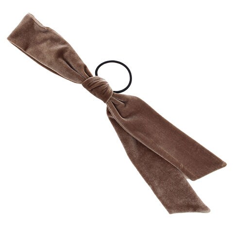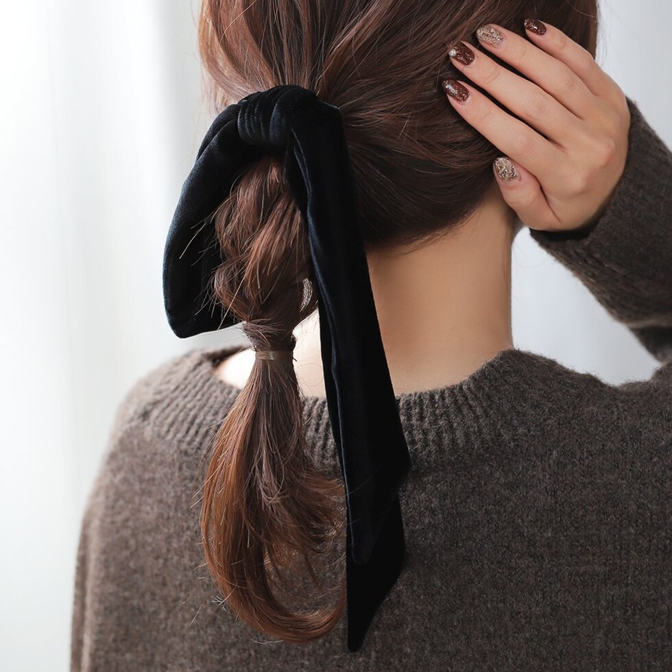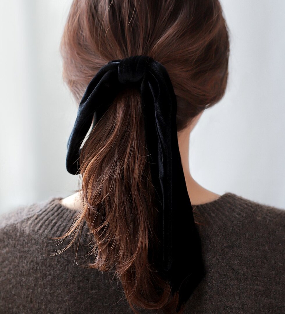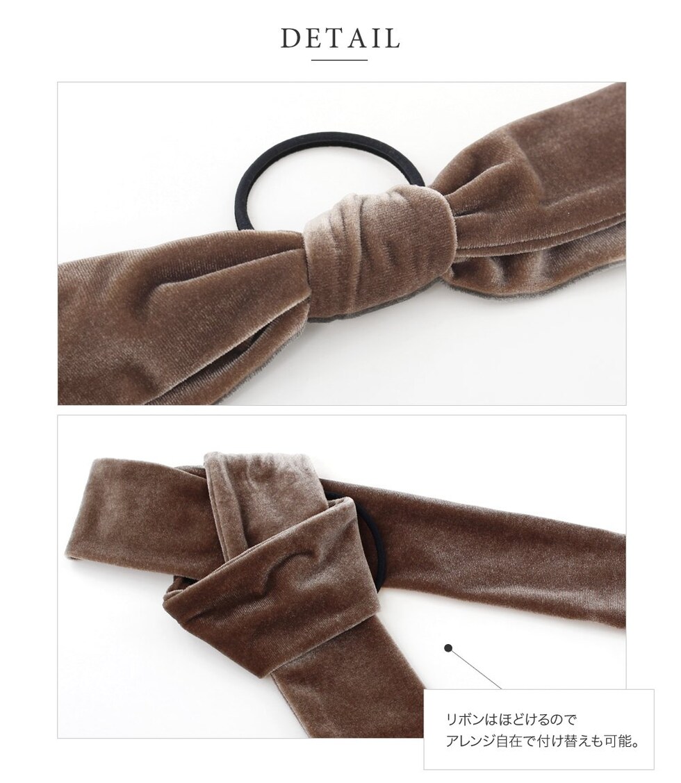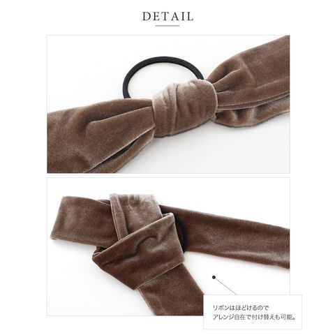 高級感漂うベロア生地のアシンメトリーリボンヘアゴム。存在感のある長めのシルエットがお洒落なデザイン。シックなカラーでこなれた印象の後ろ姿を演出。リボン紐はほどけるのでアレンジ自在で、付け替えも可能です◎