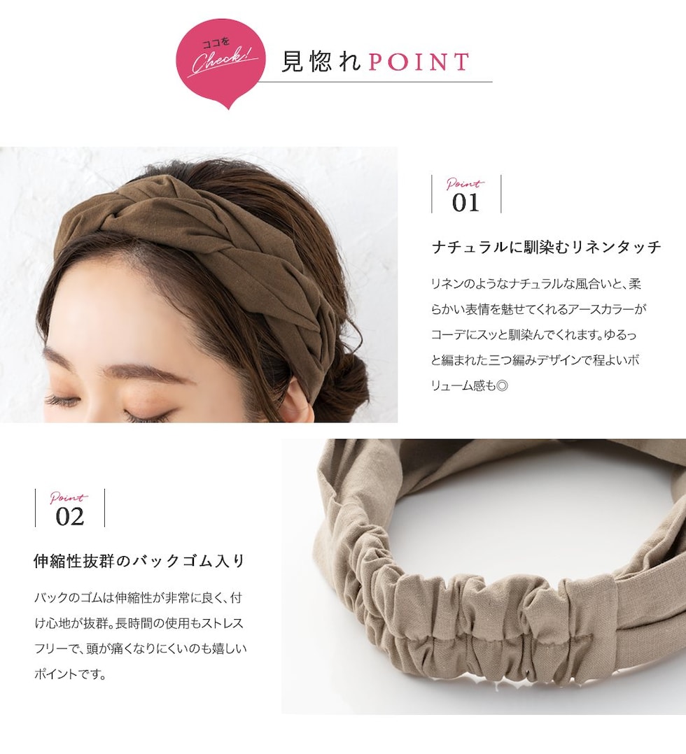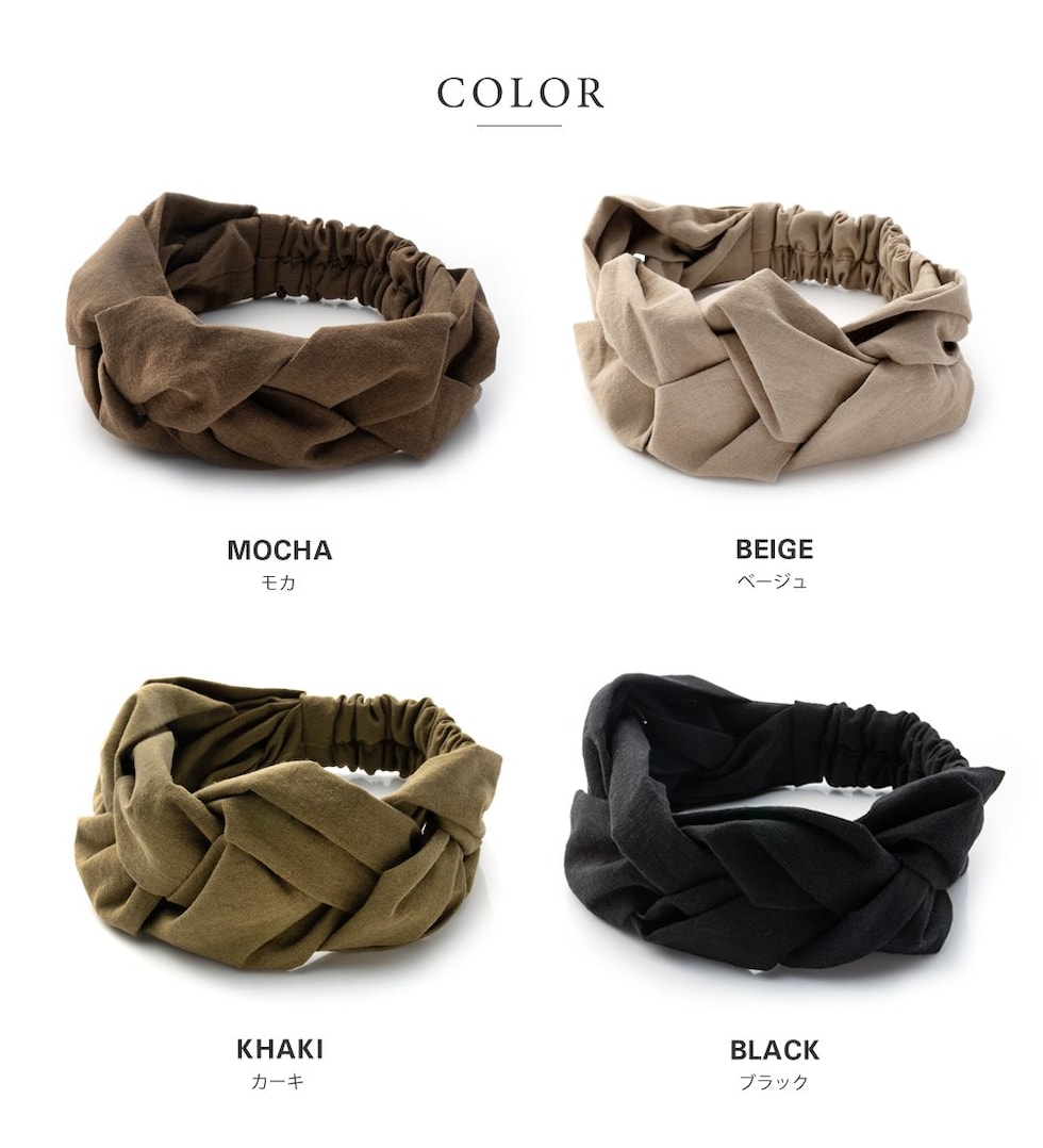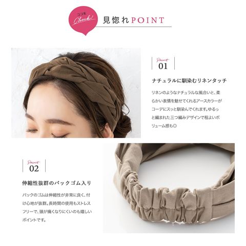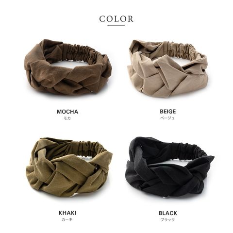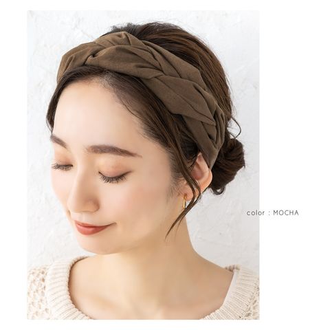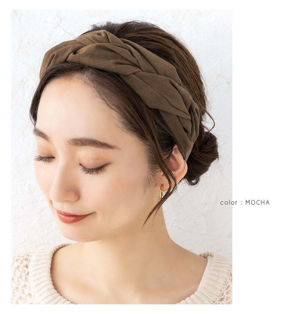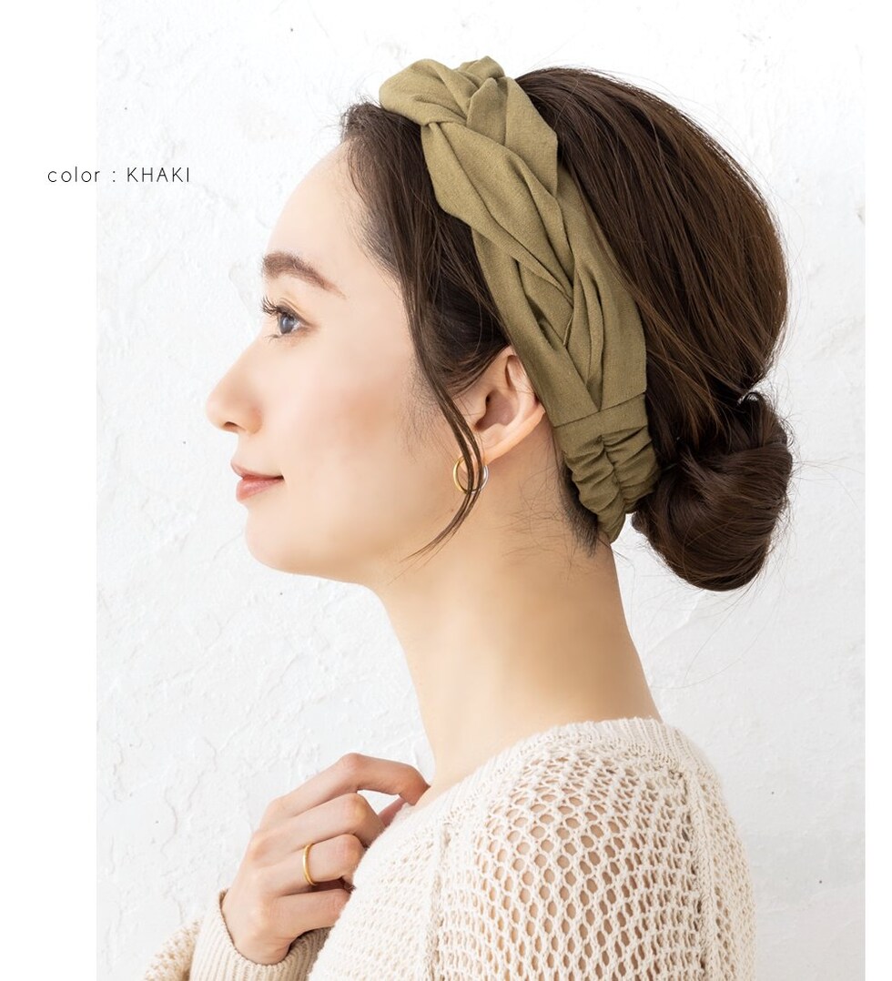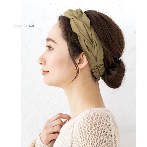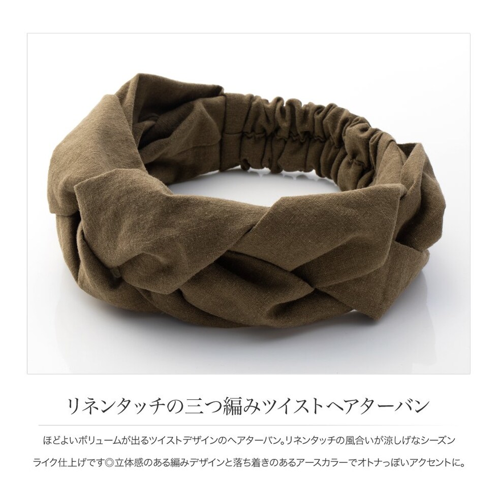 ほどよいボリュームが出るツイストデザインのヘアターバン。リネンタッチの風合いが涼しげなシーズンライク仕上げです◎立体感のある編みデザインと落ち着きのあるアースカラーでオトナっぽいアクセントに。