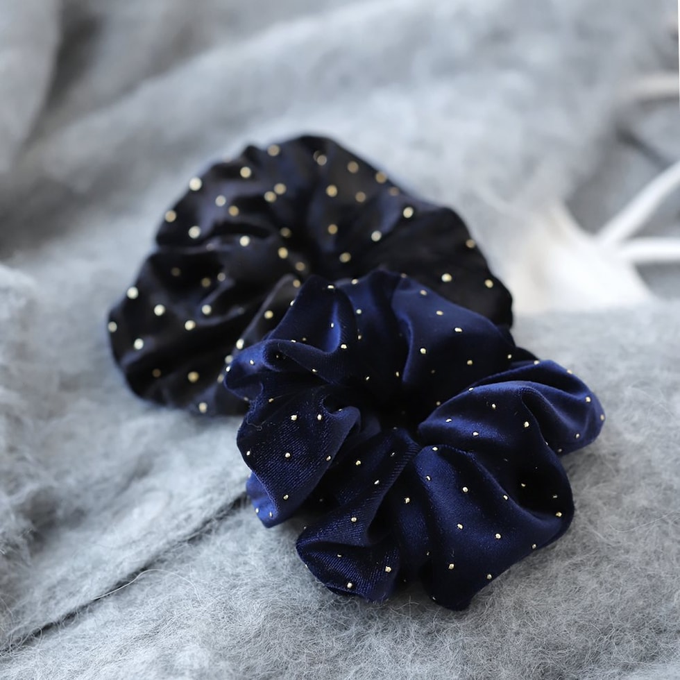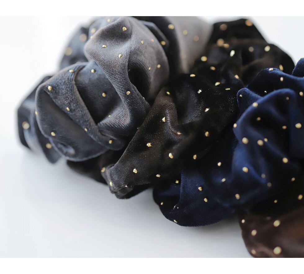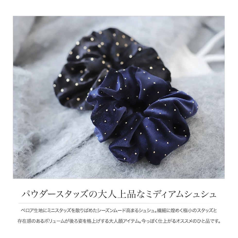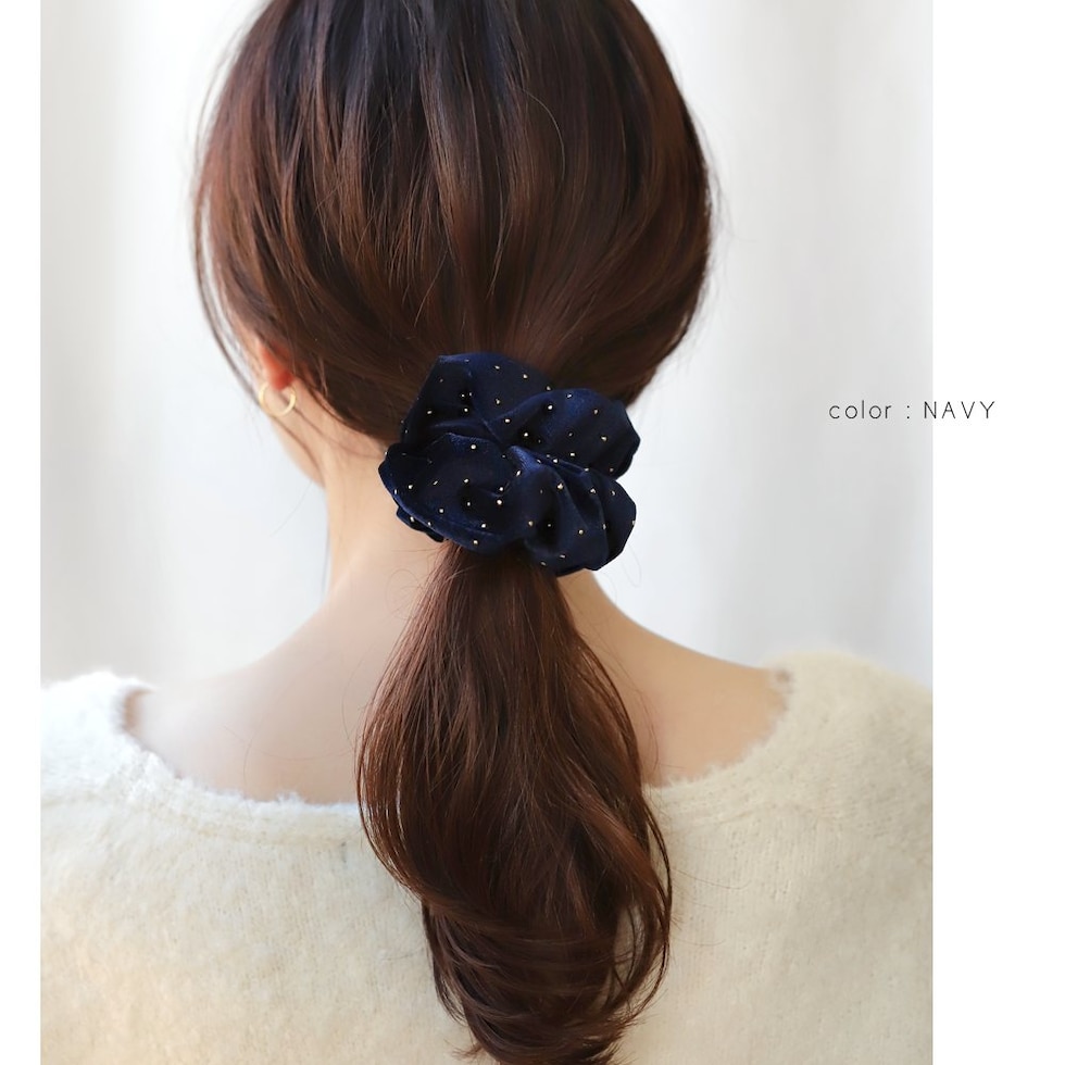 ヘアアクセサリー レディース シュシュ ヘアゴム ベロア ベルベット パウダースタッズ 水玉 ドット 光沢 髪留め まとめ髪 軽い ネイビー cream dot ゆうパケット [ブラック_ワンサイズ]