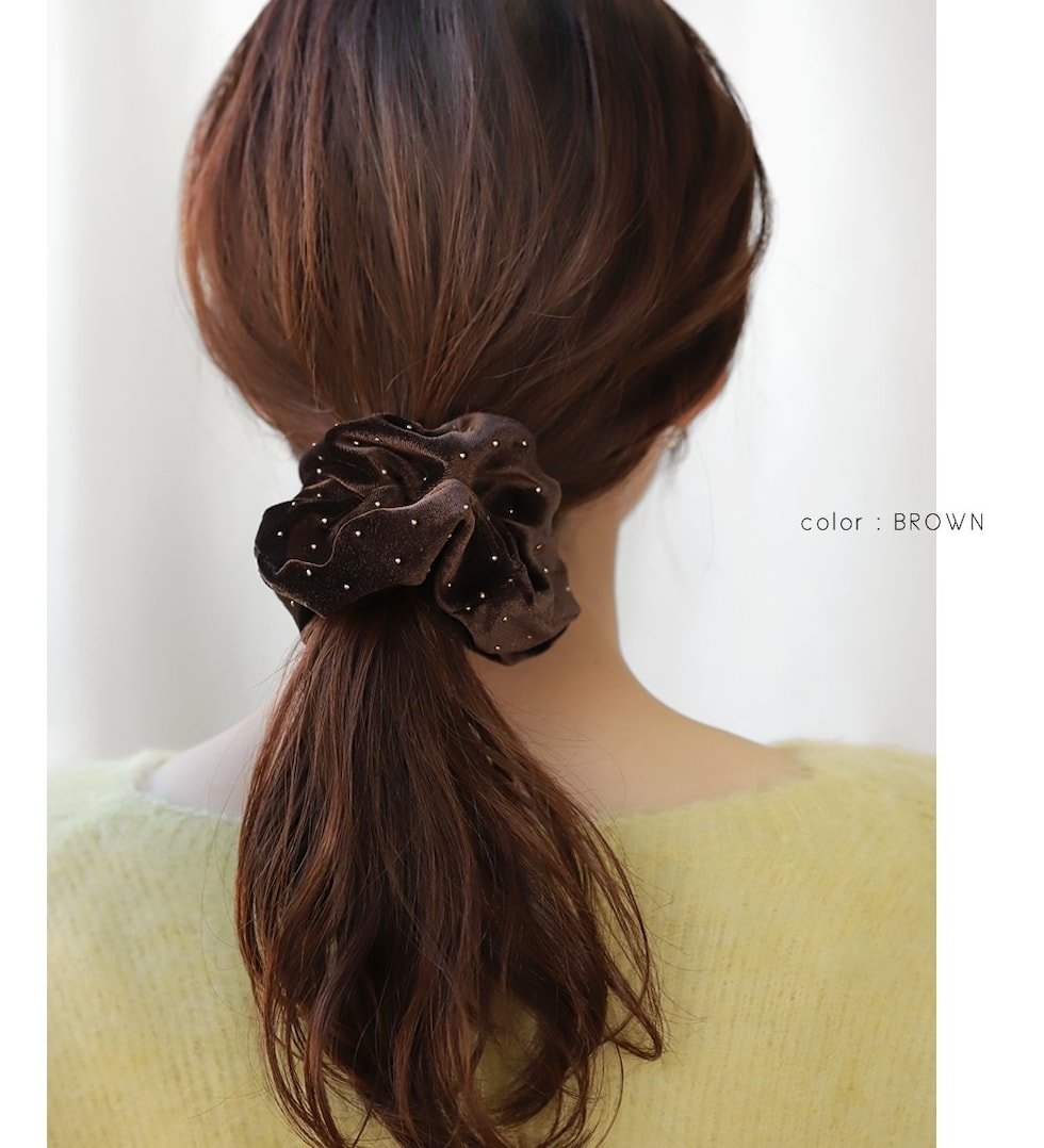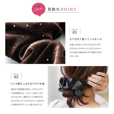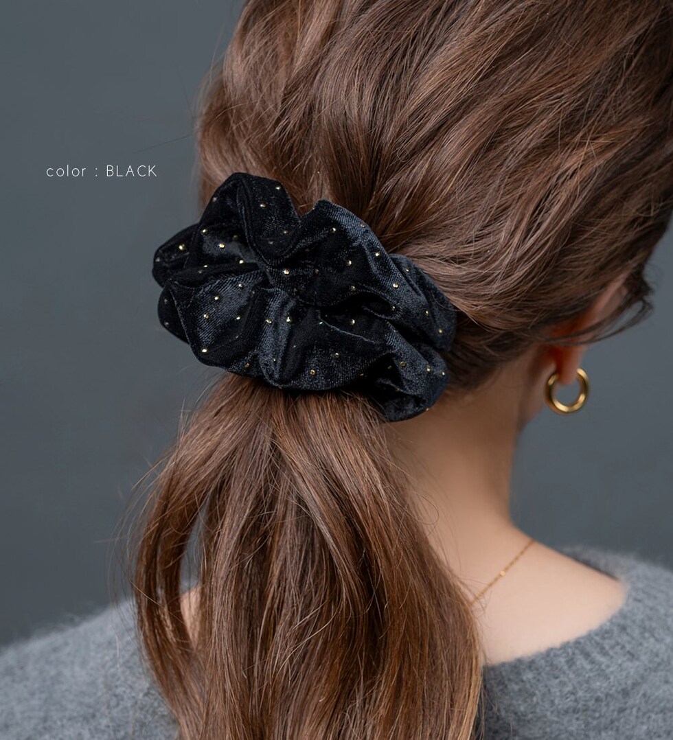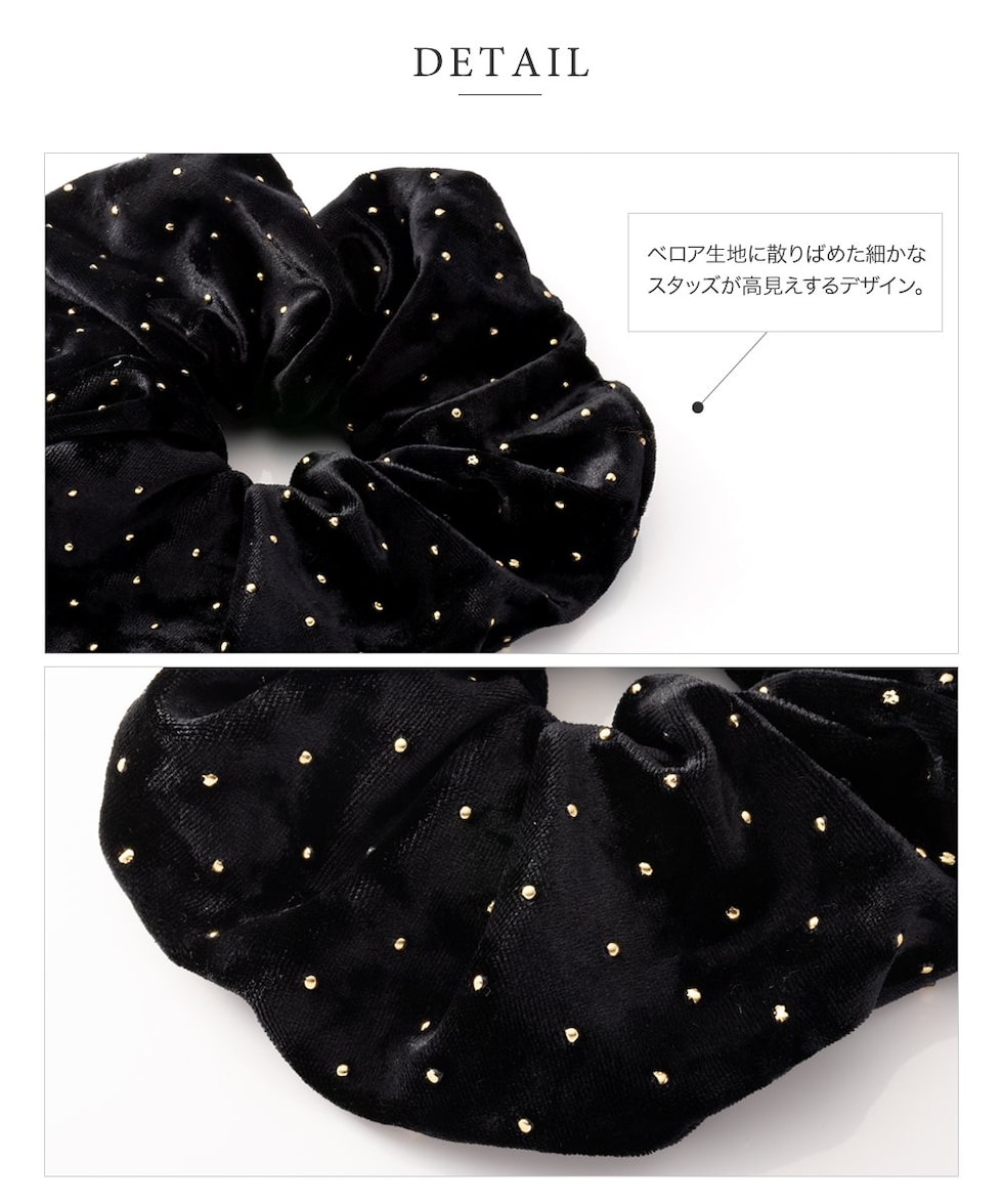 ベロア生地にミニスタッズを散りばめたシーズンムード高まるシュシュ。繊細に煌めく極小のスタッズと存在感のあるボリュームが後ろ姿を格上げする大人顔アイテム。今っぽく仕上がるオススメのひと品です。
