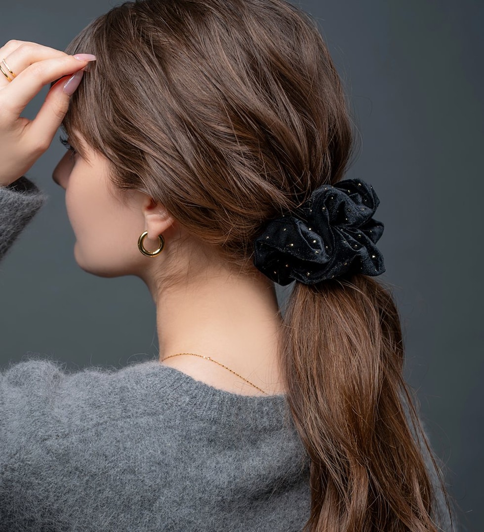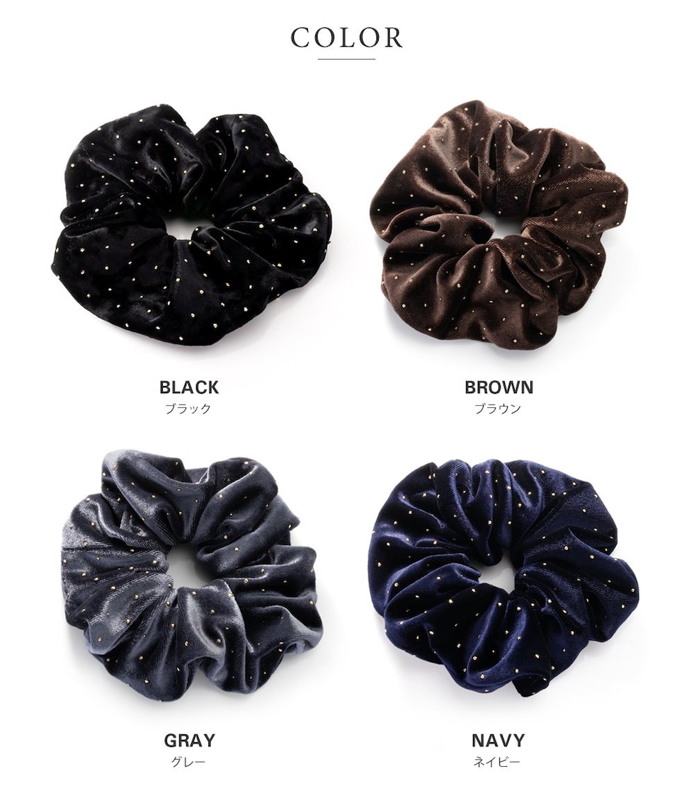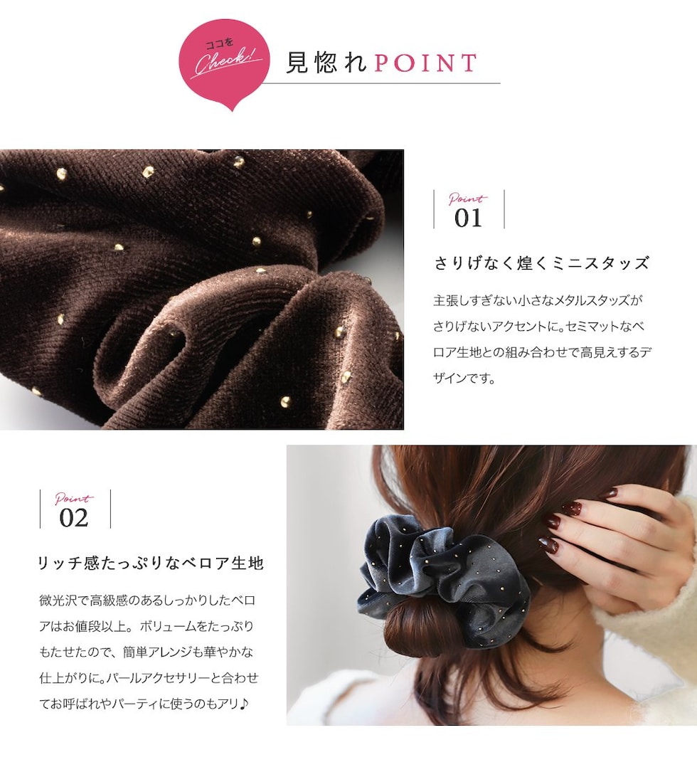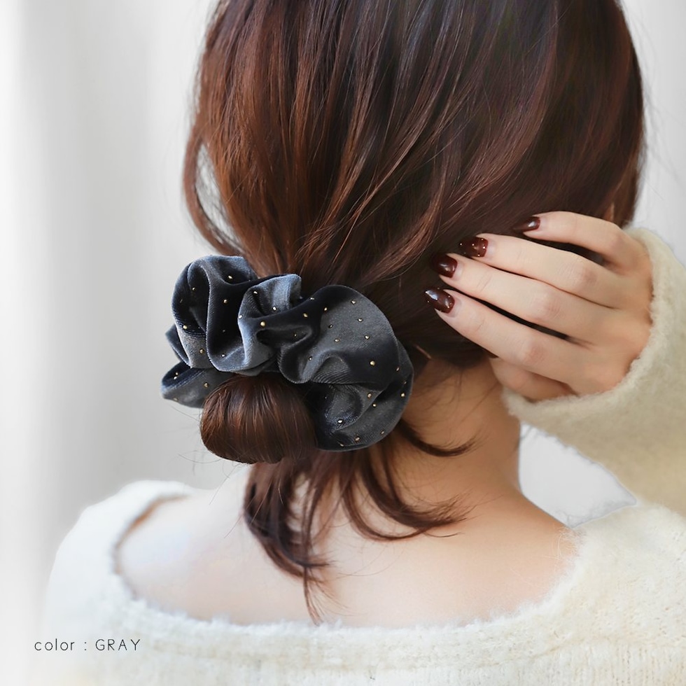 ベロア生地にミニスタッズを散りばめたシーズンムード高まるシュシュ。繊細に煌めく極小のスタッズと存在感のあるボリュームが後ろ姿を格上げする大人顔アイテム。今っぽく仕上がるオススメのひと品です。