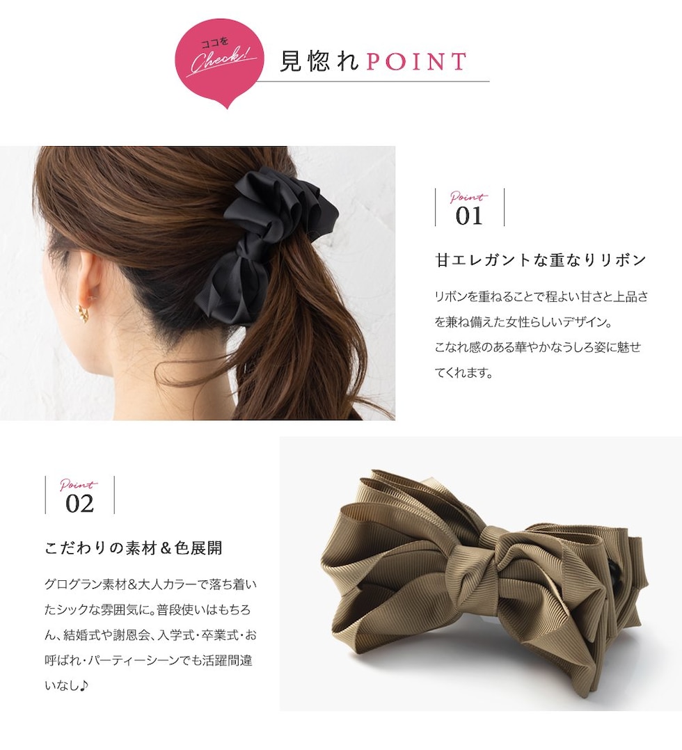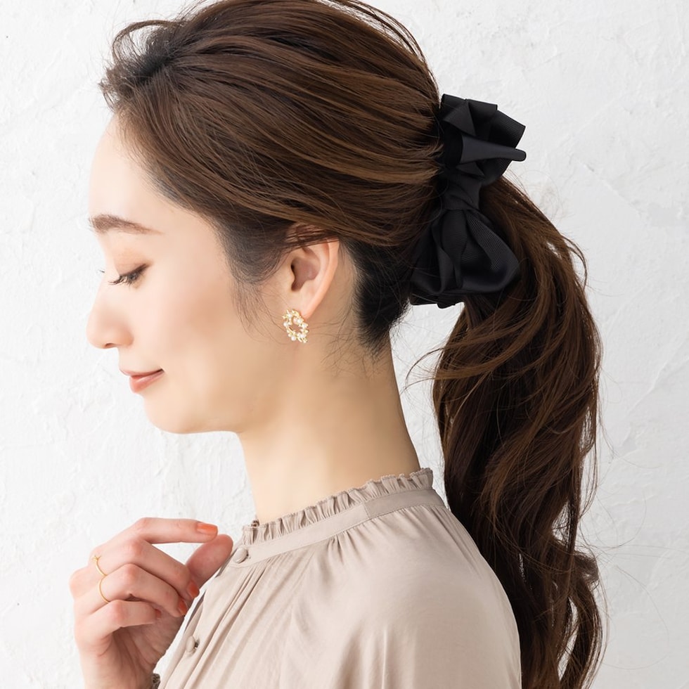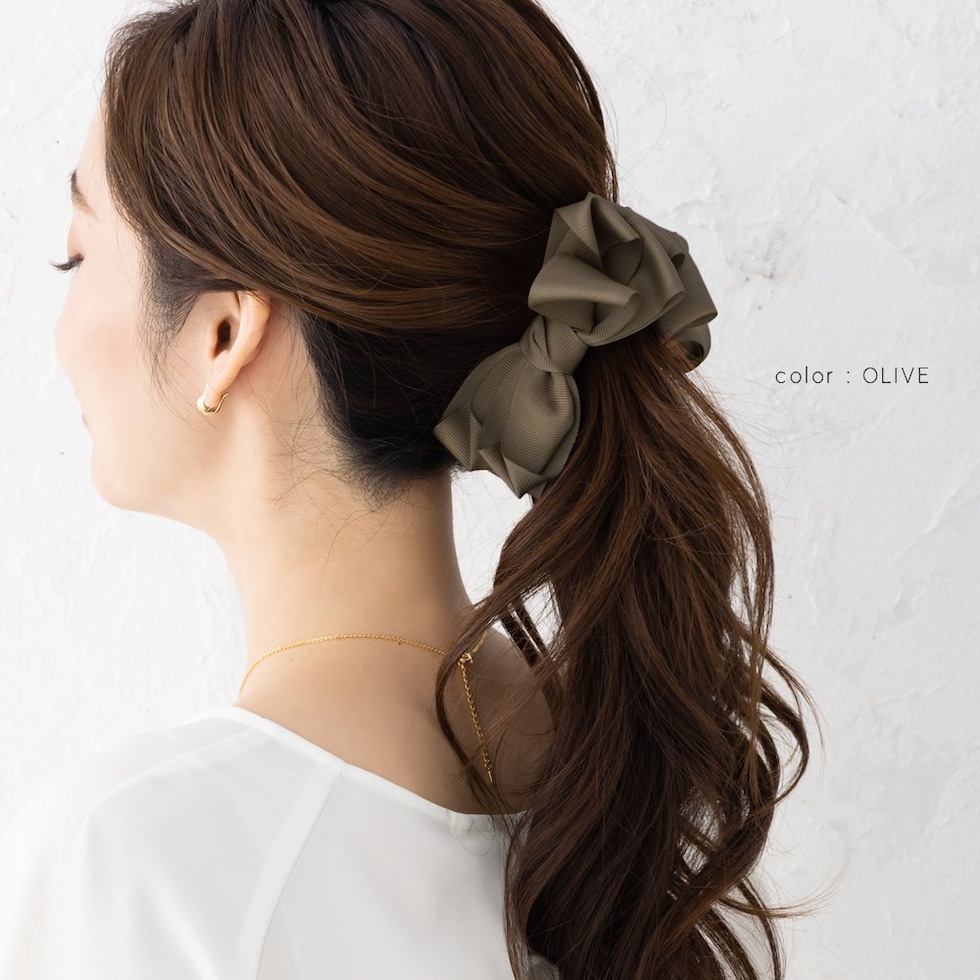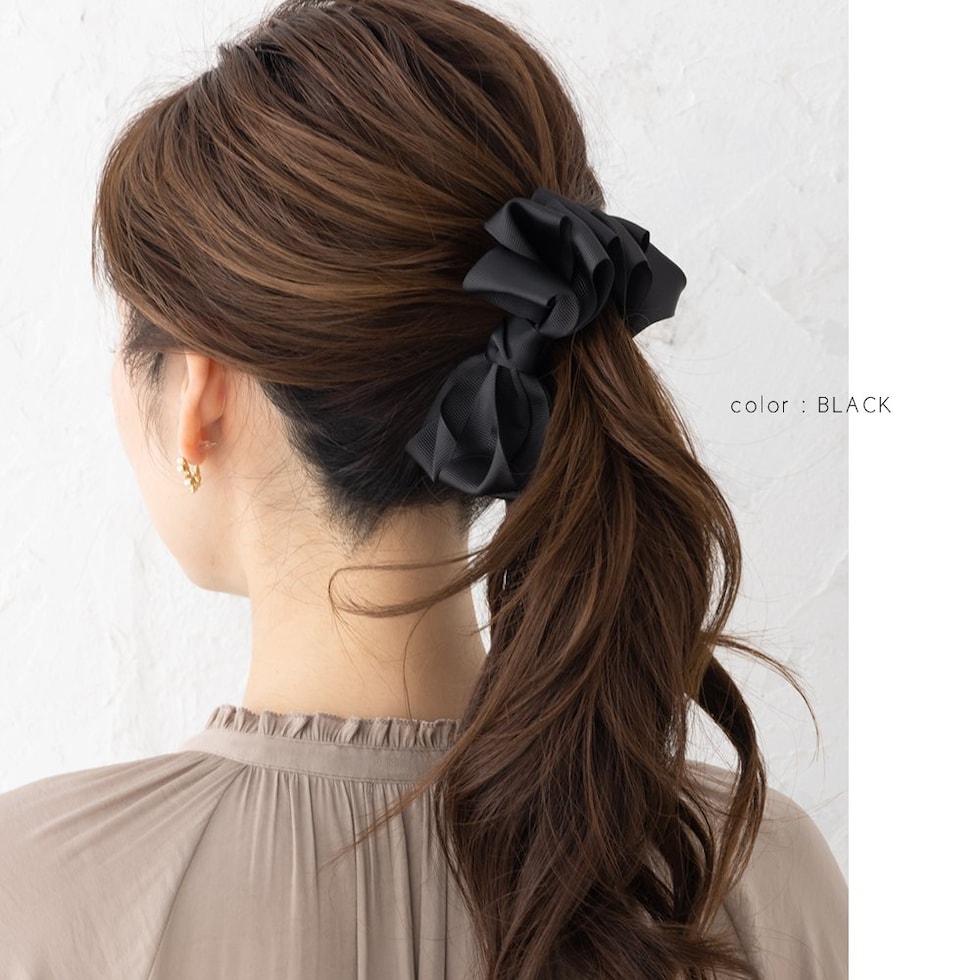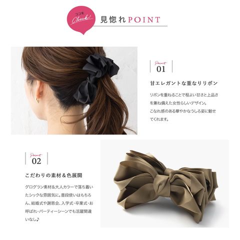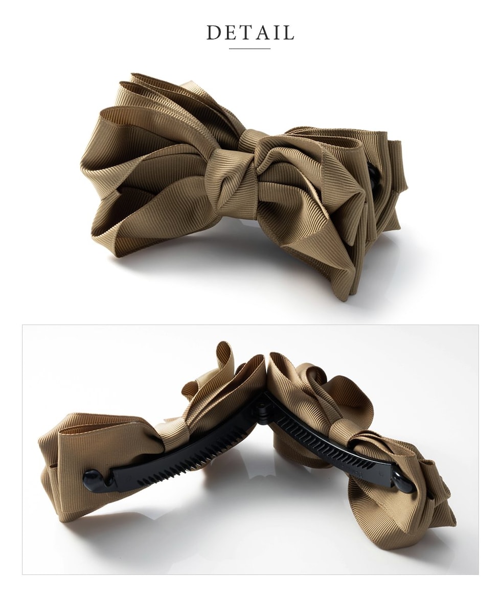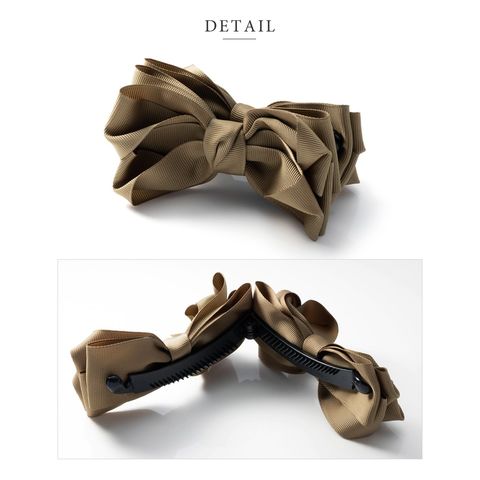 グログラン生地を重ねたリボンデザインのバナナクリップ。シックなカラーと程よいボリューム感が大人の女性にピッタリなアイテム◎さっと挟むだけで簡単に華やかな印象に仕上がるひと品です。