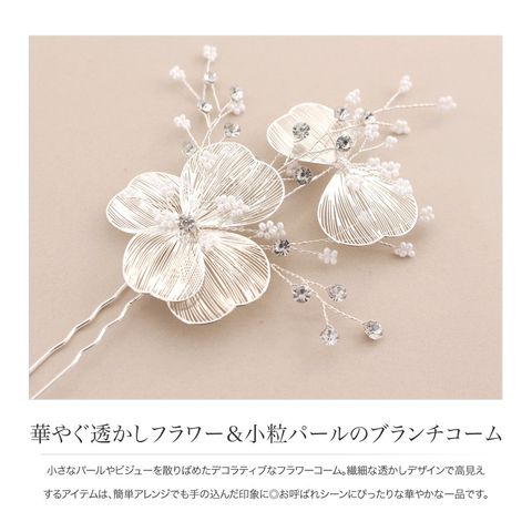 小さなパールやビジューを散りばめたデコラティブなフラワーコーム。繊細な透かしデザインで高見えするアイテムは、簡単アレンジでも手の込んだ印象に◎お呼ばれシーンにぴったりな華やかな一品です。
