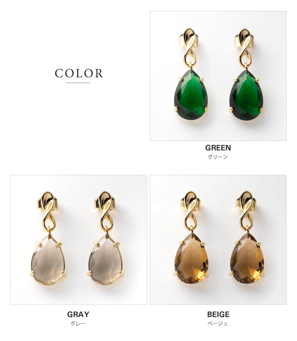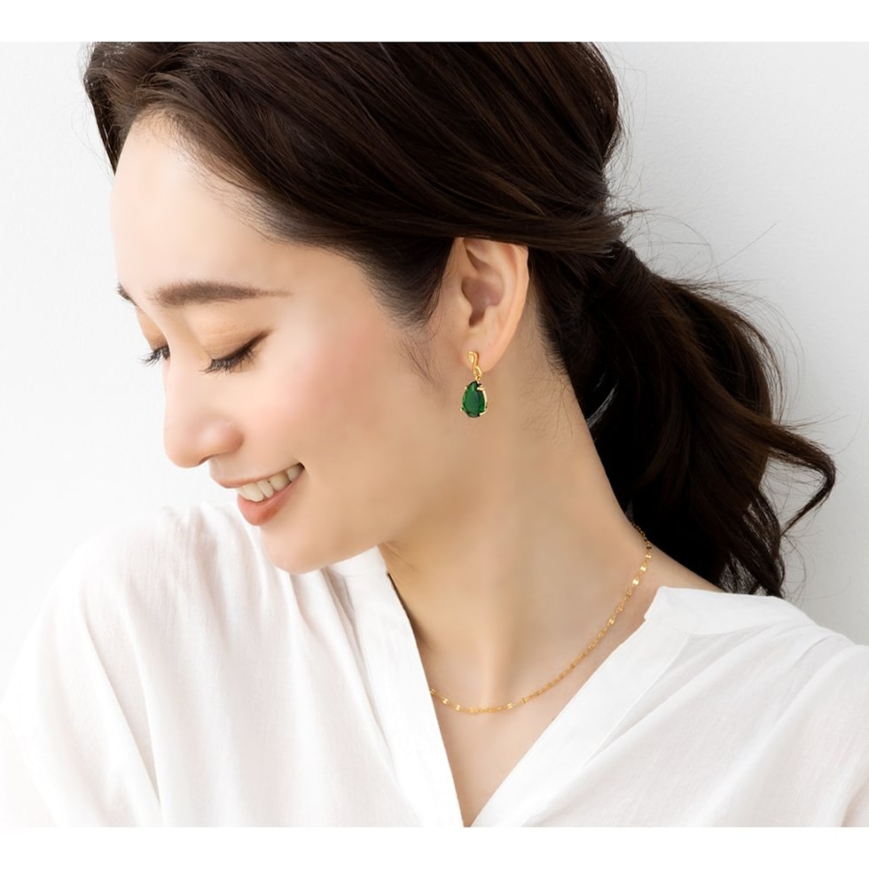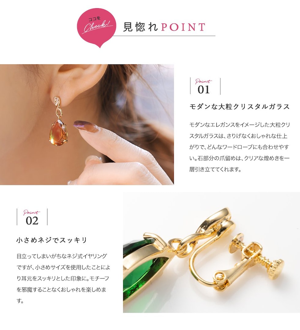 モダンなエレガンスをイメージした大粒クリスタルガラスは、さりげなくおしゃれな仕上がりで、どんなワードローブにも合わせやすい。石部分の爪留めは、クリアな煌めきを一層引き立ててくれます。