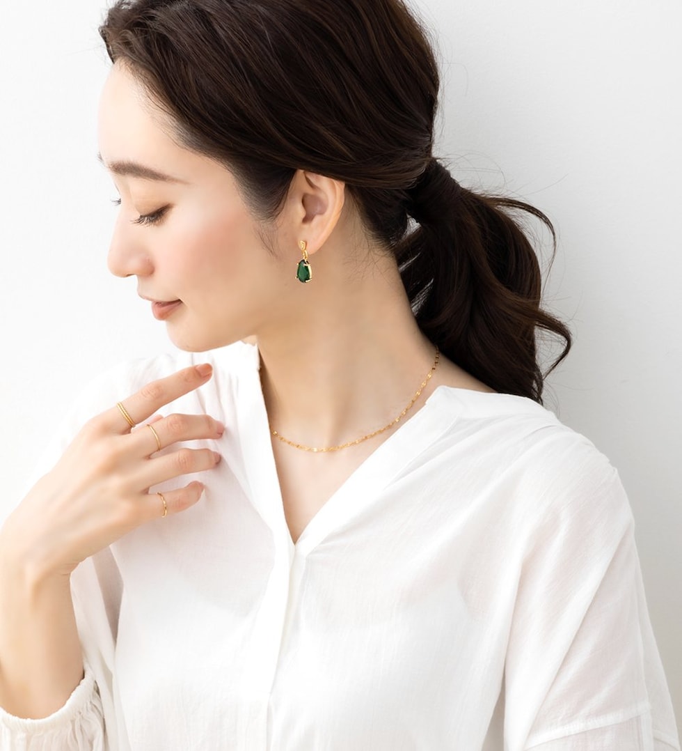 目立ってしまいがちなネジ式イヤリングですが、小さめサイズを使用したことにより耳元をスッキリとした印象に。モチーフを邪魔することなくおしゃれを楽しめます。